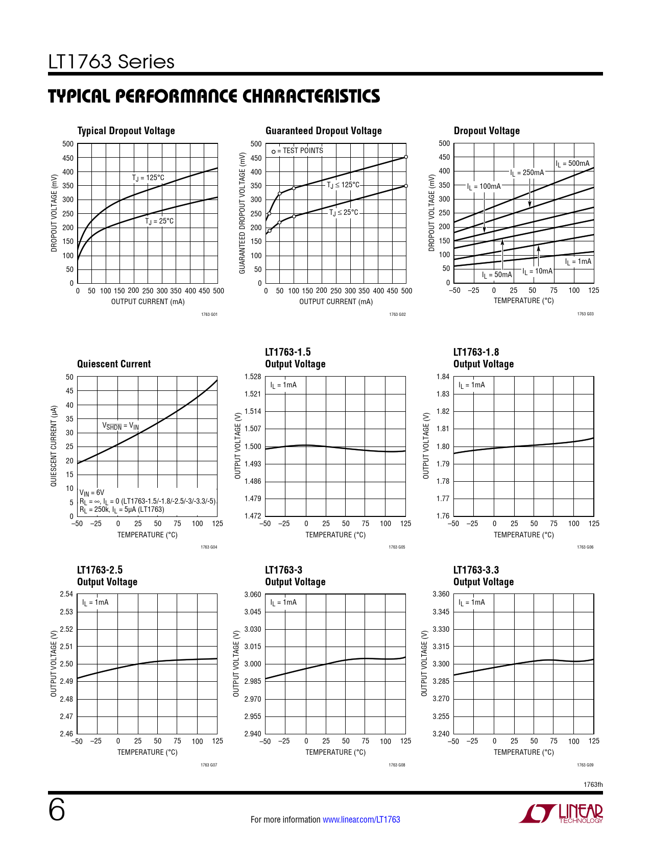 500 500 500 = TEST POINTS 450 450 450 IL = 500mA 400 400 400 I T L = 250mA J = 125°C 350 350 TJ ≤ 125°C 350 IL = 100mA 300 300 300 250 250 TJ ≤ 25°C 250 TJ = 25°C 200 200 200 150 150 150 DROPOUT VOLTAGE (mV) DROPOUT VOLTAGE (mV) 100 100 100 IL = 1mA 50 50 GUARANTEED DROPOUT VOLTAGE (mV) 50 IL = 10mA IL = 50mA 0 0 0 0 50 100 150 200 250 300 350 400 450 500 0 50 100 150 200 250 300 350 400 450 500 –50 –25 0 25 50 75 100 125 OUTPUT CURRENT (mA) OUTPUT CURRENT (mA) TEMPERATURE (°C) 1763 G01 1763 G02 1763 G03