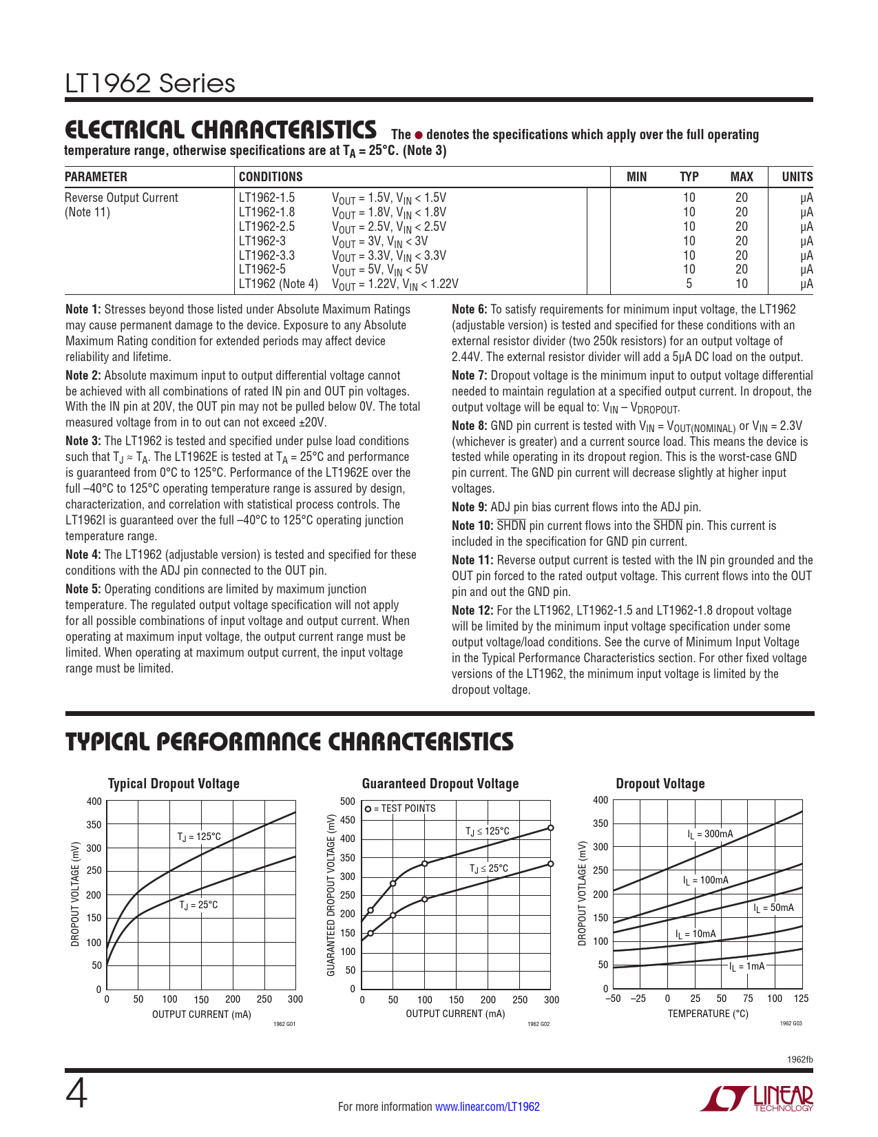 Reverse Output Current LT1962-1.5 VOUT = 1.5V, VIN < 1.5V 10 20 µA (Note 11) LT1962-1.8 VOUT = 1.8V, VIN < 1.8V 10 20 µA LT1962-2.5 VOUT = 2.5V, VIN < 2.5V 10 20 µA LT1962-3 VOUT = 3V, VIN < 3V 10 20 µA LT1962-3.3 VOUT = 3.3V, VIN < 3.3V 10 20 µA LT1962-5 VOUT = 5V, VIN < 5V 10 20 µA LT1962 (Note 4) VOUT = 1.22V, VIN < 1.22V 5 10 µA