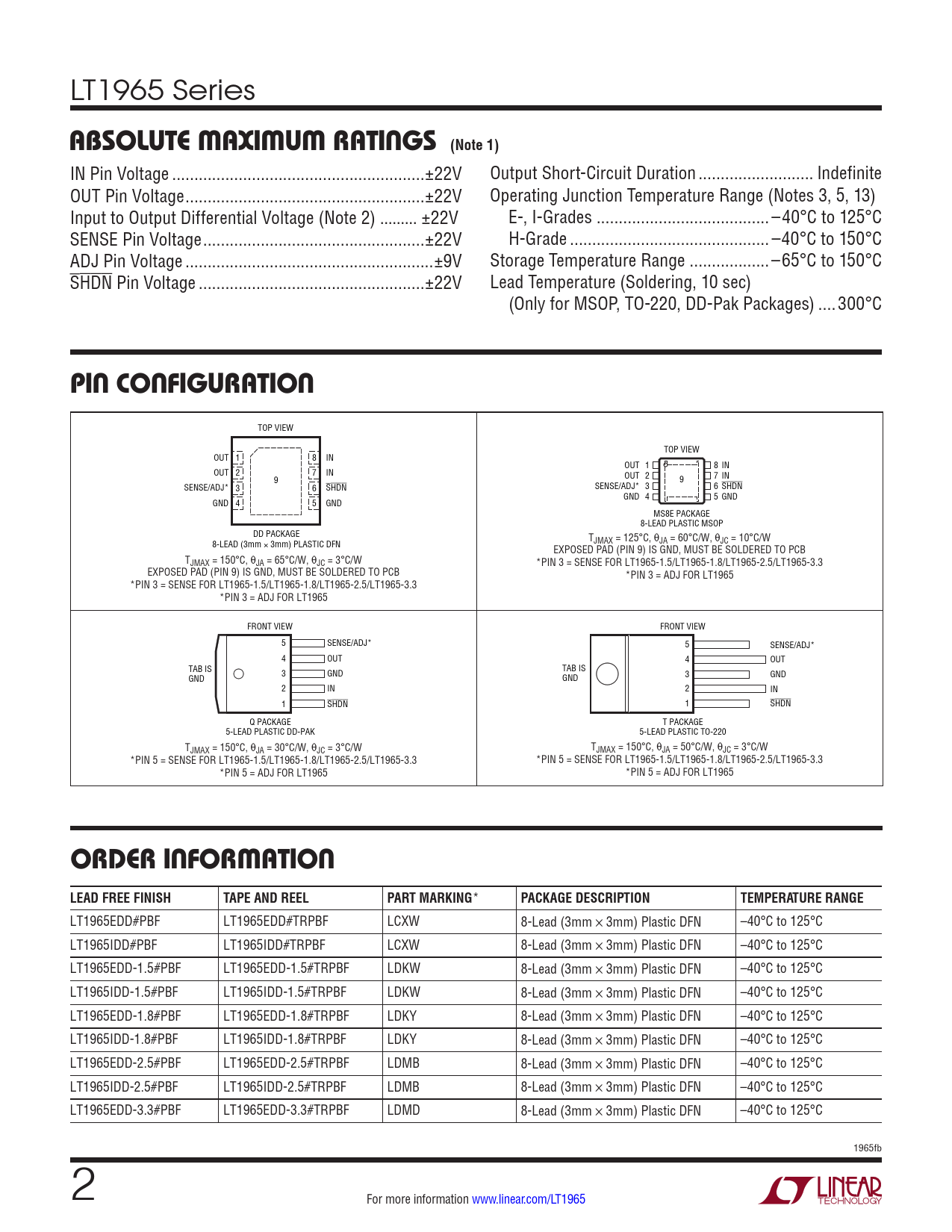 LT1965 Series absolute MaxiMuM ratings (Note 1) IN Pin Voltage ...±22V Output Short-Circuit Duration .. Indefinite OUT Pin Voltage ..±22V Operating Junction Temperature Range (Notes 3, 5, 13) Input to Output Differential Voltage (Note 2) ... ±22V E-, I-Grades ... –40°C to 125°C SENSE Pin Voltage ..±22V H-Grade ... –40°C to 150°C ADJ Pin Voltage ..±9V Storage Temperature Range ..–65°C to 150°C SHDN Pin Voltage ...±22V Lead Temperature (Soldering, 10 sec) (Only for MSOP, TO-220, DD-Pak Packages) ..300°C pin conFiguration TOP VIEW TOP VIEW OUT 1 8 IN OUT 1 8 IN OUT 2 7 IN 9 OUT 2 7 9 IN SENSE/ADJ* 3 6 SHDN SENSE/ADJ* 3 6 SHDN GND 4 5 GND GND 4 5 GND MS8E PACKAGE 8-LEAD PLASTIC MSOP DD PACKAGE T 8-LEAD (3mm × 3mm) PLASTIC DFN JMAX = 125°C, θJA = 60°C/W, θJC = 10°C/W EXPOSED PAD (PIN 9) IS GND, MUST BE SOLDERED TO PCB TJMAX = 150°C, θJA = 65°C/W, θJC = 3°C/W *PIN 3 = SENSE FOR LT1965-1.5/LT1965-1.8/LT1965-2.5/LT1965-3.3 EXPOSED PAD (PIN 9) IS GND, MUST BE SOLDERED TO PCB *PIN 3 = ADJ FOR LT1965 *PIN 3 = SENSE FOR LT1965-1.5/LT1965-1.8/LT1965-2.5/LT1965-3.3 *PIN 3 = ADJ FOR LT1965 FRONT VIEW FRONT VIEW 5 SENSE/ADJ* 5 SENSE/ADJ* 4 OUT 4 OUT TAB IS TAB IS 3 GND GND 3 GND GND 2 IN 2 IN 1 SHDN 1 SHDN Q PACKAGE T PACKAGE 5-LEAD PLASTIC DD-PAK 5-LEAD PLASTIC TO-220 TJMAX = 150°C, θJA = 30°C/W, θJC = 3°C/W TJMAX = 150°C, θJA = 50°C/W, θJC = 3°C/W *PIN 5 = SENSE FOR LT1965-1.5/LT1965-1.8/LT1965-2.5/LT1965-3.3 *PIN 5 = SENSE FOR LT1965-1.5/LT1965-1.8/LT1965-2.5/LT1965-3.3 *PIN 5 = ADJ FOR LT1965 *PIN 5 = ADJ FOR LT1965 orDer inForMation LEAD FREE FINISHTAPE AND REELPART MARKING * PACKAGE DESCRIPTIONTEMPERATURE RANGE LT1965EDD#PBF LT1965EDD#TRPBF LCXW 8-Lead (3mm × 3mm) Plastic DFN –40°C to 125°C LT1965IDD#PBF LT1965IDD#TRPBF LCXW 8-Lead (3mm × 3mm) Plastic DFN –40°C to 125°C LT1965EDD-1.5#PBF LT1965EDD-1.5#TRPBF LDKW 8-Lead (3mm × 3mm) Plastic DFN –40°C to 125°C LT1965IDD-1.5#PBF LT1965IDD-1.5#TRPBF LDKW 8-Lead (3mm × 3mm) Plastic DFN –40°C to 125°C LT1965EDD-1.8#PBF LT1965EDD-1.8#TRPBF LDKY 8-Lead (3mm × 3mm) Plastic DFN –40°C to 125°C LT1965IDD-1.8#PBF LT1965IDD-1.8#TRPBF LDKY 8-Lead (3mm × 3mm) Plastic DFN –40°C to 125°C LT1965EDD-2.5#PBF LT1965EDD-2.5#TRPBF LDMB 8-Lead (3mm × 3mm) Plastic DFN –40°C to 125°C LT1965IDD-2.5#PBF LT1965IDD-2.5#TRPBF LDMB 8-Lead (3mm × 3mm) Plastic DFN –40°C to 125°C LT1965EDD-3.3#PBF LT1965EDD-3.3#TRPBF LDMD 8-Lead (3mm × 3mm) Plastic DFN –40°C to 125°C 1965fb 2 For more information www.linear.com/LT1965 Document Outline Features Description Applications Typical Application Absolute Maximum Ratings Pin Configuration Order Information Electrical Characteristics Typical Performance Characteristics Pin Functions Applications Information Typical Applications Package Description Revision History Related Parts
