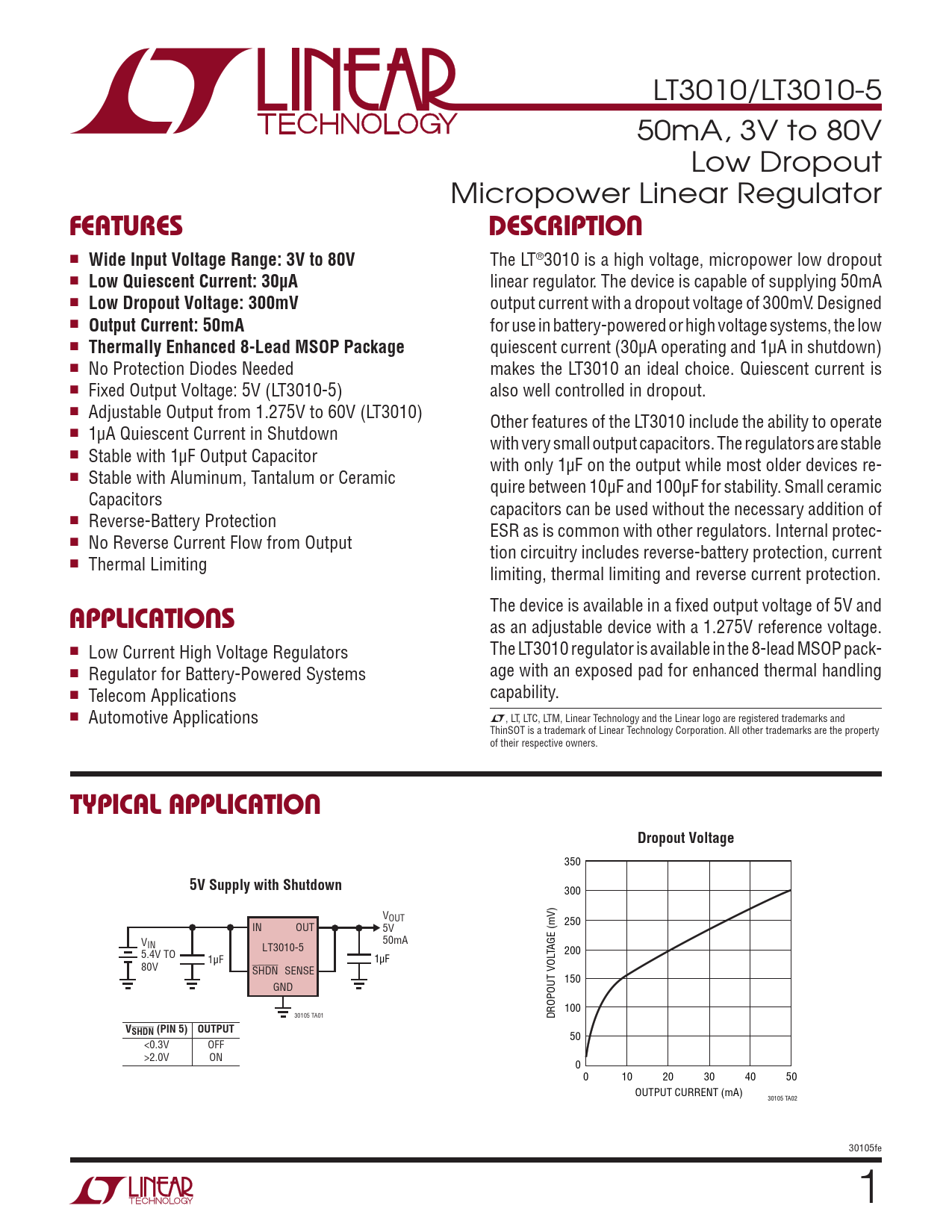 LT3010/LT3010-5 50mA, 3V to 80V Low Dropout Micropower Linear Regulator FEATURESDESCRIPTION n Wide Input Voltage Range: 3V to 80V The LT®3010 is a high voltage, micropower low dropout n Low Quiescent Current: 30µA linear regulator. The device is capable of supplying 50mA n Low Dropout Voltage: 300mV output current with a dropout voltage of 300mV. Designed n Output Current: 50mA for use in battery-powered or high voltage systems, the low n Thermally Enhanced 8-Lead MSOP Package quiescent current (30µA operating and 1µA in shutdown) n No Protection Diodes Needed makes the LT3010 an ideal choice. Quiescent current is n Fixed Output Voltage: 5V (LT3010-5) also well controlled in dropout. n Adjustable Output from 1.275V to 60V (LT3010) Other features of the LT3010 include the ability to operate n 1µA Quiescent Current in Shutdown with very smal output capacitors. The regulators are stable n Stable with 1µF Output Capacitor with only 1µF on the output while most older devices re- n Stable with Aluminum, Tantalum or Ceramic quire between 10µF and 100µF for stability. Small ceramic Capacitors capacitors can be used without the necessary addition of n Reverse-Battery Protection ESR as is common with other regulators. Internal protec- n No Reverse Current Flow from Output tion circuitry includes reverse-battery protection, current n Thermal Limiting limiting, thermal limiting and reverse current protection. APPLICATIONS The device is available in a fixed output voltage of 5V and as an adjustable device with a 1.275V reference voltage. n Low Current High Voltage Regulators The LT3010 regulator is available in the 8-lead MSOP pack- n Regulator for Battery-Powered Systems age with an exposed pad for enhanced thermal handling n Telecom Applications capability. n Automotive Applications L, LT, LTC, LTM, Linear Technology and the Linear logo are registered trademarks and ThinSOT is a trademark of Linear Technology Corporation. All other trademarks are the property of their respective owners. TYPICAL APPLICATIONDropout Voltage 350 5V Supply with Shutdown 300 VOUT IN OUT 250 5V VIN 50mA LT3010-5 5.4V TO TAGE (mV) 200 1µF 1µF 80V SHDN SENSE 150 GND 100 30105 TA01 DROPOUT VOL VSHDN (PIN 5) OUTPUT 50 <0.3V OFF >2.0V ON 0 0 10 20 30 40 50 OUTPUT CURRENT (mA) 30105 TA02 30105fe 1 Document Outline Features Applications Description Typical Application Absolute Maximum Ratings Pin Configuration Order Information Electrical Characteristics Typical Performance Characteristics Pin Functions Applications Information Typical Applications Package Description Revision History Typical Application Related Parts