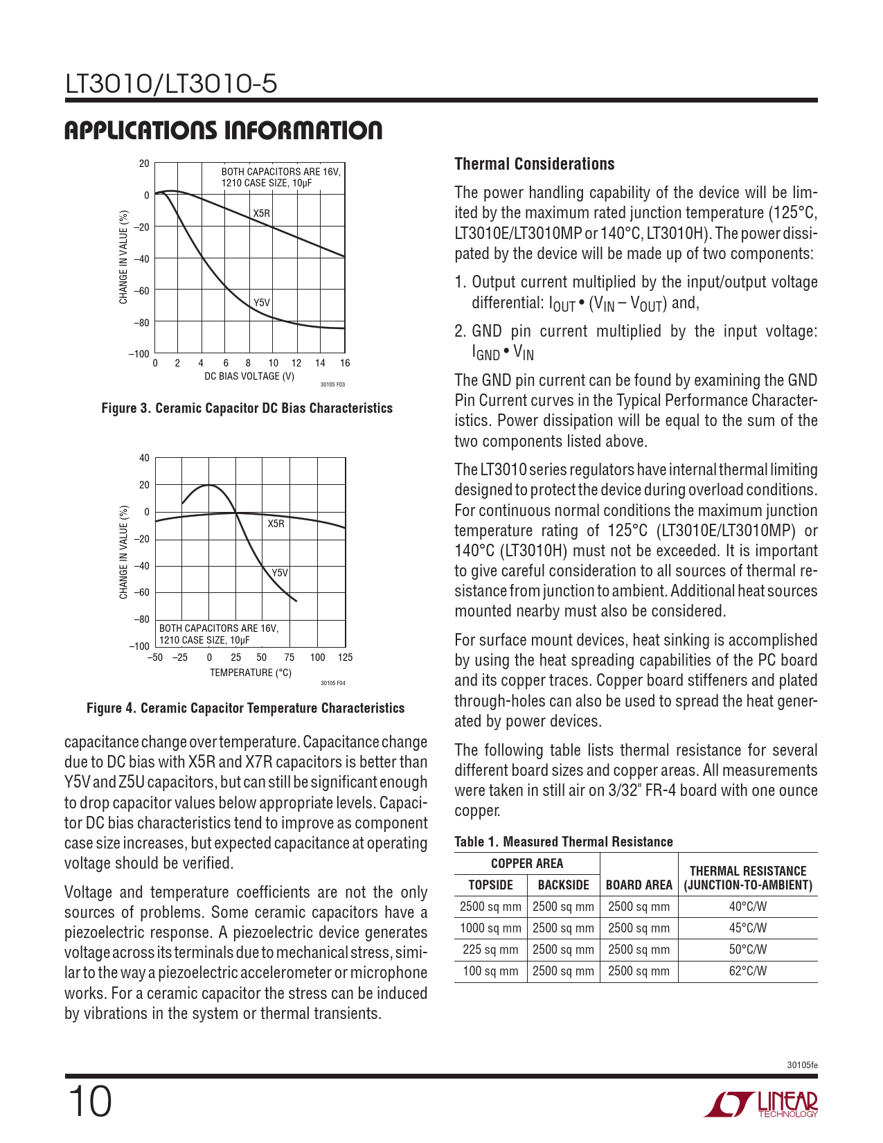 sources of problems. Some ceramic capacitors have a 2500 sq mm 2500 sq mm 2500 sq mm 40°C/W piezoelectric response. A piezoelectric device generates 1000 sq mm 2500 sq mm 2500 sq mm 45°C/W voltage across its terminals due to mechanical stress, simi- 225 sq mm 2500 sq mm 2500 sq mm 50°C/W lar to the way a piezoelectric accelerometer or microphone 100 sq mm 2500 sq mm 2500 sq mm 62°C/W works. For a ceramic capacitor the stress can be induced by vibrations in the system or thermal transients. 30105fe 10 Document Outline Features Applications Description Typical Application Absolute Maximum Ratings Pin Configuration Order Information Electrical Characteristics Typical Performance Characteristics Pin Functions Applications Information Typical Applications Package Description Revision History Typical Application Related Parts