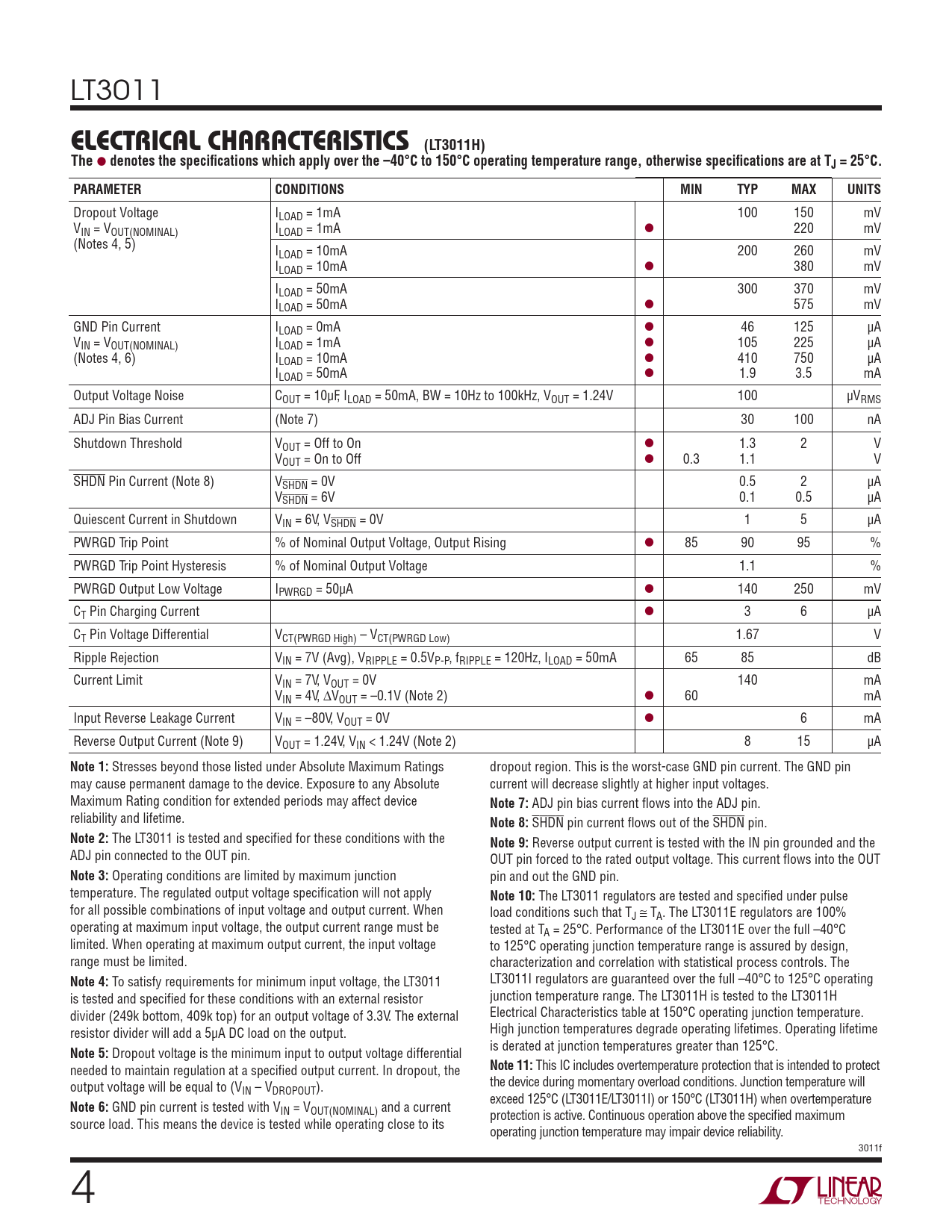 LT3011 ELECTRICAL CHARACTERISTICS (LT3011H)The l denotes the specifi cations which apply over the –40°C to 150°C operating temperature range, otherwise specifi cations are at TJ = 25°C.PARAMETERCONDITIONSMINTYPMAXUNITS Dropout Voltage ILOAD = 1mA 100 150 mV VIN = VOUT(NOMINAL) ILOAD = 1mA l 220 mV (Notes 4, 5) ILOAD = 10mA 200 260 mV ILOAD = 10mA l 380 mV ILOAD = 50mA 300 370 mV ILOAD = 50mA l 575 mV GND Pin Current ILOAD = 0mA l 46 125 μA VIN = VOUT(NOMINAL) ILOAD = 1mA l 105 225 μA (Notes 4, 6) ILOAD = 10mA l 410 750 μA ILOAD = 50mA l 1.9 3.5 mA Output Voltage Noise COUT = 10μF, ILOAD = 50mA, BW = 10Hz to 100kHz, VOUT = 1.24V 100 μVRMS ADJ Pin Bias Current (Note 7) 30 100 nA Shutdown Threshold VOUT = Off to On l 1.3 2 V VOUT = On to Off l 0.3 1.1 V SHDN Pin Current (Note 8) VSHDN = 0V 0.5 2 μA VSHDN = 6V 0.1 0.5 μA Quiescent Current in Shutdown VIN = 6V, VSHDN = 0V 1 5 μA PWRGD Trip Point % of Nominal Output Voltage, Output Rising l 85 90 95 % PWRGD Trip Point Hysteresis % of Nominal Output Voltage 1.1 % PWRGD Output Low Voltage IPWRGD = 50μA l 140 250 mV CT Pin Charging Current l 3 6 μA CT Pin Voltage Differential VCT(PWRGD High) – VCT(PWRGD Low) 1.67 V Ripple Rejection VIN = 7V (Avg), VRIPPLE = 0.5VP-P, fRIPPLE = 120Hz, ILOAD = 50mA 65 85 dB Current Limit VIN = 7V, VOUT = 0V 140 mA VIN = 4V, ΔVOUT = –0.1V (Note 2) l 60 mA Input Reverse Leakage Current VIN = –80V, VOUT = 0V l 6 mA Reverse Output Current (Note 9) VOUT = 1.24V, VIN < 1.24V (Note 2) 8 15 μA Note 1: Stresses beyond those listed under Absolute Maximum Ratings dropout region. This is the worst-case GND pin current. The GND pin may cause permanent damage to the device. Exposure to any Absolute current will decrease slightly at higher input voltages. Maximum Rating condition for extended periods may affect device Note 7: ADJ pin bias current fl ows into the ADJ pin. reliability and lifetime. Note 8: SHDN pin current fl ows out of the SHDN pin. Note 2: The LT3011 is tested and specifi ed for these conditions with the Note 9: Reverse output current is tested with the IN pin grounded and the ADJ pin connected to the OUT pin. OUT pin forced to the rated output voltage. This current fl ows into the OUT Note 3: Operating conditions are limited by maximum junction pin and out the GND pin. temperature. The regulated output voltage specifi cation will not apply Note 10: The LT3011 regulators are tested and specifi ed under pulse for all possible combinations of input voltage and output current. When load conditions such that TJ ≅ TA. The LT3011E regulators are 100% operating at maximum input voltage, the output current range must be tested at TA = 25°C. Performance of the LT3011E over the full –40°C limited. When operating at maximum output current, the input voltage to 125°C operating junction temperature range is assured by design, range must be limited. characterization and correlation with statistical process controls. The Note 4: To satisfy requirements for minimum input voltage, the LT3011 LT3011I regulators are guaranteed over the full –40°C to 125°C operating is tested and specifi ed for these conditions with an external resistor junction temperature range. The LT3011H is tested to the LT3011H divider (249k bottom, 409k top) for an output voltage of 3.3V. The external Electrical Characteristics table at 150°C operating junction temperature. resistor divider will add a 5μA DC load on the output. High junction temperatures degrade operating lifetimes. Operating lifetime is derated at junction temperatures greater than 125°C. Note 5: Dropout voltage is the minimum input to output voltage differential needed to maintain regulation at a specifi ed output current. In dropout, the Note 11: This IC includes overtemperature protection that is intended to protect output voltage will be equal to (V the device during momentary overload conditions. Junction temperature will IN – VDROPOUT). exceed 125°C (LT3011E/LT3011I) or 150°C (LT3011H) when overtemperature Note 6: GND pin current is tested with VIN = VOUT(NOMINAL) and a current protection is active. Continuous operation above the specifi ed maximum source load. This means the device is tested while operating close to its operating junction temperature may impair device reliability. 3011f 4