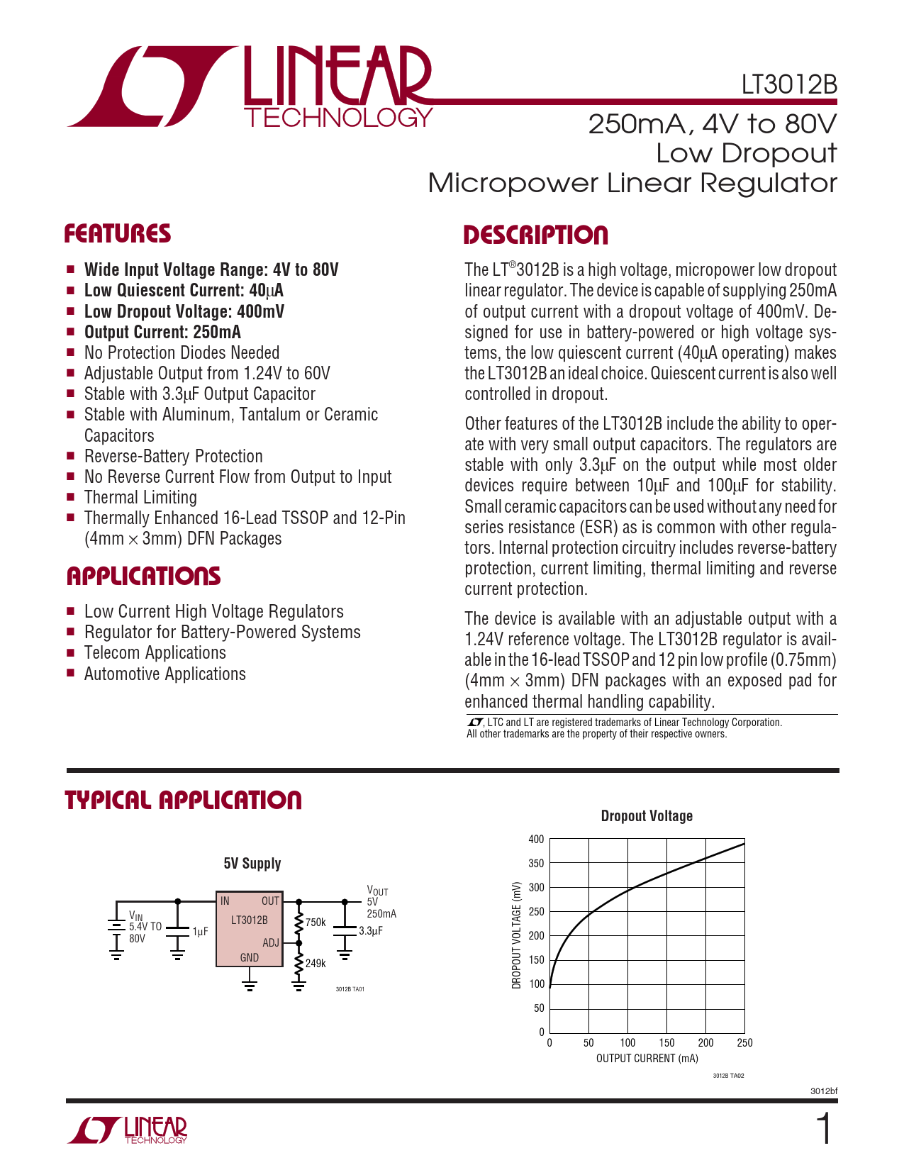 350 V 300 OUT IN OUT 5V V 250 IN 250mA LT3012B 5.4V TO 750k 1µF 3.3µF 80V 200 ADJ GND 249k 150 DROPOUT VOLTAGE (mV) 100 3012B TA01 50 0 0 50 100 150 200 250 OUTPUT CURRENT (mA) 3012B TA02 3012bf 1