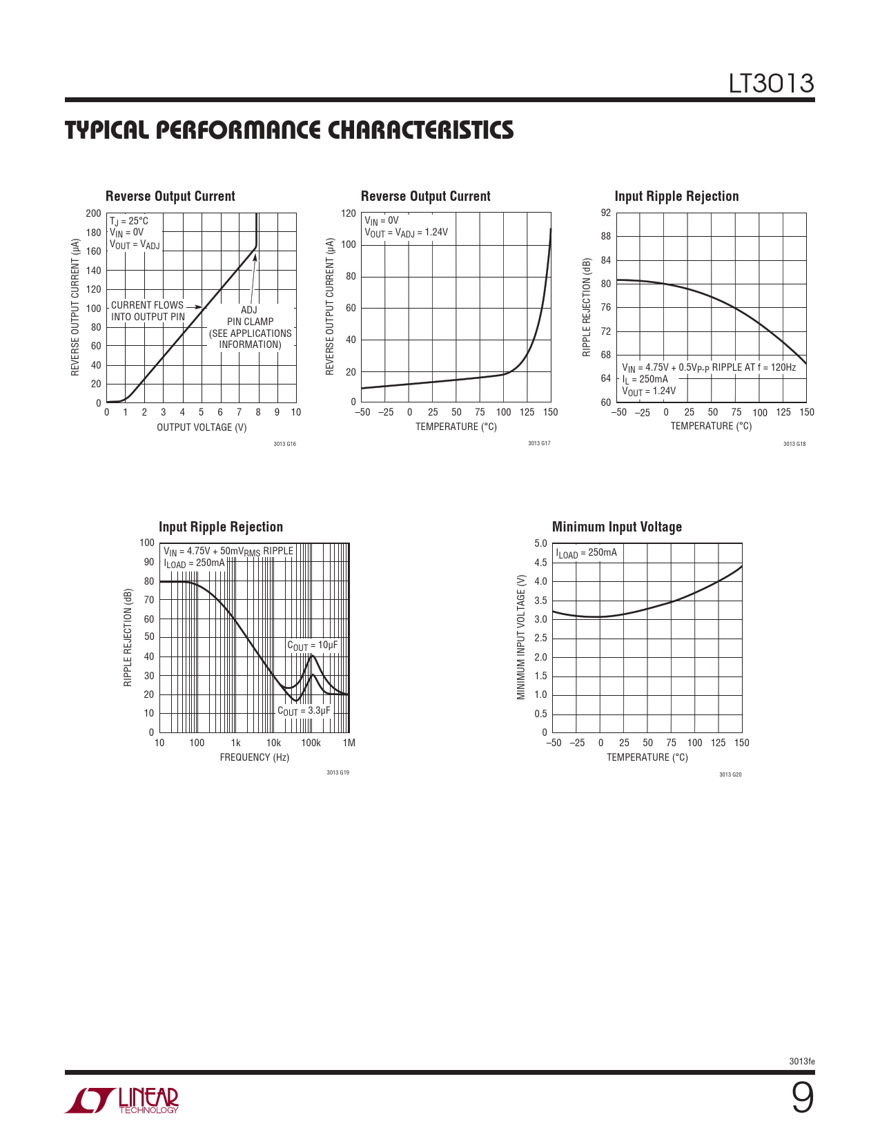 100 5.0 VIN = 4.75V + 50mVRMS RIPPLE ILOAD = 250mA 90 I 4.5 LOAD = 250mA 80 4.0 70 3.5 60 3.0 50 2.5 COUT = 10μF 40 2.0 30 1.5 RIPPLE REJECTION (dB) 20 MINIMUM INPUT VOLTAGE (V) 1.0 10 COUT = 3.3μF 0.5 0 0 10 100 1k 10k 100k 1M –50 –25 0 25 50 75 100 125 150 FREQUENCY (Hz) TEMPERATURE (°C) 3013 G19 3013 G20 3013fe 9