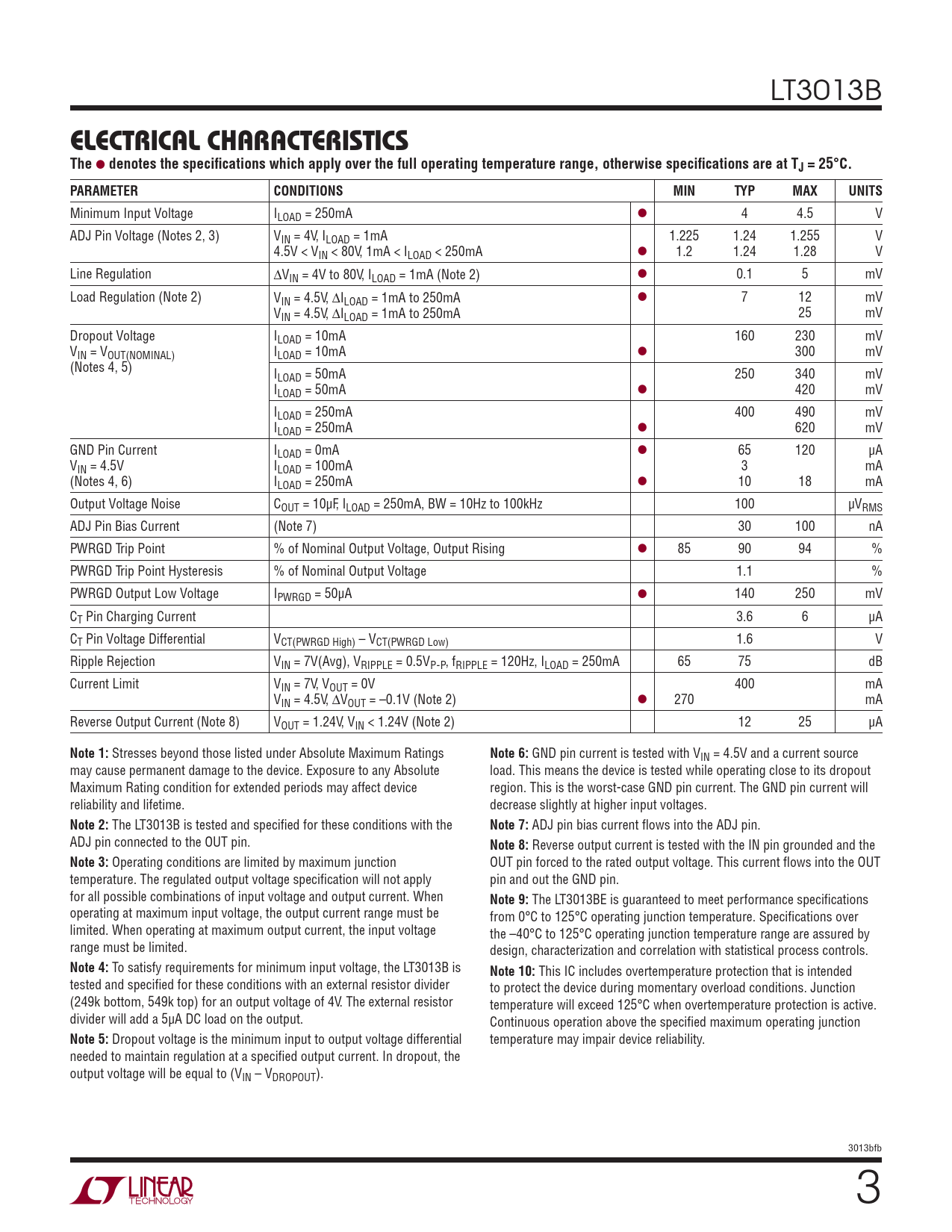 LT3013B ELECTRICAL CHARACTERISTICS The l denotes the specifi cations which apply over the full operating temperature range, otherwise specifi cations are at TJ = 25°C.PARAMETERCONDITIONSMINTYPMAXUNITS Minimum Input Voltage ILOAD = 250mA l 4 4.5 V ADJ Pin Voltage (Notes 2, 3) VIN = 4V, ILOAD = 1mA 1.225 1.24 1.255 V 4.5V < VIN < 80V, 1mA < ILOAD < 250mA l 1.2 1.24 1.28 V Line Regulation ΔVIN = 4V to 80V, ILOAD = 1mA (Note 2) l 0.1 5 mV Load Regulation (Note 2) V l IN = 4.5V, ΔILOAD = 1mA to 250mA 7 12 mV VIN = 4.5V, ΔILOAD = 1mA to 250mA 25 mV Dropout Voltage ILOAD = 10mA 160 230 mV VIN = VOUT(NOMINAL) ILOAD = 10mA l 300 mV (Notes 4, 5) ILOAD = 50mA 250 340 mV ILOAD = 50mA l 420 mV ILOAD = 250mA 400 490 mV ILOAD = 250mA l 620 mV GND Pin Current ILOAD = 0mA l 65 120 μA VIN = 4.5V ILOAD = 100mA 3 mA (Notes 4, 6) ILOAD = 250mA l 10 18 mA Output Voltage Noise COUT = 10μF, ILOAD = 250mA, BW = 10Hz to 100kHz 100 μVRMS ADJ Pin Bias Current (Note 7) 30 100 nA PWRGD Trip Point % of Nominal Output Voltage, Output Rising l 85 90 94 % PWRGD Trip Point Hysteresis % of Nominal Output Voltage 1.1 % PWRGD Output Low Voltage IPWRGD = 50μA l 140 250 mV CT Pin Charging Current 3.6 6 μA CT Pin Voltage Differential VCT(PWRGD High) – VCT(PWRGD Low) 1.6 V Ripple Rejection VIN = 7V(Avg), VRIPPLE = 0.5VP-P, fRIPPLE = 120Hz, ILOAD = 250mA 65 75 dB Current Limit VIN = 7V, VOUT = 0V 400 mA VIN = 4.5V, ΔVOUT = –0.1V (Note 2) l 270 mA Reverse Output Current (Note 8) VOUT = 1.24V, VIN < 1.24V (Note 2) 12 25 μA Note 1: Stresses beyond those listed under Absolute Maximum Ratings Note 6: GND pin current is tested with VIN = 4.5V and a current source may cause permanent damage to the device. Exposure to any Absolute load. This means the device is tested while operating close to its dropout Maximum Rating condition for extended periods may affect device region. This is the worst-case GND pin current. The GND pin current will reliability and lifetime. decrease slightly at higher input voltages. Note 2: The LT3013B is tested and specifi ed for these conditions with the Note 7: ADJ pin bias current fl ows into the ADJ pin. ADJ pin connected to the OUT pin. Note 8: Reverse output current is tested with the IN pin grounded and the Note 3: Operating conditions are limited by maximum junction OUT pin forced to the rated output voltage. This current fl ows into the OUT temperature. The regulated output voltage specifi cation will not apply pin and out the GND pin. for all possible combinations of input voltage and output current. When Note 9: The LT3013BE is guaranteed to meet performance specifi cations operating at maximum input voltage, the output current range must be from 0°C to 125°C operating junction temperature. Specifi cations over limited. When operating at maximum output current, the input voltage the –40°C to 125°C operating junction temperature range are assured by range must be limited. design, characterization and correlation with statistical process controls. Note 4: To satisfy requirements for minimum input voltage, the LT3013B is Note 10: This IC includes overtemperature protection that is intended tested and specifi ed for these conditions with an external resistor divider to protect the device during momentary overload conditions. Junction (249k bottom, 549k top) for an output voltage of 4V. The external resistor temperature will exceed 125°C when overtemperature protection is active. divider will add a 5μA DC load on the output. Continuous operation above the specifi ed maximum operating junction Note 5: Dropout voltage is the minimum input to output voltage differential temperature may impair device reliability. needed to maintain regulation at a specifi ed output current. In dropout, the output voltage will be equal to (VIN – VDROPOUT). 3013bfb 3