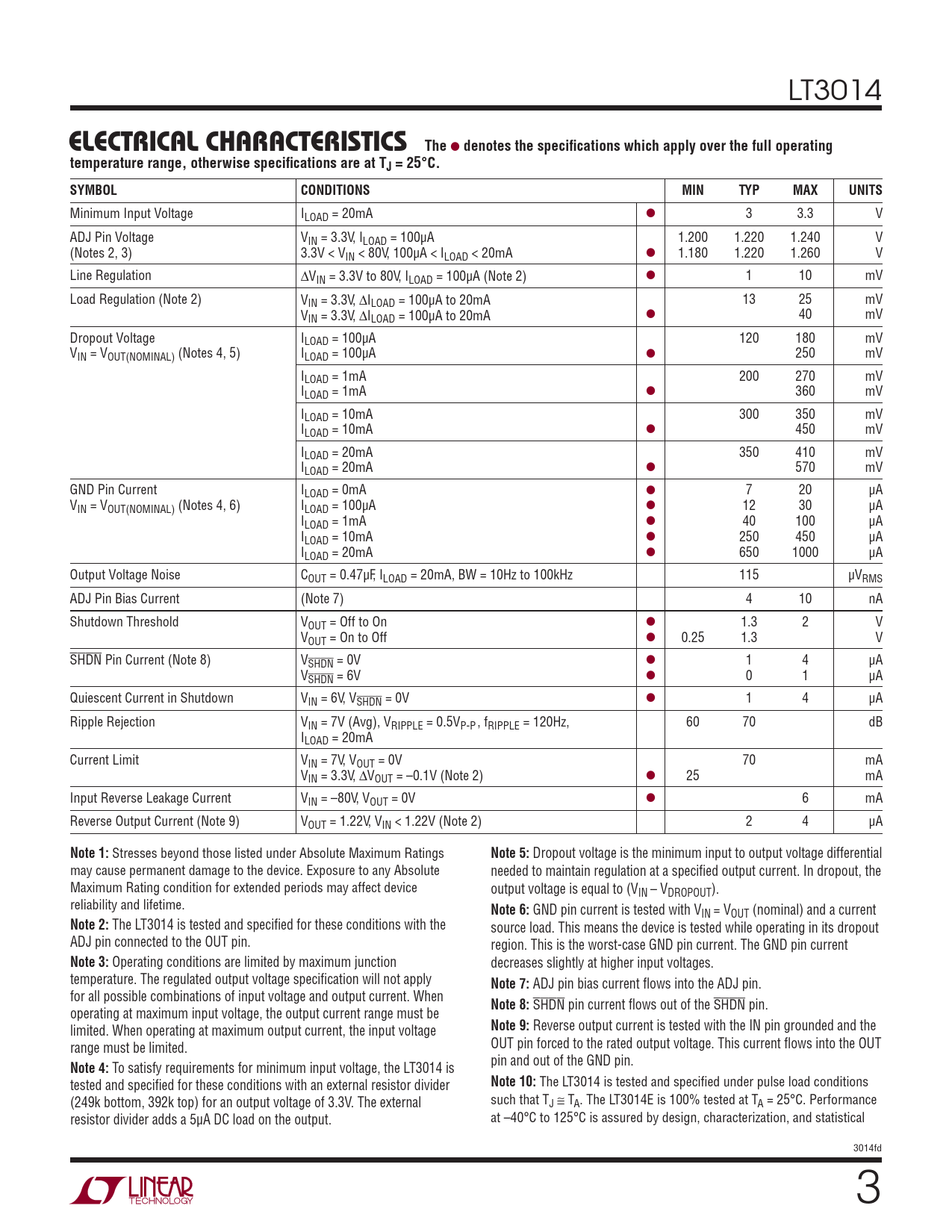Minimum Input Voltage ILOAD = 20mA l 3 3.3 V ADJ Pin Voltage VIN = 3.3V, ILOAD = 100μA 1.200 1.220 1.240 V (Notes 2, 3) 3.3V < VIN < 80V, 100μA < ILOAD < 20mA l 1.180 1.220 1.260 V Line Regulation ΔVIN = 3.3V to 80V, ILOAD = 100μA (Note 2) l 1 10 mV Load Regulation (Note 2) VIN = 3.3V, ΔILOAD = 100μA to 20mA 13 25 mV VIN = 3.3V, ΔILOAD = 100μA to 20mA l 40 mV Dropout Voltage ILOAD = 100μA 120 180 mV VIN = VOUT(NOMINAL) (Notes 4, 5) ILOAD = 100μA l 250 mV ILOAD = 1mA 200 270 mV ILOAD = 1mA l 360 mV ILOAD = 10mA 300 350 mV ILOAD = 10mA l 450 mV ILOAD = 20mA 350 410 mV ILOAD = 20mA l 570 mV GND Pin Current ILOAD = 0mA l 7 20 μA VIN = VOUT(NOMINAL) (Notes 4, 6) ILOAD = 100μA l 12 30 μA ILOAD = 1mA l 40 100 μA ILOAD = 10mA l 250 450 μA ILOAD = 20mA l 650 1000 μA Output Voltage Noise COUT = 0.47μF, ILOAD = 20mA, BW = 10Hz to 100kHz 115 μVRMS ADJ Pin Bias Current (Note 7) 4 10 nA Shutdown Threshold VOUT = Off to On l 1.3 2 V VOUT = On to Off l 0.25 1.3 V SHDN Pin Current (Note 8) VSHDN = 0V l 1 4 μA VSHDN = 6V l 0 1 μA Quiescent Current in Shutdown VIN = 6V, VSHDN = 0V l 1 4 μA Ripple Rejection VIN = 7V (Avg), VRIPPLE = 0.5VP-P , fRIPPLE = 120Hz, 60 70 dB ILOAD = 20mA Current Limit VIN = 7V, VOUT = 0V 70 mA VIN = 3.3V, ΔVOUT = –0.1V (Note 2) l 25 mA Input Reverse Leakage Current VIN = –80V, VOUT = 0V l 6 mA Reverse Output Current (Note 9) VOUT = 1.22V, VIN < 1.22V (Note 2) 2 4 μA