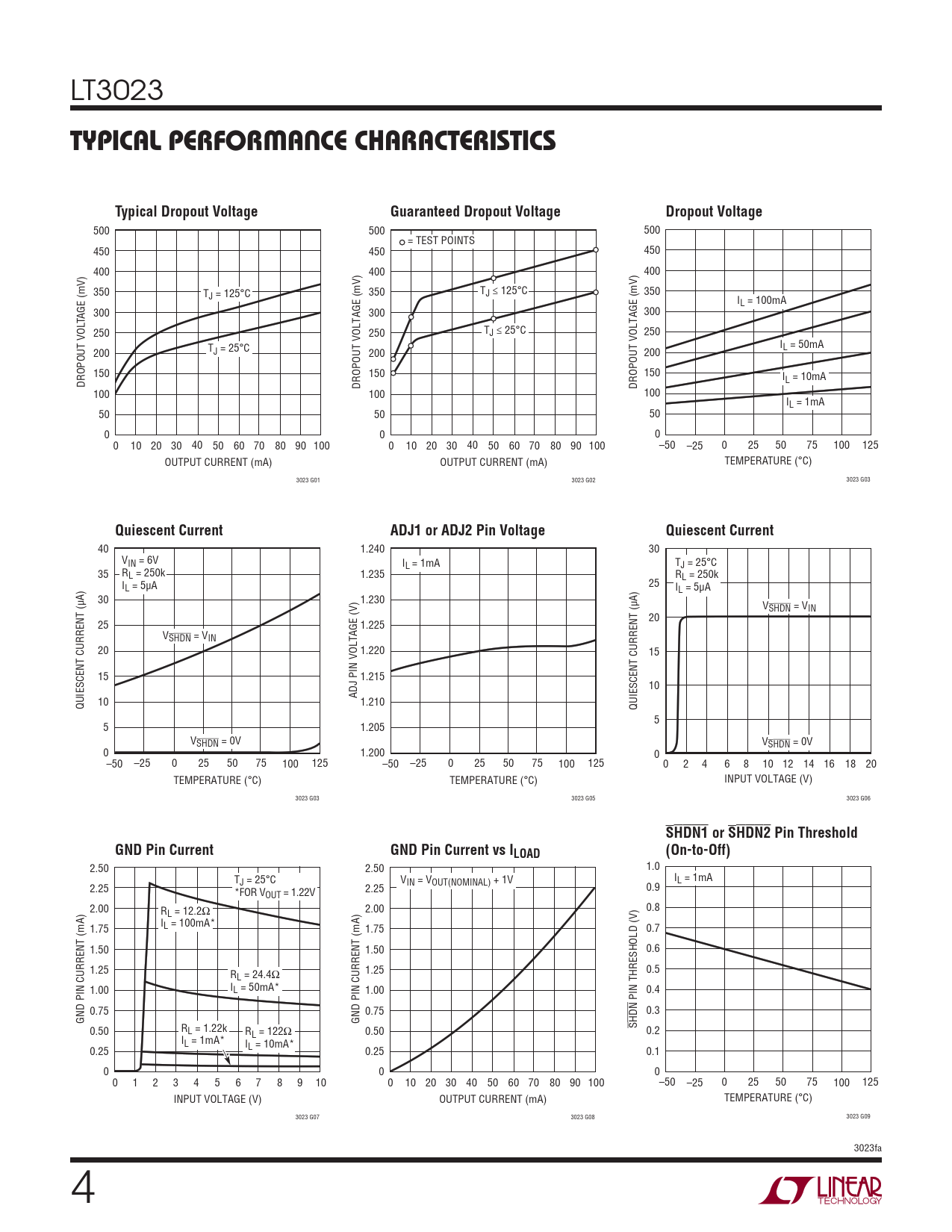 500 500 500 = TEST POINTS 450 450 450 400 400 400 350 T T 350 J = 125°C 350 J ≤ 125°C IL = 100mA 300 300 300 TAGE (mV) 250 250 TJ ≤ 25°C 250 IL = 50mA 200 TJ = 25°C 200 200 150 150 150 I DROPOUT VOL L = 10mA DROPOUT VOLTAGE (mV) DROPOUT VOLTAGE (mV) 100 100 100 IL = 1mA 50 50 50 0 0 0 0 10 20 30 40 50 60 70 80 90 100 0 10 20 30 40 50 60 70 80 90 100 –50 –25 0 25 50 75 100 125 OUTPUT CURRENT (mA) OUTPUT CURRENT (mA) TEMPERATURE (°C) 3023 G01 3023 G02 3023 G03