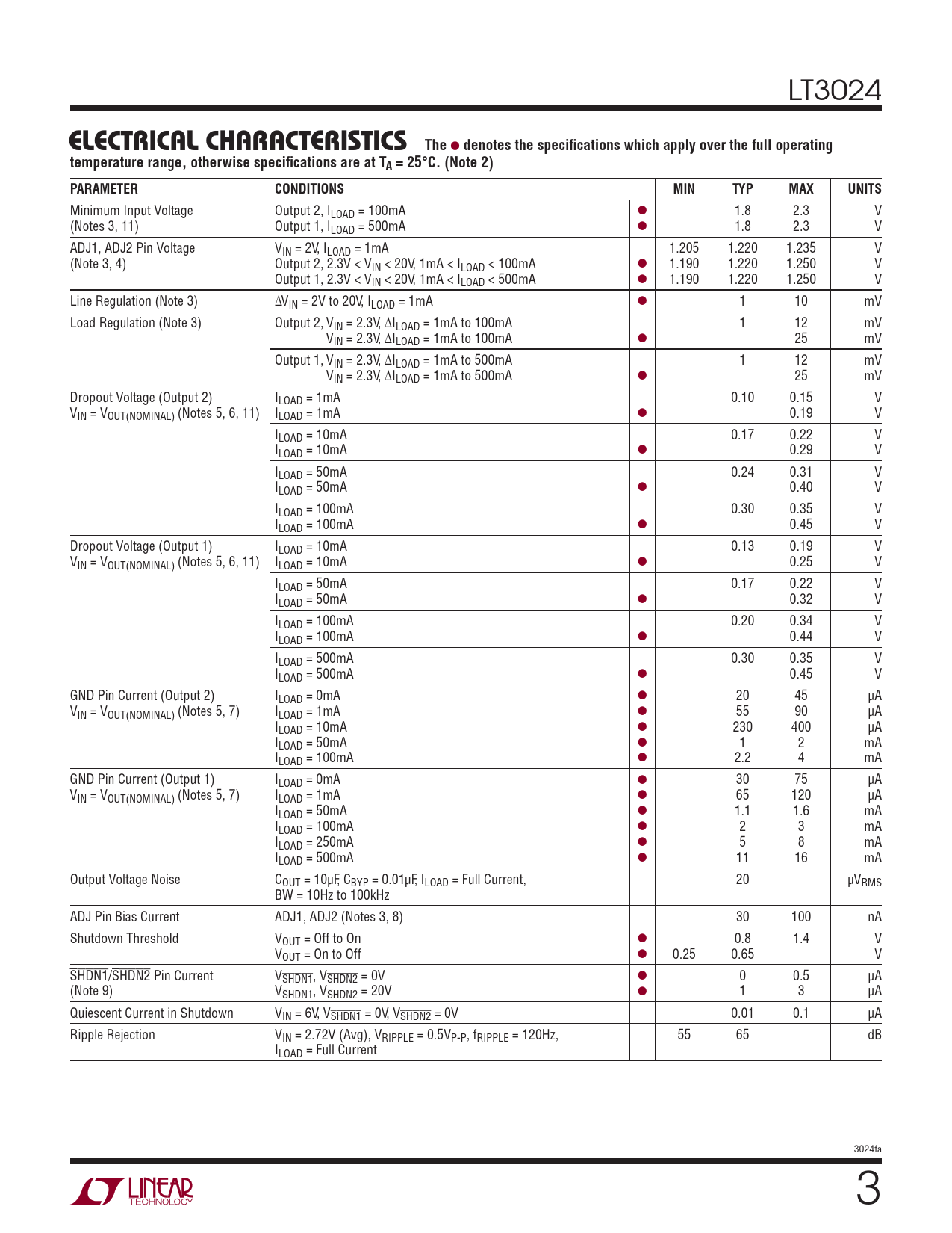Minimum Input Voltage Output 2, ILOAD = 100mA l 1.8 2.3 V (Notes 3, 11) Output 1, ILOAD = 500mA l 1.8 2.3 V ADJ1, ADJ2 Pin Voltage VIN = 2V, ILOAD = 1mA 1.205 1.220 1.235 V (Note 3, 4) Output 2, 2.3V < VIN < 20V, 1mA < ILOAD < 100mA l 1.190 1.220 1.250 V Output 1, 2.3V < VIN < 20V, 1mA < ILOAD < 500mA l 1.190 1.220 1.250 V Line Regulation (Note 3) ΔVIN = 2V to 20V, ILOAD = 1mA l 1 10 mV Load Regulation (Note 3) Output 2, VIN = 2.3V, ΔILOAD = 1mA to 100mA 1 12 mV VIN = 2.3V, ΔILOAD = 1mA to 100mA l 25 mV Output 1, VIN = 2.3V, ΔILOAD = 1mA to 500mA 1 12 mV VIN = 2.3V, ΔILOAD = 1mA to 500mA l 25 mV Dropout Voltage (Output 2) ILOAD = 1mA 0.10 0.15 V VIN = VOUT(NOMINAL) (Notes 5, 6, 11) ILOAD = 1mA l 0.19 V ILOAD = 10mA 0.17 0.22 V ILOAD = 10mA l 0.29 V ILOAD = 50mA 0.24 0.31 V ILOAD = 50mA l 0.40 V ILOAD = 100mA 0.30 0.35 V ILOAD = 100mA l 0.45 V Dropout Voltage (Output 1) ILOAD = 10mA 0.13 0.19 V VIN = VOUT(NOMINAL) (Notes 5, 6, 11) ILOAD = 10mA l 0.25 V ILOAD = 50mA 0.17 0.22 V ILOAD = 50mA l 0.32 V ILOAD = 100mA 0.20 0.34 V ILOAD = 100mA l 0.44 V ILOAD = 500mA 0.30 0.35 V ILOAD = 500mA l 0.45 V GND Pin Current (Output 2) ILOAD = 0mA l 20 45 μA VIN = VOUT(NOMINAL) (Notes 5, 7) ILOAD = 1mA l 55 90 μA ILOAD = 10mA l 230 400 μA ILOAD = 50mA l 1 2 mA ILOAD = 100mA l 2.2 4 mA GND Pin Current (Output 1) ILOAD = 0mA l 30 75 μA VIN = VOUT(NOMINAL) (Notes 5, 7) ILOAD = 1mA l 65 120 μA ILOAD = 50mA l 1.1 1.6 mA ILOAD = 100mA l 2 3 mA ILOAD = 250mA l 5 8 mA ILOAD = 500mA l 11 16 mA Output Voltage Noise COUT = 10μF, CBYP = 0.01μF, ILOAD = Full Current, 20 μVRMS BW = 10Hz to 100kHz ADJ Pin Bias Current ADJ1, ADJ2 (Notes 3, 8) 30 100 nA Shutdown Threshold VOUT = Off to On l 0.8 1.4 V VOUT = On to Off l 0.25 0.65 V SHDN1/SHDN2 Pin Current VSHDN1, VSHDN2 = 0V l 0 0.5 μA (Note 9) VSHDN1, VSHDN2 = 20V l 1 3 μA Quiescent Current in Shutdown VIN = 6V, VSHDN1 = 0V, VSHDN2 = 0V 0.01 0.1 μA Ripple Rejection VIN = 2.72V (Avg), VRIPPLE = 0.5VP-P, fRIPPLE = 120Hz, 55 65 dB ILOAD = Full Current 3024fa 3