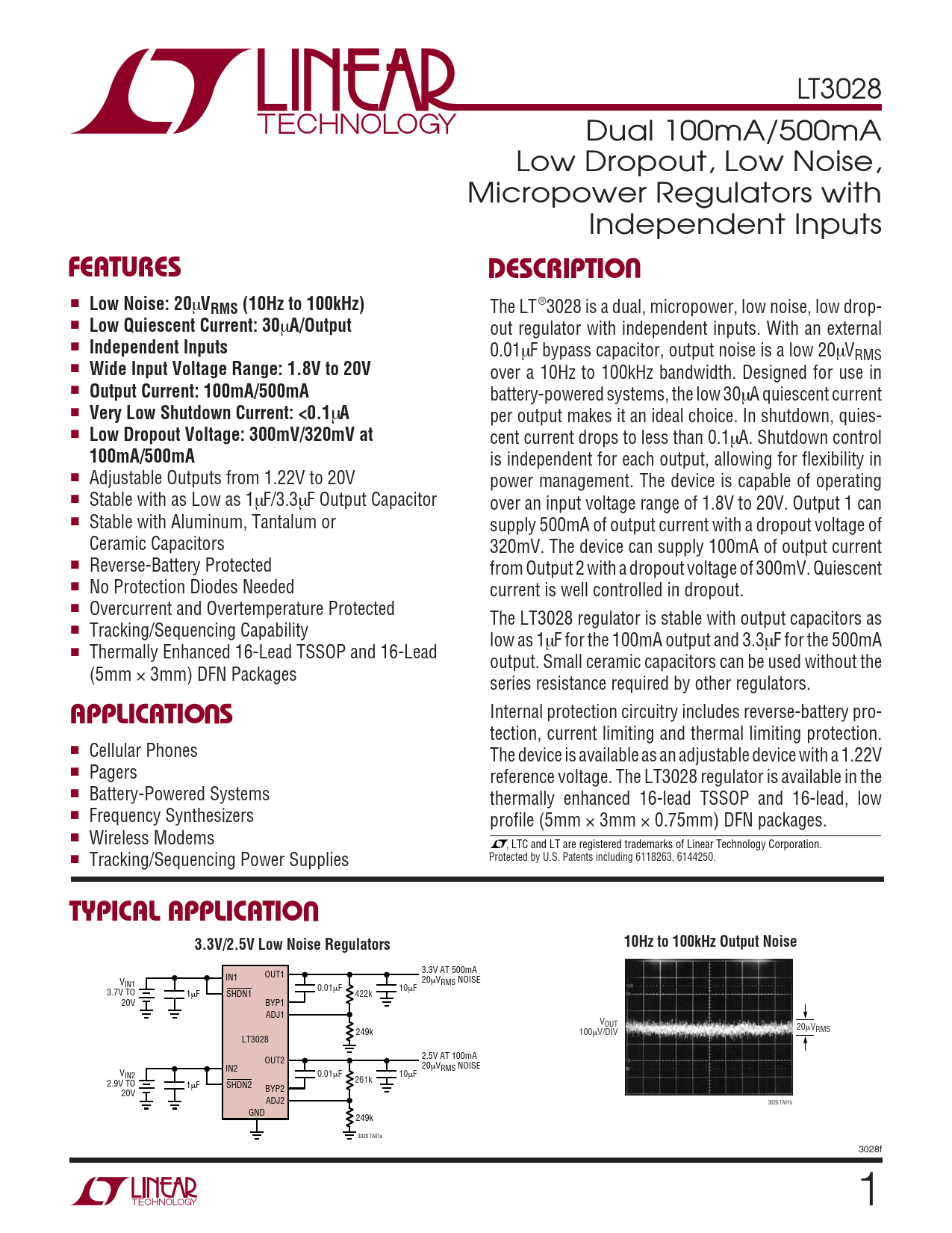 LT3028 Dual 100mA/500mA Low Dropout, Low Noise, Micropower Regulators with Independent Inputs UFEATURESDESCRIPTIO ■ Low Noise: 20 µ VRMS (10Hz to 100kHz) The LT®3028 is a dual, micropower, low noise, low drop- ■ Low Quiescent Current: 30 µ A/Output out regulator with independent inputs. With an external ■ Independent Inputs 0.01µF bypass capacitor, output noise is a low 20µVRMS ■ Wide Input Voltage Range: 1.8V to 20V over a 10Hz to 100kHz bandwidth. Designed for use in ■ Output Current: 100mA/500mA battery-powered systems, the low 30µA quiescent current ■ Very Low Shutdown Current: <0.1 µ A per output makes it an ideal choice. In shutdown, quies- ■ Low Dropout Voltage: 300mV/320mV at cent current drops to less than 0.1µA. Shutdown control 100mA/500mA is independent for each output, allowing for flexibility in ■ Adjustable Outputs from 1.22V to 20V power management. The device is capable of operating ■ Stable with as Low as 1µF/3.3µF Output Capacitor over an input voltage range of 1.8V to 20V. Output 1 can ■ Stable with Aluminum, Tantalum or supply 500mA of output current with a dropout voltage of Ceramic Capacitors 320mV. The device can supply 100mA of output current ■ Reverse-Battery Protected from Output 2 with a dropout voltage of 300mV. Quiescent ■ No Protection Diodes Needed current is well controlled in dropout. ■ Overcurrent and Overtemperature Protected The LT3028 regulator is stable with output capacitors as ■ Tracking/Sequencing Capability low as 1µF for the 100mA output and 3.3µF for the 500mA ■ Thermally Enhanced 16-Lead TSSOP and 16-Lead output. Small ceramic capacitors can be used without the (5mm × 3mm) DFN Packages series resistance required by other regulators. U Internal protection circuitry includes reverse-battery pro- APPLICATIO S tection, current limiting and thermal limiting protection. ■ Cellular Phones The device is available as an adjustable device with a 1.22V ■ Pagers reference voltage. The LT3028 regulator is available in the ■ Battery-Powered Systems thermally enhanced 16-lead TSSOP and 16-lead, low ■ Frequency Synthesizers profile (5mm × 3mm × 0.75mm) DFN packages. ■ Wireless Modems , LTC and LT are registered trademarks of Linear Technology Corporation. ■ Tracking/Sequencing Power Supplies Protected by U.S. Patents including 6118263, 6144250. UTYPICAL APPLICATIO10Hz to 100kHz Output Noise3.3V/2.5V Low Noise Regulators 3.3V AT 500mA OUT1 IN1 20 V µVRMS NOISE IN1 0.01µF 10µF 3.7V TO 1µF SHDN1 422k 20V BYP1 ADJ1 VOUT 20 249k 100 µV µV/DIV RMS LT3028 2.5V AT 100mA OUT2 20 IN2 µVRMS NOISE VIN2 0.01µF 10µF 261k 2.9V TO 1µF SHDN2 BYP2 20V ADJ2 3028 TA01b GND 249k 3028 TA01a 3028f 1