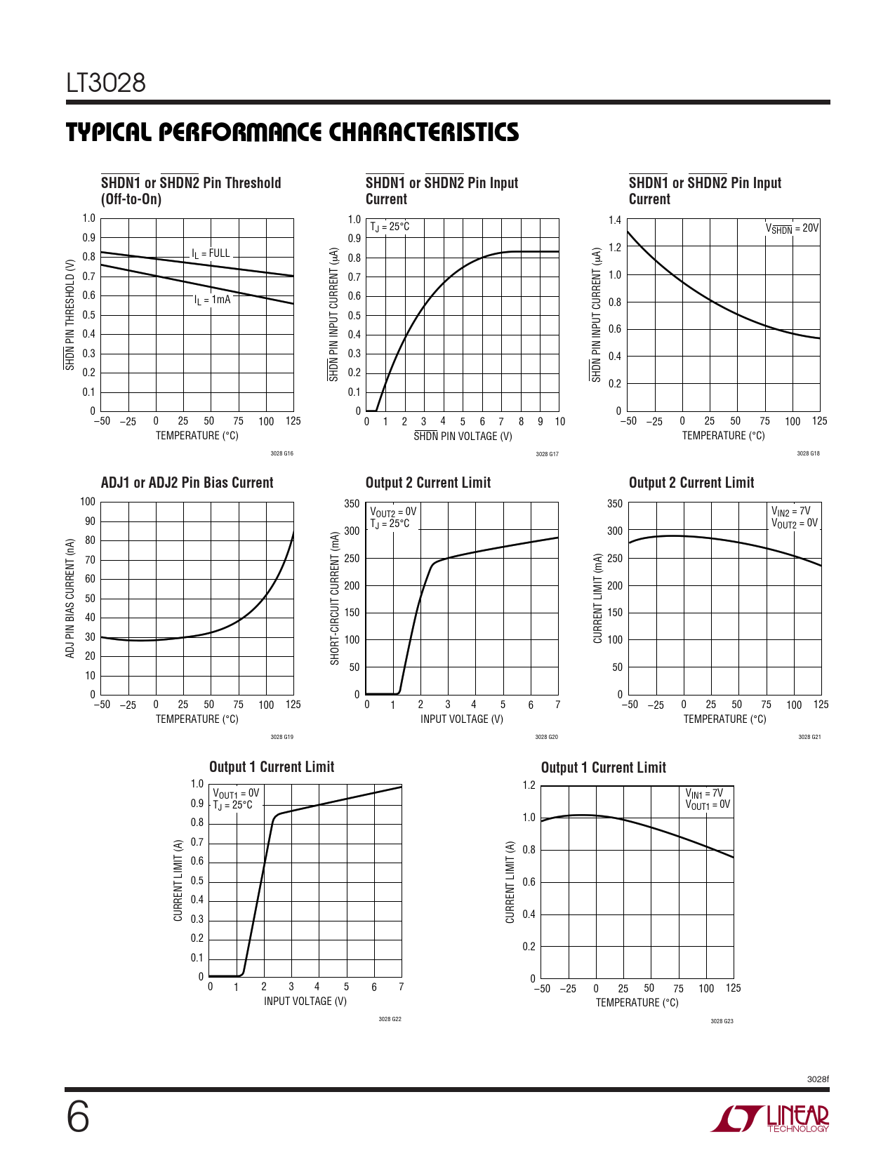 1.0 1.2 VOUT1 = 0V VIN1 = 7V 0.9 TJ = 25°C VOUT1 = 0V 1.0 0.8 0.7 0.8 0.6 0.5 0.6 0.4 CURRENT LIMIT (A) 0.4 0.3 CURRENT LIMIT (A) 0.2 0.2 0.1 0 0 0 1 2 3 4 5 6 7 –50 –25 0 25 50 75 100 125 INPUT VOLTAGE (V) TEMPERATURE (°C) 3028 G22 3028 G23 3028f 6