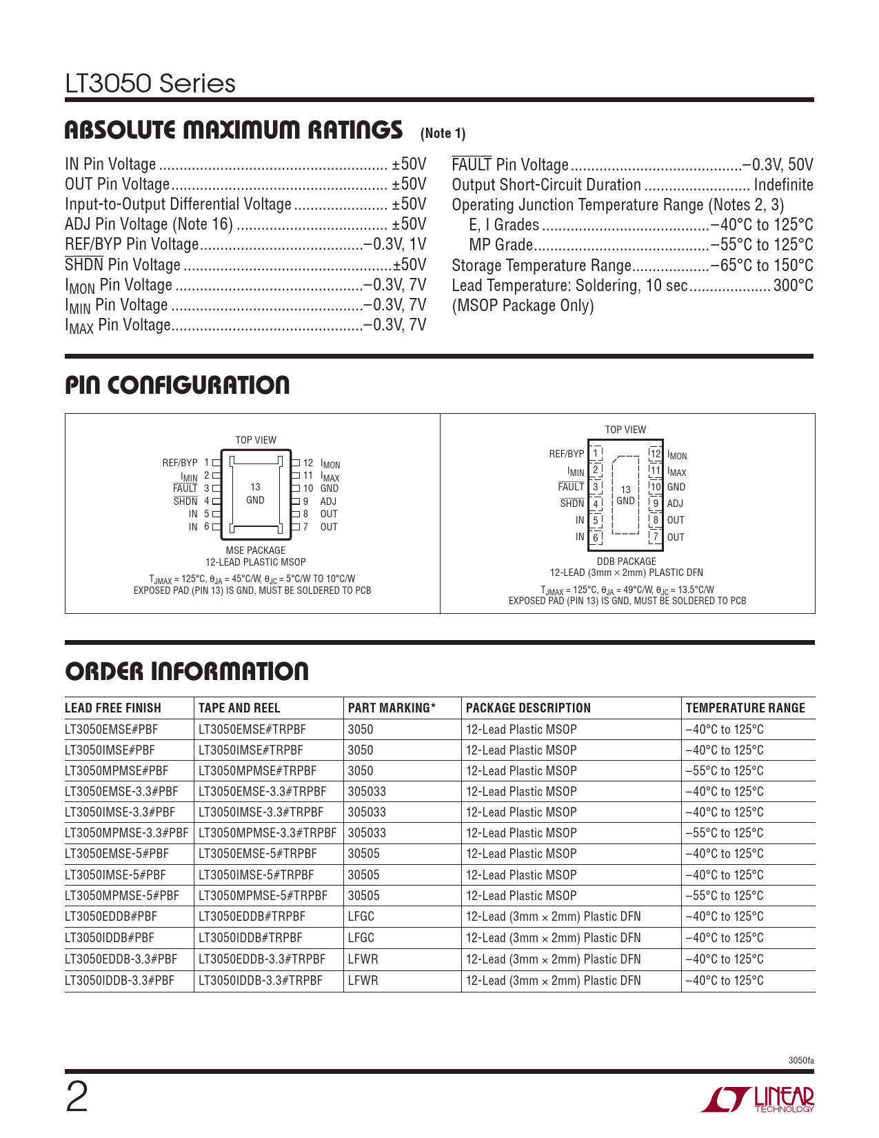 LT3050EMSE#PBF LT3050EMSE#TRPBF 3050 12-Lead Plastic MSOP –40°C to 125°C LT3050IMSE#PBF LT3050IMSE#TRPBF 3050 12-Lead Plastic MSOP –40°C to 125°C LT3050MPMSE#PBF LT3050MPMSE#TRPBF 3050 12-Lead Plastic MSOP –55°C to 125°C LT3050EMSE-3.3#PBF LT3050EMSE-3.3#TRPBF 305033 12-Lead Plastic MSOP –40°C to 125°C LT3050IMSE-3.3#PBF LT3050IMSE-3.3#TRPBF 305033 12-Lead Plastic MSOP –40°C to 125°C LT3050MPMSE-3.3#PBF LT3050MPMSE-3.3#TRPBF 305033 12-Lead Plastic MSOP –55°C to 125°C LT3050EMSE-5#PBF LT3050EMSE-5#TRPBF 30505 12-Lead Plastic MSOP –40°C to 125°C LT3050IMSE-5#PBF LT3050IMSE-5#TRPBF 30505 12-Lead Plastic MSOP –40°C to 125°C LT3050MPMSE-5#PBF LT3050MPMSE-5#TRPBF 30505 12-Lead Plastic MSOP –55°C to 125°C LT3050EDDB#PBF LT3050EDDB#TRPBF LFGC 12-Lead (3mm × 2mm) Plastic DFN –40°C to 125°C LT3050IDDB#PBF LT3050IDDB#TRPBF LFGC 12-Lead (3mm × 2mm) Plastic DFN –40°C to 125°C LT3050EDDB-3.3#PBF LT3050EDDB-3.3#TRPBF LFWR 12-Lead (3mm × 2mm) Plastic DFN –40°C to 125°C LT3050IDDB-3.3#PBF LT3050IDDB-3.3#TRPBF LFWR 12-Lead (3mm × 2mm) Plastic DFN –40°C to 125°C 3050fa 2 Document Outline FEATURES DESCRIPTION APPLICATIONS TYPICAL APPLICATION ABSOLUTE MAXIMUM RATINGS PIN CONFIGURATION ORDER INFORMATION ELECTRICAL CHARACTERISTICS TYPICAL PERFORMANCE CHARACTERISTICS PIN FUNCTIONS BLOCK DIAGRAM OPERATION APPLICATIONS INFORMATION PACKAGE DESCRIPTION REVISION HISTORY TYPICAL APPLICATION RELATED PARTS
