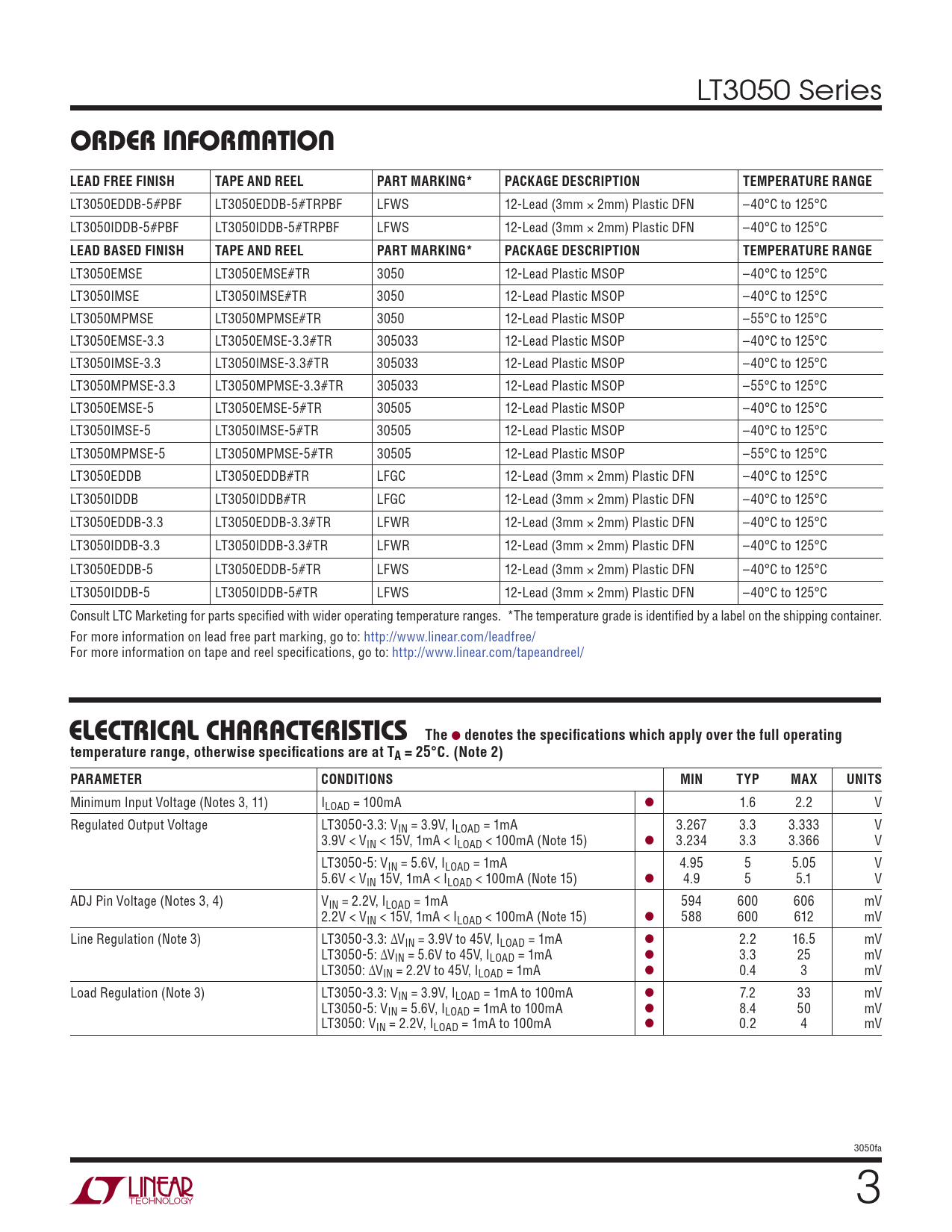 LT3050EMSE LT3050EMSE#TR 3050 12-Lead Plastic MSOP –40°C to 125°C LT3050IMSE LT3050IMSE#TR 3050 12-Lead Plastic MSOP –40°C to 125°C LT3050MPMSE LT3050MPMSE#TR 3050 12-Lead Plastic MSOP –55°C to 125°C LT3050EMSE-3.3 LT3050EMSE-3.3#TR 305033 12-Lead Plastic MSOP –40°C to 125°C LT3050IMSE-3.3 LT3050IMSE-3.3#TR 305033 12-Lead Plastic MSOP –40°C to 125°C LT3050MPMSE-3.3 LT3050MPMSE-3.3#TR 305033 12-Lead Plastic MSOP –55°C to 125°C LT3050EMSE-5 LT3050EMSE-5#TR 30505 12-Lead Plastic MSOP –40°C to 125°C LT3050IMSE-5 LT3050IMSE-5#TR 30505 12-Lead Plastic MSOP –40°C to 125°C LT3050MPMSE-5 LT3050MPMSE-5#TR 30505 12-Lead Plastic MSOP –55°C to 125°C LT3050EDDB LT3050EDDB#TR LFGC 12-Lead (3mm × 2mm) Plastic DFN –40°C to 125°C LT3050IDDB LT3050IDDB#TR LFGC 12-Lead (3mm × 2mm) Plastic DFN –40°C to 125°C LT3050EDDB-3.3 LT3050EDDB-3.3#TR LFWR 12-Lead (3mm × 2mm) Plastic DFN –40°C to 125°C LT3050IDDB-3.3 LT3050IDDB-3.3#TR LFWR 12-Lead (3mm × 2mm) Plastic DFN –40°C to 125°C LT3050EDDB-5 LT3050EDDB-5#TR LFWS 12-Lead (3mm × 2mm) Plastic DFN –40°C to 125°C LT3050IDDB-5 LT3050IDDB-5#TR LFWS 12-Lead (3mm × 2mm) Plastic DFN –40°C to 125°C Consult LTC Marketing for parts specifi ed with wider operating temperature ranges. *The temperature grade is identifi ed by a label on the shipping container. For more information on lead free part marking, go to: http://www.linear.com/leadfree/ For more information on tape and reel specifi cations, go to: http://www.linear.com/tapeandreel/