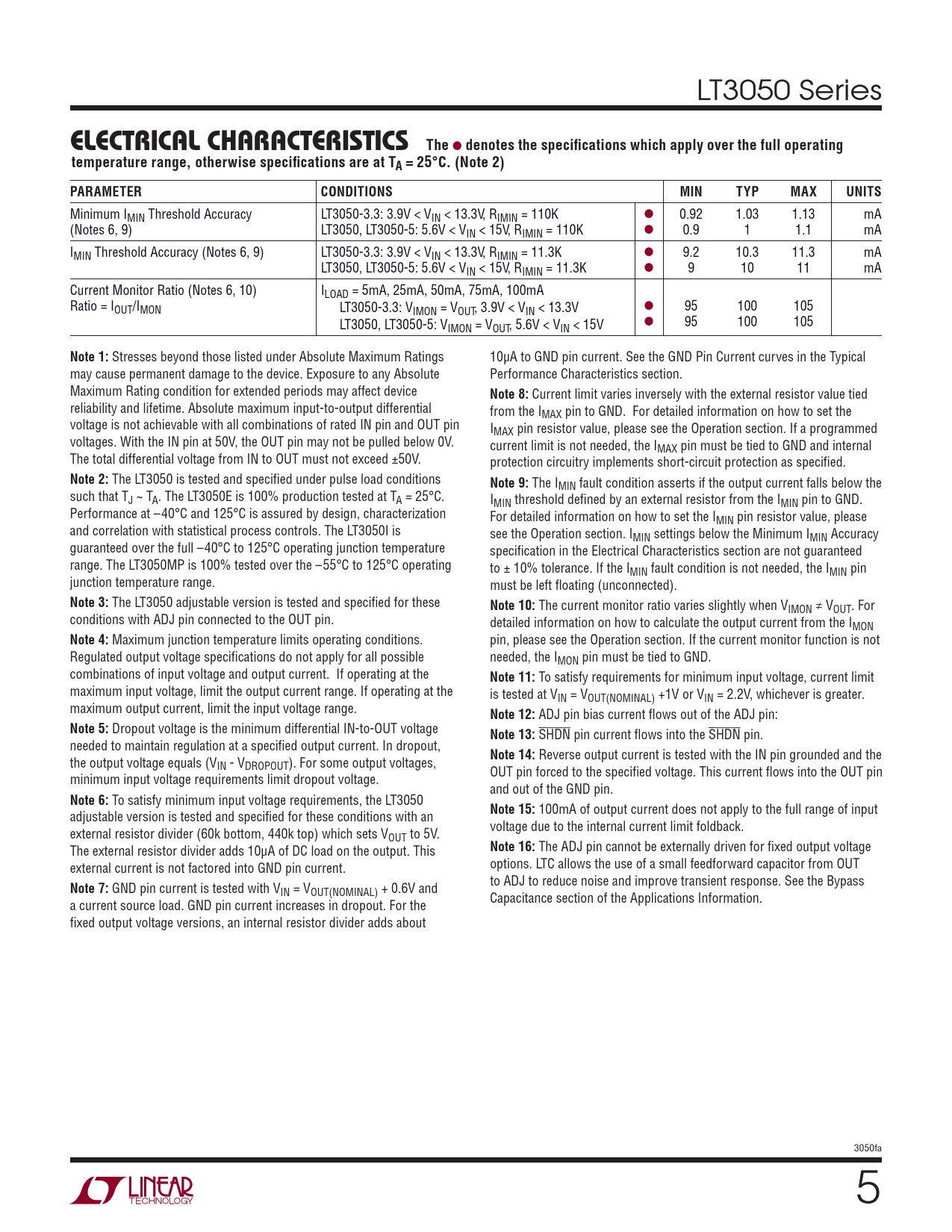 Minimum IMIN Threshold Accuracy LT3050-3.3: 3.9V < VIN < 13.3V, RIMIN = 110K l 0.92 1.03 1.13 mA (Notes 6, 9) LT3050, LT3050-5: 5.6V < VIN < 15V, RIMIN = 110K l 0.9 1 1.1 mA IMIN Threshold Accuracy (Notes 6, 9) LT3050-3.3: 3.9V < VIN < 13.3V, RIMIN = 11.3K l 9.2 10.3 11.3 mA LT3050, LT3050-5: 5.6V < VIN < 15V, RIMIN = 11.3K l 9 10 11 mA Current Monitor Ratio (Notes 6, 10) ILOAD = 5mA, 25mA, 50mA, 75mA, 100mA Ratio = IOUT/IMON LT3050-3.3: V l IMON = VOUT, 3.9V < VIN < 13.3V 95 100 105 LT3050, LT3050-5: V l 95 100 105 IMON = VOUT, 5.6V < VIN < 15V