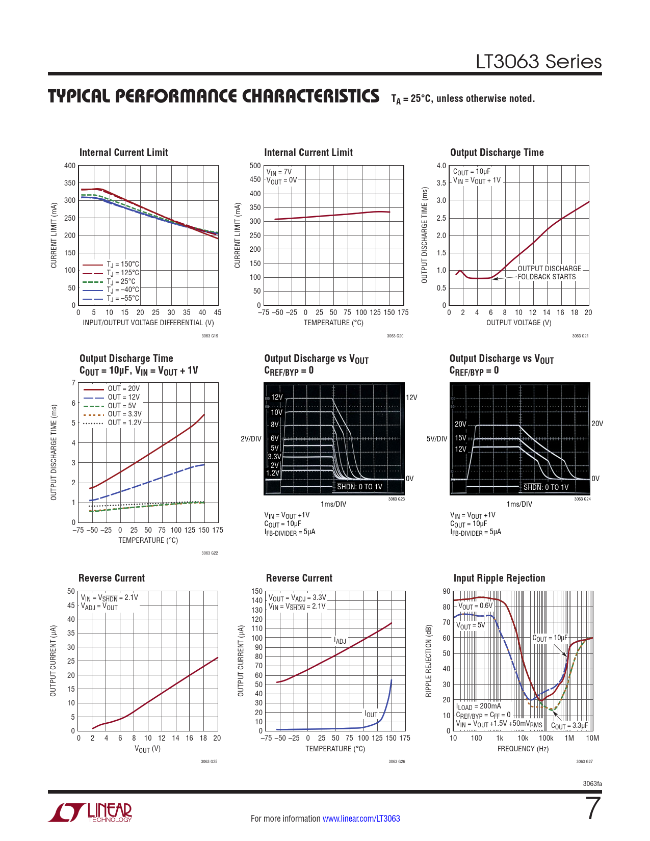 400 500 4.0 VIN = 7V COUT = 10µF 350 450 VOUT = 0V 3.5 VIN = VOUT + 1V 400 300 3.0 350 250 300 2.5 200 250 2.0 150 200 1.5 CURRENT LIMIT (mA) T CURRENT LIMIT (mA) 150 100 J = 150°C T 1.0 OUTPUT DISCHARGE J = 125°C T 100 OUTPUT DISCHARGE TIME (ms) FOLDBACK STARTS 50 J = 25°C TJ = –40°C 50 0.5 TJ = –55°C 0 0 0 0 5 10 15 20 25 30 35 40 45 –75 –50 –25 0 25 50 75 100 125 150 175 0 2 4 6 8 10 12 14 16 18 20 INPUT/OUTPUT VOLTAGE DIFFERENTIAL (V) TEMPERATURE (°C) OUTPUT VOLTAGE (V) 3063 G19 3063 G20 3063 G21
