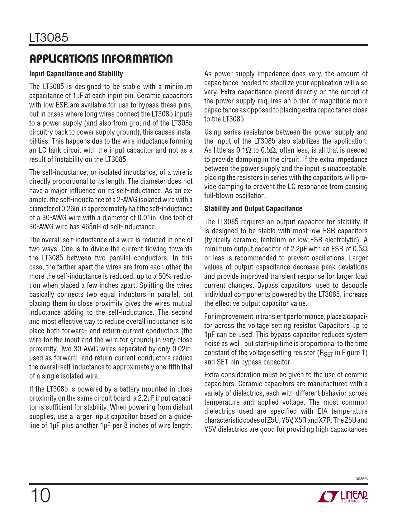 LT3085 APPLICATIONS INFORMATIONInput Capacitance and Stability As power supply impedance does vary, the amount of capacitance needed to stabilize your application will also The LT3085 is designed to be stable with a minimum vary. Extra capacitance placed directly on the output of capacitance of 1μF at each input pin. Ceramic capacitors the power supply requires an order of magnitude more with low ESR are available for use to bypass these pins, capacitance as opposed to placing extra capacitance close but in cases where long wires connect the LT3085 inputs to the LT3085. to a power supply (and also from ground of the LT3085 circuitry back to power supply ground), this causes insta- Using series resistance between the power supply and bilities. This happens due to the wire inductance forming the input of the LT3085 also stabilizes the application. an LC tank circuit with the input capacitor and not as a As little as 0.1Ω to 0.5Ω, often less, is all that is needed result of instability on the LT3085. to provide damping in the circuit. If the extra impedance between the power supply and the input is unacceptable, The self-inductance, or isolated inductance, of a wire is placing the resistors in series with the capacitors will pro- directly proportional to its length. The diameter does not vide damping to prevent the LC resonance from causing have a major infl uence on its self-inductance. As an ex- full-blown oscillation. ample, the self-inductance of a 2-AWG isolated wire with a diameter of 0.26in. is approximately half the self-inductance Stability and Output Capacitance of a 30-AWG wire with a diameter of 0.01in. One foot of The LT3085 requires an output capacitor for stability. It 30-AWG wire has 465nH of self-inductance. is designed to be stable with most low ESR capacitors The overall self-inductance of a wire is reduced in one of (typically ceramic, tantalum or low ESR electrolytic). A two ways. One is to divide the current fl owing towards minimum output capacitor of 2.2μF with an ESR of 0.5Ω the LT3085 between two parallel conductors. In this or less is recommended to prevent oscillations. Larger case, the farther apart the wires are from each other, the values of output capacitance decrease peak deviations more the self-inductance is reduced, up to a 50% reduc- and provide improved transient response for larger load tion when placed a few inches apart. Splitting the wires current changes. Bypass capacitors, used to decouple basically connects two equal inductors in parallel, but individual components powered by the LT3085, increase placing them in close proximity gives the wires mutual the effective output capacitor value. inductance adding to the self-inductance. The second For improvement in transient performance, place a capaci- and most effective way to reduce overall inductance is to tor across the voltage setting resistor. Capacitors up to place both forward- and return-current conductors (the 1μF can be used. This bypass capacitor reduces system wire for the input and the wire for ground) in very close noise as well, but start-up time is proportional to the time proximity. Two 30-AWG wires separated by only 0.02in. constant of the voltage setting resistor (R used as forward- and return-current conductors reduce SET in Figure 1) and SET pin bypass capacitor. the overall self-inductance to approximately one-fi fth that of a single isolated wire. Extra consideration must be given to the use of ceramic capacitors. Ceramic capacitors are manufactured with a If the LT3085 is powered by a battery mounted in close variety of dielectrics, each with different behavior across proximity on the same circuit board, a 2.2μF input capaci- temperature and applied voltage. The most common tor is suffi cient for stability. When powering from distant dielectrics used are specifi ed with EIA temperature supplies, use a larger input capacitor based on a guide- characteristic codes of Z5U, Y5V, X5R and X7R. The Z5U and line of 1μF plus another 1μF per 8 inches of wire length. Y5V dielectrics are good for providing high capacitances 3085fb 10 Document Outline FEATURES DESCRIPTION APPLICATIONS TYPICAL APPLICATION ABSOLUTE MAXIMUM RATINGS PIN CONFIGURATION ORDER INFORMATION ELECTRICAL CHARACTERISTICS TYPICAL PERFORMANCE CHARACTERISTICS PIN FUNCTIONS BLOCK DIAGRAM APPLICATIONS INFORMATION TYPICAL APPLICATIONS PACKAGE DESCRIPTION REVISION HISTORY TYPICAL APPLICATION RELATED PARTS
