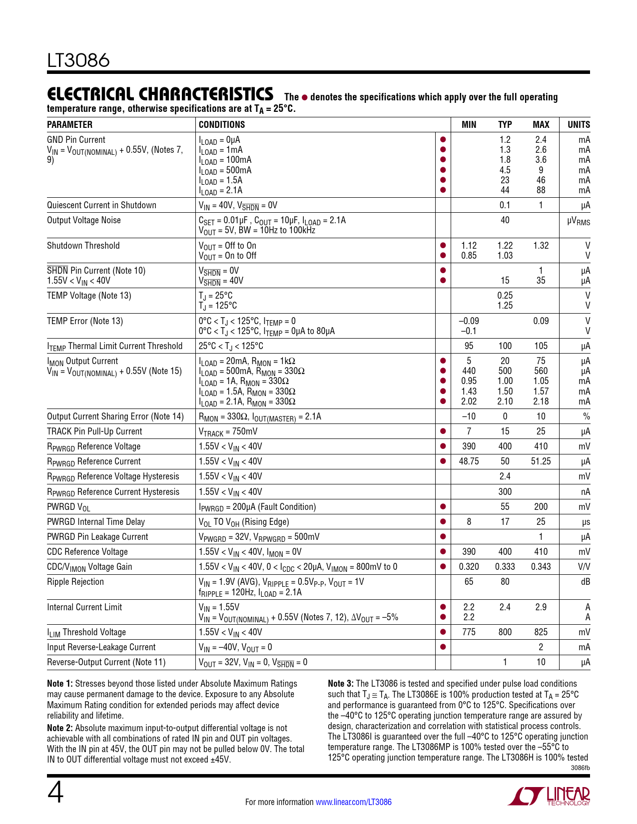 LT3086 e lecTrical characTerisTics The l denotes the specifications which apply over the full operatingtemperature range, otherwise specifications are at TA = 25°C. PARAMETERCONDITIONSMINTYPMAXUNITS GND Pin Current ILOAD = 0µA l 1.2 2.4 mA VIN = VOUT(NOMINAL) + 0.55V, (Notes 7, ILOAD = 1mA l 1.3 2.6 mA 9) ILOAD = 100mA l 1.8 3.6 mA ILOAD = 500mA l 4.5 9 mA ILOAD = 1.5A l 23 46 mA ILOAD = 2.1A l 44 88 mA Quiescent Current in Shutdown VIN = 40V, VSHDN = 0V 0.1 1 µA Output Voltage Noise CSET = 0.01µF , COUT = 10µF, ILOAD = 2.1A 40 µVRMS VOUT = 5V, BW = 10Hz to 100kHz Shutdown Threshold VOUT = Off to On l 1.12 1.22 1.32 V VOUT = On to Off l 0.85 1.03 V SHDN Pin Current (Note 10) VSHDN = 0V l 1 µA 1.55V < VIN < 40V VSHDN = 40V l 15 35 µA TEMP Voltage (Note 13) TJ = 25°C 0.25 V TJ = 125°C 1.25 V TEMP Error (Note 13) 0°C < TJ < 125°C, ITEMP = 0 –0.09 0.09 V 0°C < TJ < 125°C, ITEMP = 0µA to 80µA –0.1 V ITEMP Thermal Limit Current Threshold 25°C < TJ < 125°C 95 100 105 µA IMON Output Current ILOAD = 20mA, RMON = 1kΩ l 5 20 75 µA VIN = VOUT(NOMINAL) + 0.55V (Note 15) ILOAD = 500mA, RMON = 330Ω l 440 500 560 µA ILOAD = 1A, RMON = 330Ω l 0.95 1.00 1.05 mA ILOAD = 1.5A, RMON = 330Ω l 1.43 1.50 1.57 mA ILOAD = 2.1A, RMON = 330Ω l 2.02 2.10 2.18 mA Output Current Sharing Error (Note 14) RMON = 330Ω, IOUT(MASTER) = 2.1A –10 0 10 % TRACK Pin Pull-Up Current VTRACK = 750mV l 7 15 25 µA RPWRGD Reference Voltage 1.55V < VIN < 40V l 390 400 410 mV RPWRGD Reference Current 1.55V < VIN < 40V l 48.75 50 51.25 µA RPWRGD Reference Voltage Hysteresis 1.55V < VIN < 40V 2.4 mV RPWRGD Reference Current Hysteresis 1.55V < VIN < 40V 300 nA PWRGD VOL IPWRGD = 200µA (Fault Condition) l 55 200 mV PWRGD Internal Time Delay VOL TO VOH (Rising Edge) l 8 17 25 µs PWRGD Pin Leakage Current VPWGRD = 32V, VRPWGRD = 500mV l 1 µA CDC Reference Voltage 1.55V < VIN < 40V, IMON = 0V l 390 400 410 mV CDC/VIMON Voltage Gain 1.55V < VIN < 40V, 0 < ICDC < 20µA, VIMON = 800mV to 0 l 0.320 0.333 0.343 V/V Ripple Rejection VIN = 1.9V (AVG), VRIPPLE = 0.5VP-P, VOUT = 1V 65 80 dB fRIPPLE = 120Hz, ILOAD = 2.1A Internal Current Limit VIN = 1.55V l 2.2 2.4 2.9 A VIN = VOUT(NOMINAL) + 0.55V (Notes 7, 12), ∆VOUT = –5% l 2.2 A ILIM Threshold Voltage 1.55V < VIN < 40V l 775 800 825 mV Input Reverse-Leakage Current VIN = –40V, VOUT = 0 l 2 mA Reverse-Output Current (Note 11) VOUT = 32V, VIN = 0, VSHDN = 0 1 10 µA Note 1: Stresses beyond those listed under Absolute Maximum Ratings Note 3: The LT3086 is tested and specified under pulse load conditions may cause permanent damage to the device. Exposure to any Absolute such that TJ ≅ TA. The LT3086E is 100% production tested at TA = 25°C Maximum Rating condition for extended periods may affect device and performance is guaranteed from 0°C to 125°C. Specifications over reliability and lifetime. the –40°C to 125°C operating junction temperature range are assured by Note 2: Absolute maximum input-to-output differential voltage is not design, characterization and correlation with statistical process controls. achievable with all combinations of rated IN pin and OUT pin voltages. The LT3086I is guaranteed over the full –40°C to 125°C operating junction With the IN pin at 45V, the OUT pin may not be pulled below 0V. The total temperature range. The LT3086MP is 100% tested over the –55°C to IN to OUT differential voltage must not exceed ±45V. 125°C operating junction temperature range. The LT3086H is 100% tested 3086fb 4 For more information www.linear.com/LT3086 Document Outline Features Applications Description Typical Application Absolute Maximum Ratings Order Information Electrical Characteristics Typical Performance Characteristics Pin Functions Block Diagram Applications Information Typical Applications Package Description Revision History Typical Application Related Parts