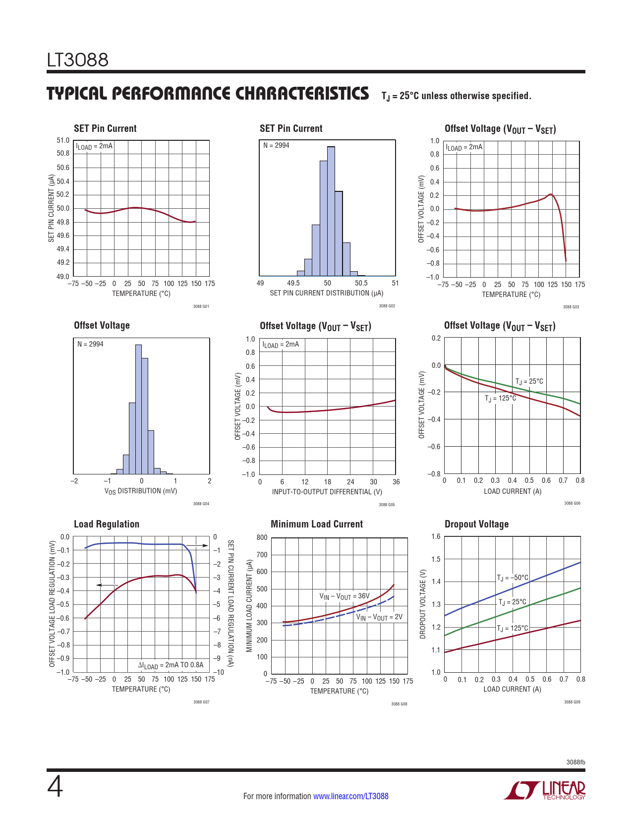 51.0 1.0 ILOAD = 2mA N = 2994 ILOAD = 2mA 50.8 0.8 50.6 0.6 50.4 0.4 50.2 0.2 50.0 0.0 49.8 –0.2 49.6 SET PIN CURRENT (µA) OFFSET VOLTAGE (mV) –0.4 49.4 –0.6 49.2 –0.8 49.0 –1.0 –75 –50 –25 0 25 50 75 100 125 150 175 49 49.5 50 50.5 51 –75 –50 –25 0 25 50 75 100 125 150 175 TEMPERATURE (°C) SET PIN CURRENT DISTRIBUTION (µA) TEMPERATURE (°C) 3088 G01 3088 G02 3088 G03