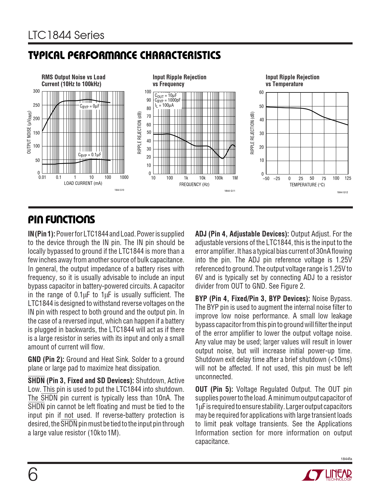 Noise Bypass. LTC1844 is designed to withstand reverse voltages on the The BYP pin is used to augment the internal noise filter to IN pin with respect to both ground and the output pin. In improve low noise performance. A small low leakage the case of a reversed input, which can happen if a battery bypass capacitor from this pin to ground will filter the input is plugged in backwards, the LTC1844 will act as if there of the error amplifier to lower the output voltage noise. is a large resistor in series with its input and only a small Any value may be used; larger values will result in lower amount of current will flow. output noise, but will increase initial power-up time.