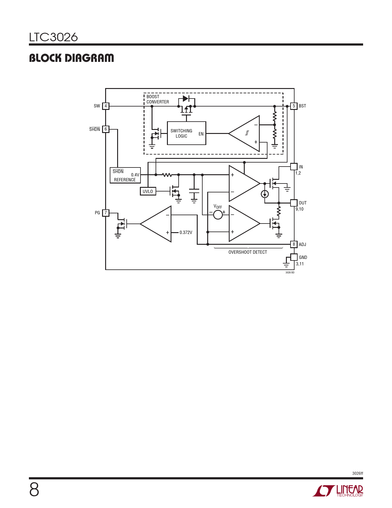 BOOST CONVERTER SW 4 5 BST – SHDN 6 SWITCHING LOGIC EN + IN SHDN 0.4V + 1,2 REFERENCE UVLO – OUT VOFF 9,10 PG 7 – – + – + 0.372V + 8 ADJ OVERSHOOT DETECT GND 3,11 3026 BD 3026ff 8 Document Outline Features Applications Description Typical Application Absolute Maximum Ratings Pin Configuration Order Information Electrical Characteristics Typical Performance Characteristics Pin Functions Block Diagram Operation Typical Applications Package Description Revision History Typical Application Related Parts