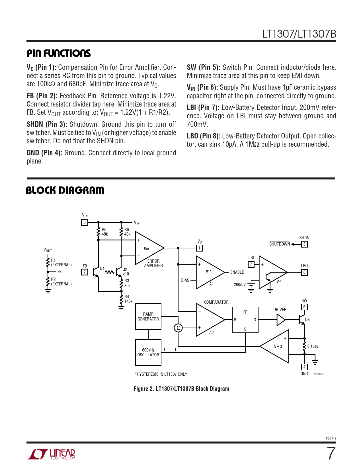 VIN 6 VIN R5 R6 40k 40k + SHDN VC SHUTDOWN 3 gm 1 VOUT – LBI R1 ERROR (EXTERNAL) + 7 + FB AMPLIFIER LBO Q1 Q2 FB 2 × * 10 ENABLE 8 R2 R3 BIAS – – A4 (EXTERNAL) A1 200mV 30k R4 140k COMPARATOR SW – 5 DRIVER FF RAMP GENERATOR + R Q Q3 + Σ S + A2 + A = 3 0.15Ω 600kHz OSCILLATOR – 4 *HYSTERESIS IN LT1307 ONLY GND 1307 F02