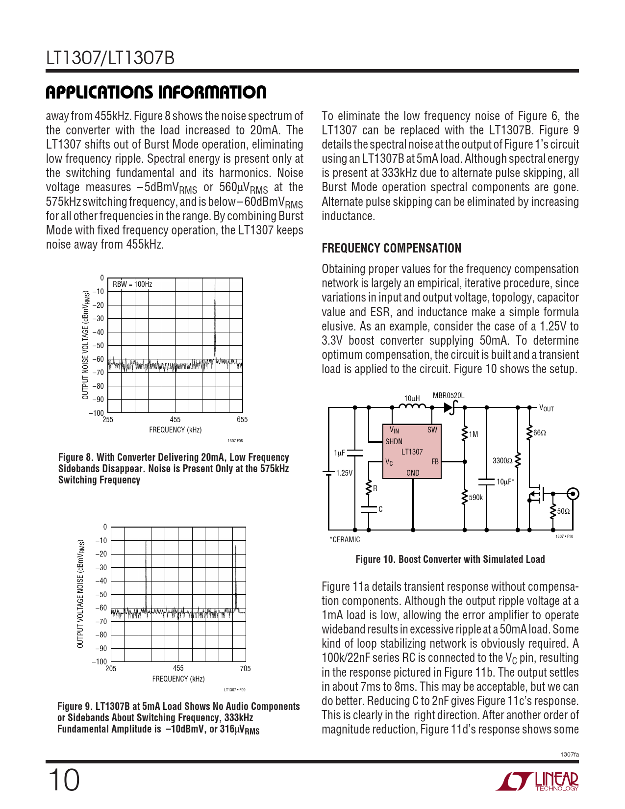 Obtaining proper values for the frequency compensation 0 RBW = 100Hz network is largely an empirical, iterative procedure, since ) –10 variations in input and output voltage, topology, capacitor RMS –20 value and ESR, and inductance make a simple formula –30 elusive. As an example, consider the case of a 1.25V to –40 3.3V boost converter supplying 50mA. To determine –50 optimum compensation, the circuit is built and a transient –60 –70 load is applied to the circuit. Figure 10 shows the setup. –80 OUTPUT NOISE VOLTAGE (dBmV –90 10µH MBR0520L VOUT –100255 455 655 FREQUENCY (kHz) VIN SW 1M 66Ω 1307 F08 SHDN 1µF LT1307