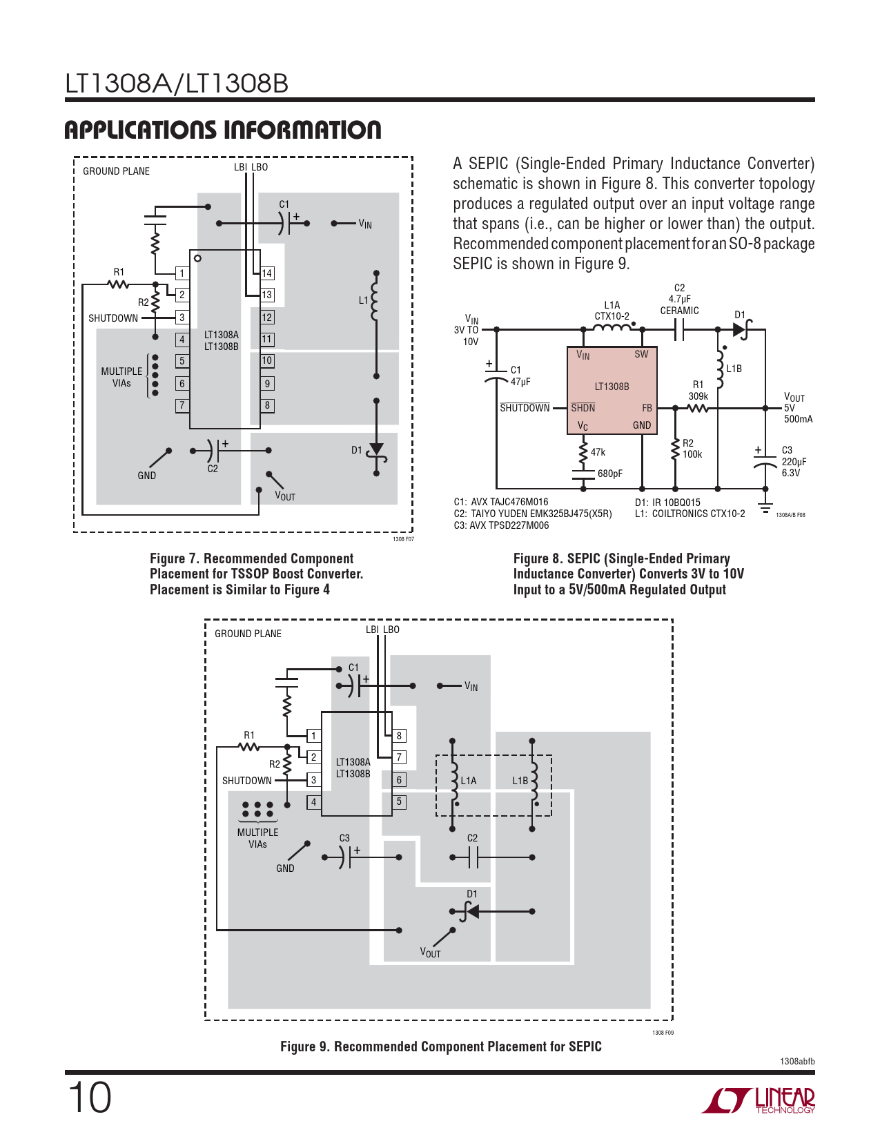 LBI LBO A SEPIC (Single-Ended Primary Inductance Converter) GROUND PLANE schematic is shown in Figure 8. This converter topology C1 produces a regulated output over an input voltage range + VIN that spans (i.e., can be higher or lower than) the output. Recommended component placement for an SO-8 package SEPIC is shown in Figure 9. R1 1 14 C2 2 13 R2 L1 4.7μF L1A CERAMIC SHUTDOWN 3 12 CTX10-2 D1 VIN 3V TO 4 LT1308A 11 10V LT1308B V 5 10 IN SW + MULTIPLE C1 L1B VIAs 6 9 47μF LT1308B R1 309k VOUT 7 8 SHUTDOWN SHDN FB 5V 500mA VC GND + R2 D1 47k + 100k C3 220μF C2 GND 680pF 6.3V VOUT C1: AVX TAJC476M016 D1: IR 10BQ015 C2: TAIYO YUDEN EMK325BJ475(X5R) L1: COILTRONICS CTX10-2 1308A/B F08 C3: AVX TPSD227M006 1308 F07