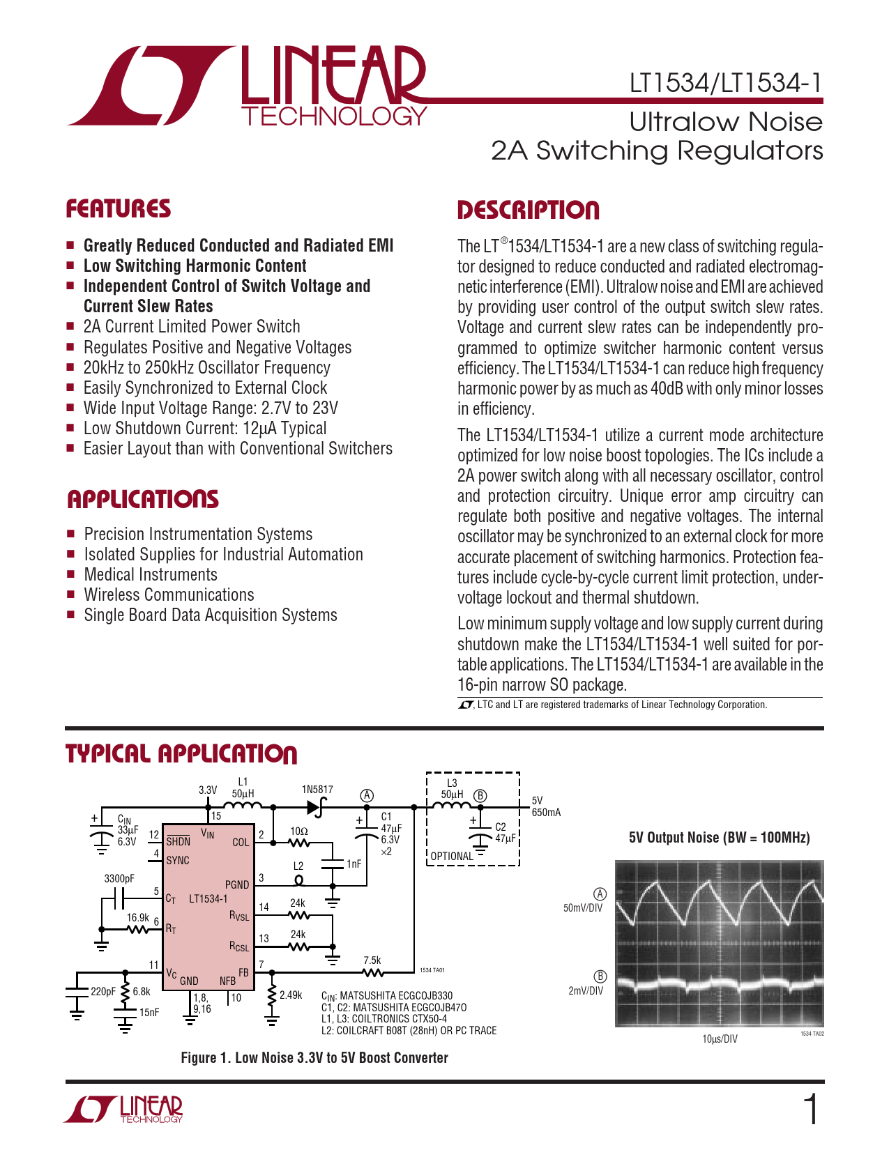 LT1534/LT1534-1 Ultralow Noise 2A Switching Regulators