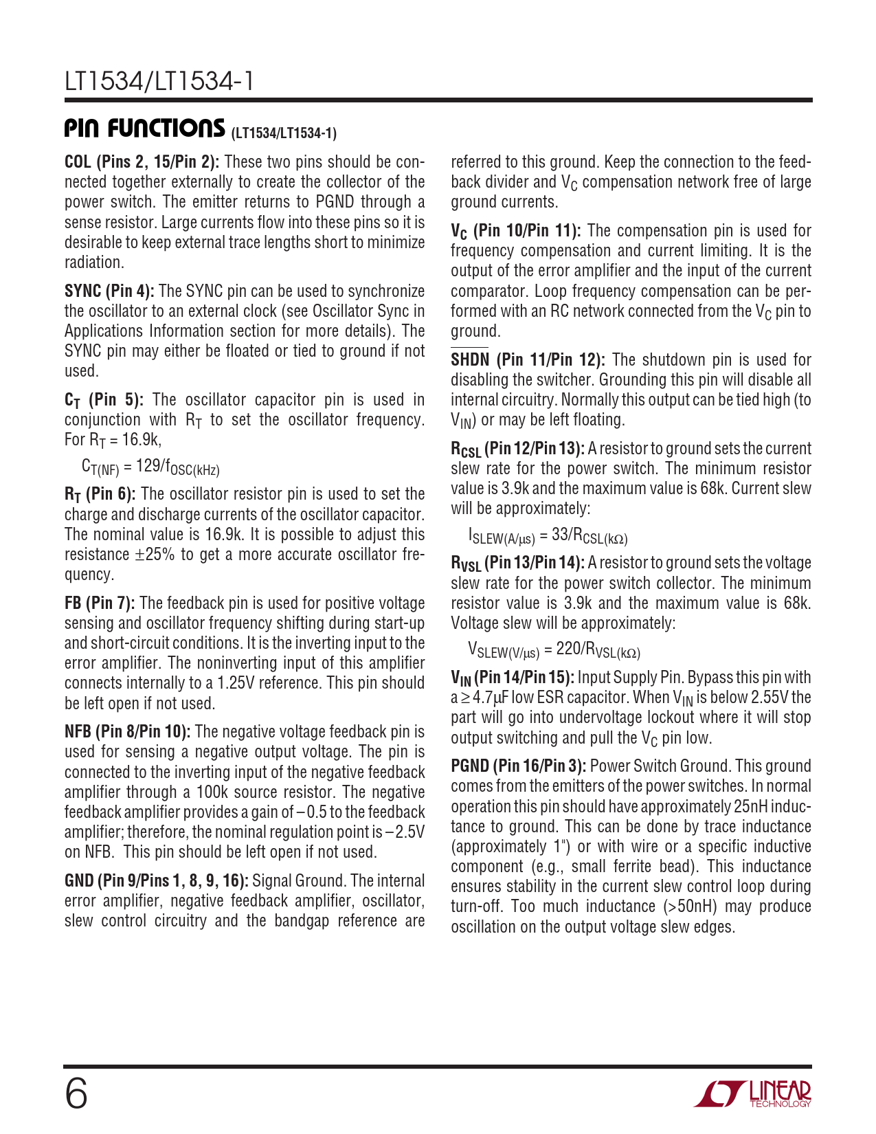PIN FUNCTIONS (LT1534/LT1534-1) COL (Pins 2, 15/Pin 2): VC (Pin 10/Pin 11): SYNC (Pin 4): SHDN (Pin 11/Pin 12): T (Pin 5):