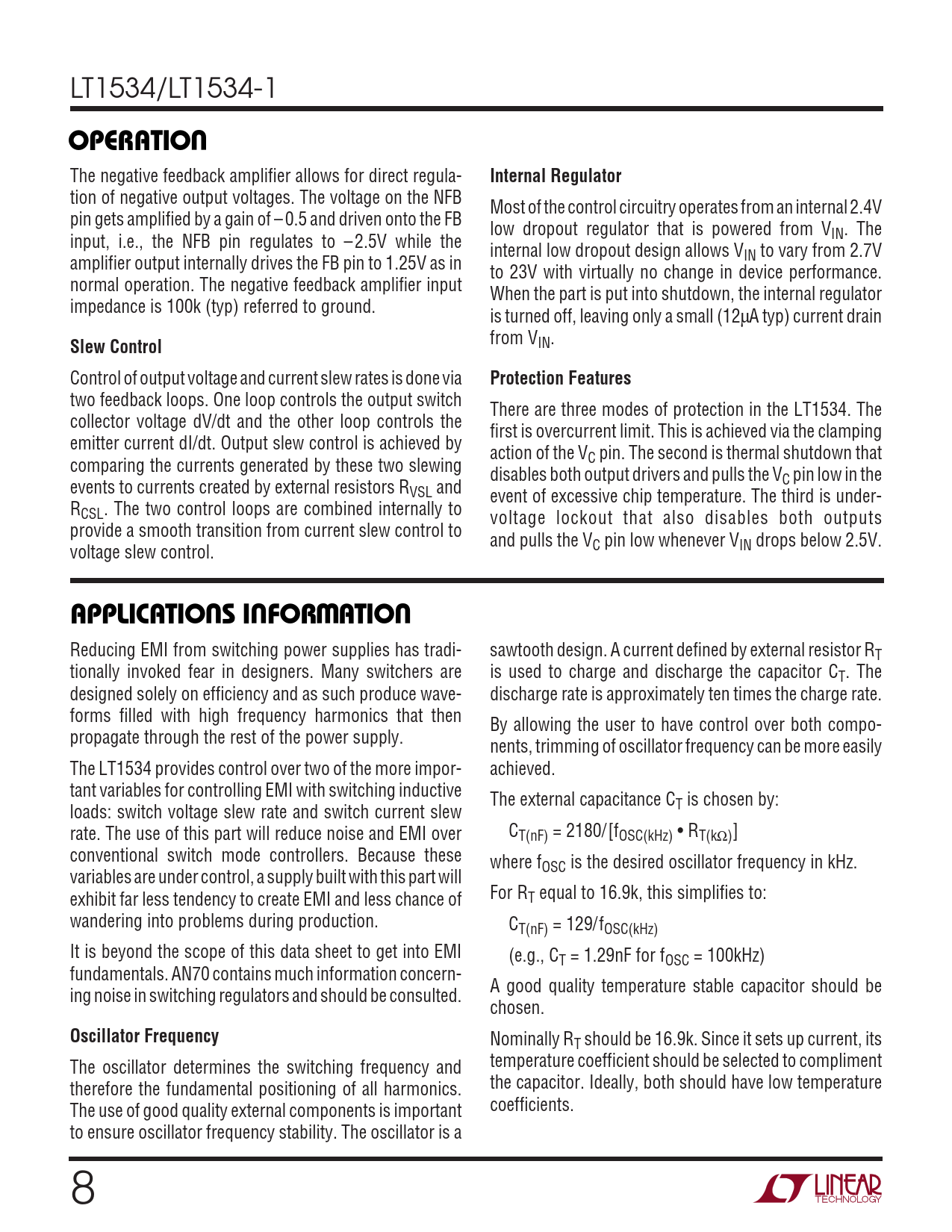 LT1534/LT1534-1 UOPERATIO The negative feedback amplifier allows for direct regula- Internal Regulator tion of negative output voltages. The voltage on the NFB Most of the control circuitry operates from an internal 2.4V pin gets amplified by a gain of – 0.5 and driven onto the FB low dropout regulator that is powered from V input, i.e., the NFB pin regulates to – 2.5V while the IN. The internal low dropout design allows V amplifier output internally drives the FB pin to 1.25V as in IN to vary from 2.7V to 23V with virtually no change in device performance. normal operation. The negative feedback amplifier input When the part is put into shutdown, the internal regulator impedance is 100k (typ) referred to ground. is turned off, leaving only a small (12µA typ) current drain from V Slew Control IN. Control of output voltage and current slew rates is done via Protection Features two feedback loops. One loop controls the output switch There are three modes of protection in the LT1534. The collector voltage dV/dt and the other loop controls the first is overcurrent limit. This is achieved via the clamping emitter current dI/dt. Output slew control is achieved by action of the V comparing the currents generated by these two slewing C pin. The second is thermal shutdown that disables both output drivers and pulls the V events to currents created by external resistors R C pin low in the VSL and event of excessive chip temperature. The third is under- RCSL. The two control loops are combined internally to voltage lockout that also disables both outputs provide a smooth transition from current slew control to and pulls the V voltage slew control. C pin low whenever VIN drops below 2.5V. UUWUAPPLICATIONS INFORMATION Reducing EMI from switching power supplies has tradi- sawtooth design. A current defined by external resistor RT tionally invoked fear in designers. Many switchers are is used to charge and discharge the capacitor CT. The designed solely on efficiency and as such produce wave- discharge rate is approximately ten times the charge rate. forms filled with high frequency harmonics that then By allowing the user to have control over both compo- propagate through the rest of the power supply. nents, trimming of oscillator frequency can be more easily The LT1534 provides control over two of the more impor- achieved. tant variables for controlling EMI with switching inductive The external capacitance C loads: switch voltage slew rate and switch current slew T is chosen by: rate. The use of this part will reduce noise and EMI over CT(nF) = 2180/[fOSC(kHz) • RT(kΩ)] conventional switch mode controllers. Because these where fOSC is the desired oscillator frequency in kHz. variables are under control, a supply built with this part will exhibit far less tendency to create EMI and less chance of For RT equal to 16.9k, this simplifies to: wandering into problems during production. CT(nF) = 129/fOSC(kHz) It is beyond the scope of this data sheet to get into EMI (e.g., CT = 1.29nF for fOSC = 100kHz) fundamentals. AN70 contains much information concern- A good quality temperature stable capacitor should be ing noise in switching regulators and should be consulted. chosen. Oscillator Frequency Nominally RT should be 16.9k. Since it sets up current, its The oscillator determines the switching frequency and temperature coefficient should be selected to compliment therefore the fundamental positioning of all harmonics. the capacitor. Ideally, both should have low temperature The use of good quality external components is important coefficients. to ensure oscillator frequency stability. The oscillator is a 8