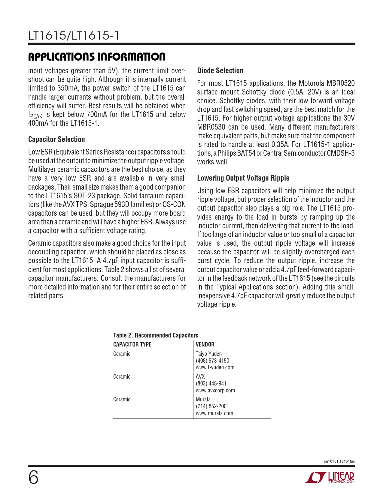 packages. Their small size makes them a good companion Using low ESR capacitors will help minimize the output to the LT1615’s SOT-23 package. Solid tantalum capaci- ripple voltage, but proper selection of the inductor and the tors (like the AVX TPS, Sprague 593D families) or OS-CON output capacitor also plays a big role. The LT1615 pro- capacitors can be used, but they will occupy more board vides energy to the load in bursts by ramping up the area than a ceramic and will have a higher ESR. Always use inductor current, then delivering that current to the load. a capacitor with a sufficient voltage rating. If too large of an inductor value or too small of a capacitor Ceramic capacitors also make a good choice for the input value is used, the output ripple voltage will increase decoupling capacitor, which should be placed as close as because the capacitor will be slightly overcharged each possible to the LT1615. A 4.7µF input capacitor is suffi- burst cycle. To reduce the output ripple, increase the cient for most applications. Table 2 shows a list of several output capacitor value or add a 4.7pF feed-forward capaci- capacitor manufacturers. Consult the manufacturers for tor in the feedback network of the LT1615 (see the circuits more detailed information and for their entire selection of in the Typical Applications section). Adding this small, related parts. inexpensive 4.7pF capacitor will greatly reduce the output voltage ripple.