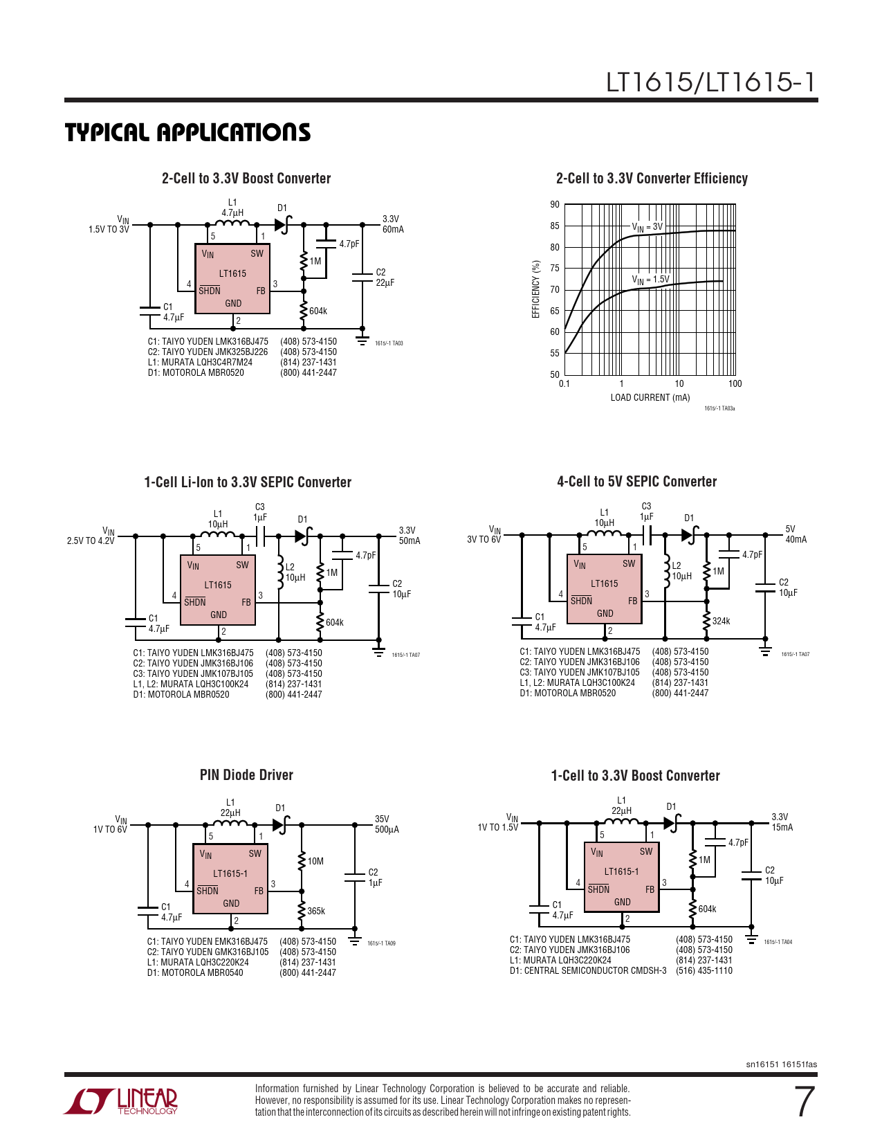 L1 L1 D1 D1 22 22µH µH 35V V V IN 3.3V IN 500 1V TO 1.5V 15mA 1V TO 6V µA 5 1 5 1 4.7pF V V IN SW IN SW 1M 10M C2 LT1615-1 C2 LT1615-1 4 3 1µF 4 3 10µF SHDN FB SHDN FB GND GND C1 C1 604k 365k 4.7 4.7µF µF 2 2 C1: TAIYO YUDEN LMK316BJ475 (408) 573-4150 C1: TAIYO YUDEN EMK316BJ475 (408) 573-4150 1615/-1 TA04 1615/-1 TA09 C2: TAIYO YUDEN JMK316BJ106 (408) 573-4150 C2: TAIYO YUDEN GMK316BJ105 (408) 573-4150 L1: MURATA LQH3C220K24 (814) 237-1431 L1: MURATA LQH3C220K24 (814) 237-1431 D1: CENTRAL SEMICONDUCTOR CMDSH-3 (516) 435-1110 D1: MOTOROLA MBR0540 (800) 441-2447 sn16151 16151fas Information furnished by Linear Technology Corporation is believed to be accurate and reliable. However, no responsibility is assumed for its use. Linear Technology Corporation makes no represen- tation that the interconnection of its circuits as described herein will not infringe on existing patent rights. 7
