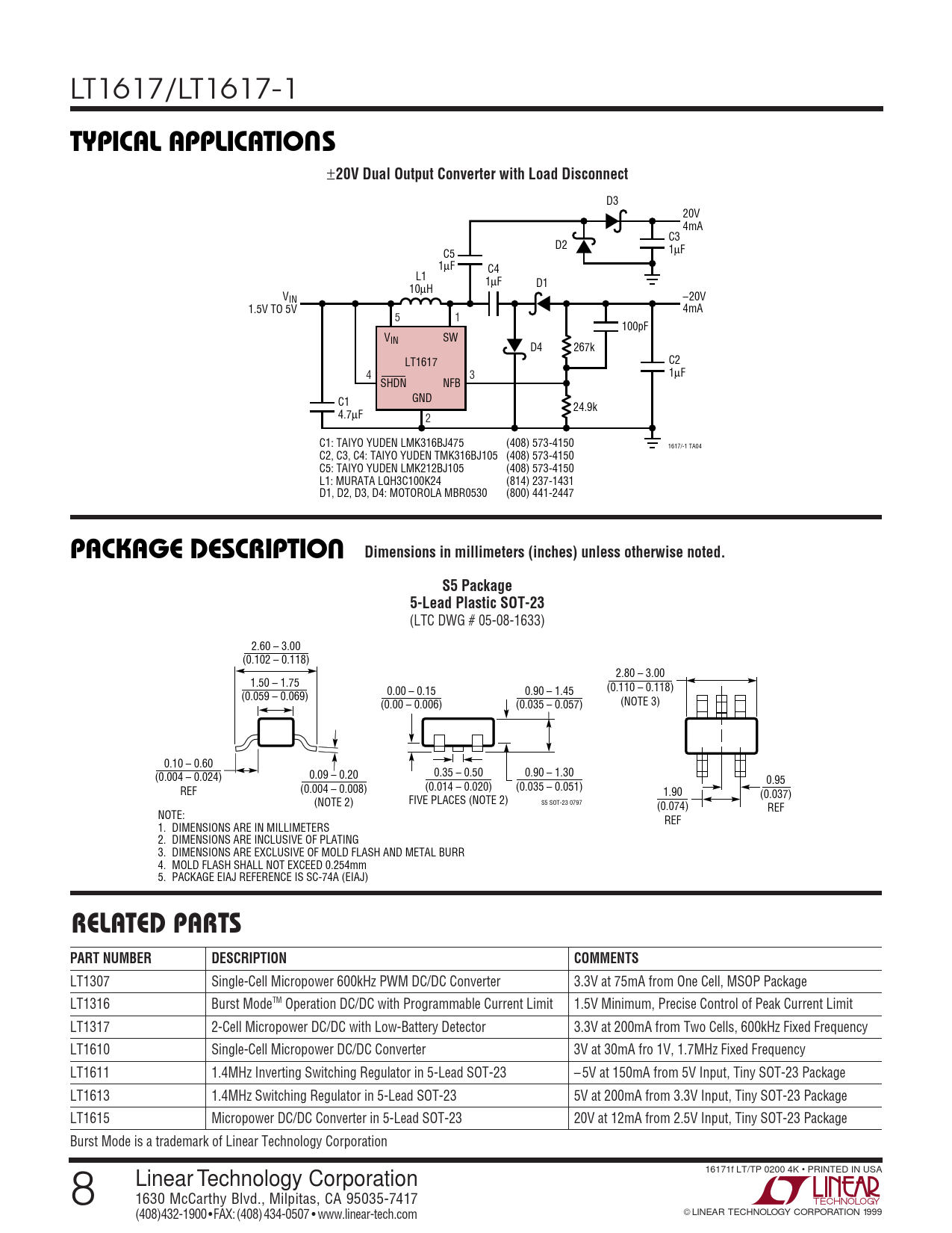 LT1307 Single-Cell Micropower 600kHz PWM DC/DC Converter 3.3V at 75mA from One Cell, MSOP Package LT1316 Burst ModeTM Operation DC/DC with Programmable Current Limit 1.5V Minimum, Precise Control of Peak Current Limit LT1317 2-Cell Micropower DC/DC with Low-Battery Detector 3.3V at 200mA from Two Cells, 600kHz Fixed Frequency LT1610 Single-Cell Micropower DC/DC Converter 3V at 30mA fro 1V, 1.7MHz Fixed Frequency LT1611 1.4MHz Inverting Switching Regulator in 5-Lead SOT-23 – 5V at 150mA from 5V Input, Tiny SOT-23 Package LT1613 1.4MHz Switching Regulator in 5-Lead SOT-23 5V at 200mA from 3.3V Input, Tiny SOT-23 Package LT1615 Micropower DC/DC Converter in 5-Lead SOT-23 20V at 12mA from 2.5V Input, Tiny SOT-23 Package Burst Mode is a trademark of Linear Technology Corporation 16171f LT/TP 0200 4K • PRINTED IN USA 8 Linear Technology Corporation 1630 McCarthy Blvd., Milpitas, CA 95035-7417 (408) 432-1900 ● FAX: (408) 434-0507 ● www.linear-tech.com LINEAR TECHNOLOGY CORPORATION 1999