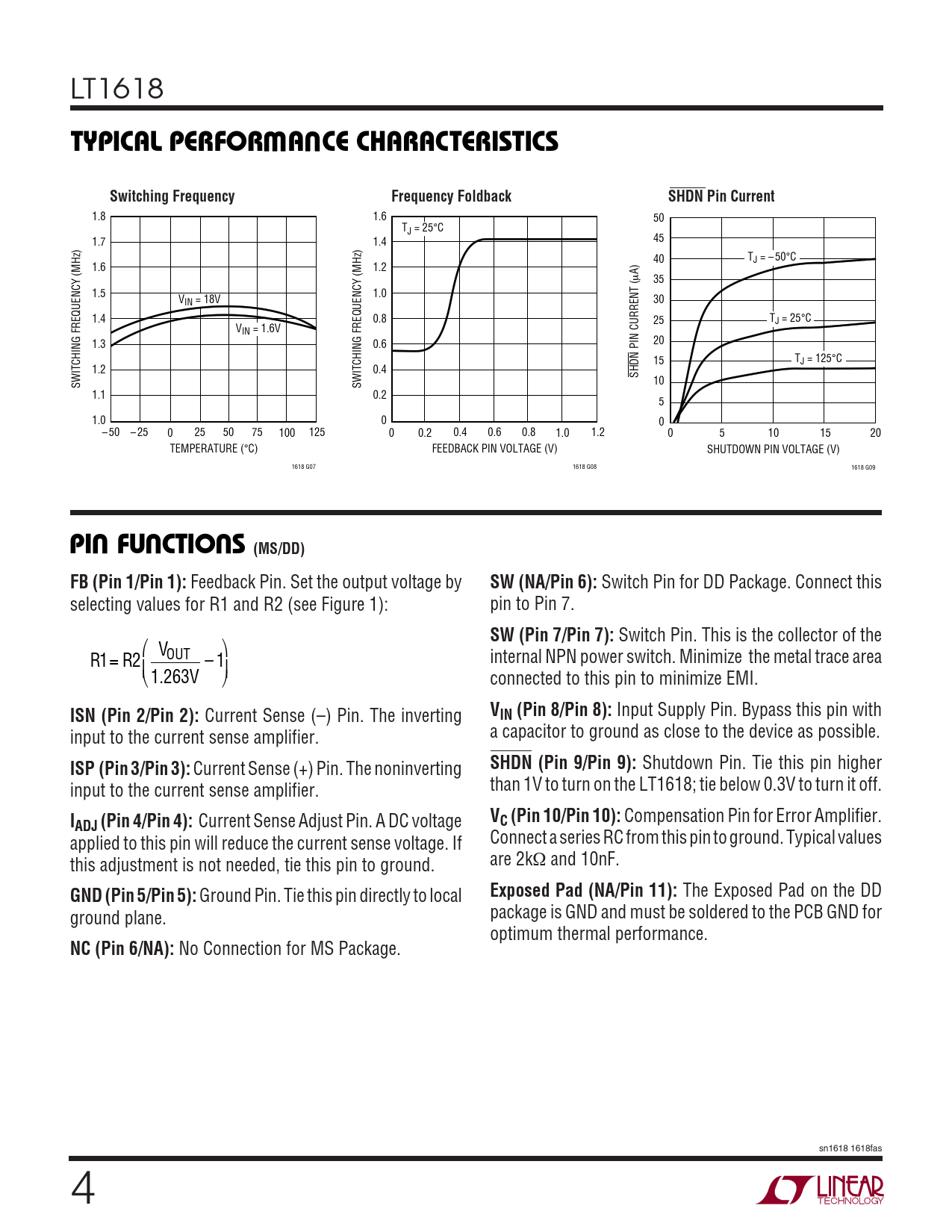 LT1618 WUTYPICAL PERFOR A CE CHARACTERISTICSSwitching FrequencyFrequency FoldbackSHDN Pin Current 1.8 1.6 50 TJ = 25°C 1.7 1.4 45 40 TJ = – 50°C 1.6 1.2 A) µ 35 1.5 1.0 VIN = 18V 30 1.4 0.8 25 TJ = 25°C VIN = 1.6V 1.3 0.6 20 15 TJ = 125°C 1.2 0.4 SHDN PIN CURRENT ( SWITCHING FREQUENCY (MHz) SWITCHING FREQUENCY (MHz) 10 1.1 0.2 5 1.0 0 0 – 50 – 25 0 25 50 75 100 125 0 0.2 0.4 0.6 0.8 1.0 1.2 0 5 10 15 20 TEMPERATURE (°C) FEEDBACK PIN VOLTAGE (V) SHUTDOWN PIN VOLTAGE (V) 1618 G07 1618 G08 1618 G09 UUUPIN FUNCTIONS (MS/DD)FB (Pin 1/Pin 1): Feedback Pin. Set the output voltage by SW (NA/Pin 6): Switch Pin for DD Package. Connect this selecting values for R1 and R2 (see Figure 1): pin to Pin 7. SW (Pin 7/Pin 7): Switch Pin. This is the collector of the ⎛ V ⎞ R = R OUT 1 2 – 1 internal NPN power switch. Minimize the metal trace area ⎜ ⎟ ⎝ 1. V 263 ⎠ connected to this pin to minimize EMI. ISN (Pin 2/Pin 2): Current Sense (–) Pin. The inverting VIN (Pin 8/Pin 8): Input Supply Pin. Bypass this pin with input to the current sense amplifier. a capacitor to ground as close to the device as possible. ISP (Pin 3/Pin 3): Current Sense (+) Pin. The noninverting SHDN (Pin 9/Pin 9): Shutdown Pin. Tie this pin higher input to the current sense amplifier. than 1V to turn on the LT1618; tie below 0.3V to turn it off. IVADJ (Pin 4/Pin 4): Current Sense Adjust Pin. A DC voltage C (Pin 10/Pin 10): Compensation Pin for Error Amplifier. applied to this pin will reduce the current sense voltage. If Connect a series RC from this pin to ground. Typical values this adjustment is not needed, tie this pin to ground. are 2kΩ and 10nF. GND (Pin 5/Pin 5): Ground Pin. Tie this pin directly to local Exposed Pad (NA/Pin 11): The Exposed Pad on the DD ground plane. package is GND and must be soldered to the PCB GND for optimum thermal performance. NC (Pin 6/NA): No Connection for MS Package. sn1618 1618fas 4
