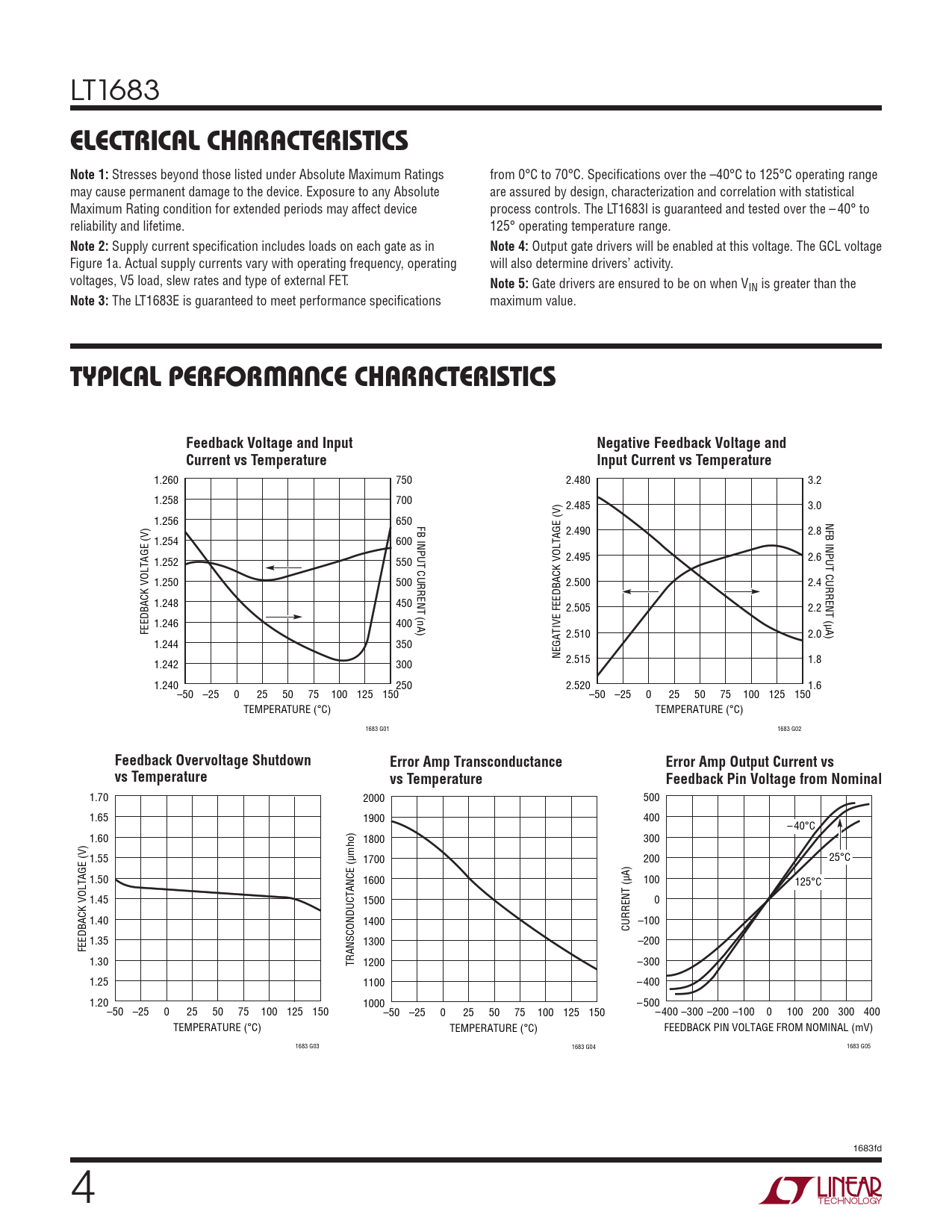 LT1683 ELECTRICAL CHARACTERISTICS Note 1: Stresses beyond those listed under Absolute Maximum Ratings from 0°C to 70°C. Specifications over the –40°C to 125°C operating range may cause permanent damage to the device. Exposure to any Absolute are assured by design, characterization and correlation with statistical Maximum Rating condition for extended periods may affect device process controls. The LT1683I is guaranteed and tested over the –40° to reliability and lifetime. 125° operating temperature range. Note 2: Supply current specification includes loads on each gate as in Note 4: Output gate drivers will be enabled at this voltage. The GCL voltage Figure 1a. Actual supply currents vary with operating frequency, operating will also determine drivers’ activity. voltages, V5 load, slew rates and type of external FET. Note 5: Gate drivers are ensured to be on when VIN is greater than the Note 3: The LT1683E is guaranteed to meet performance specifications maximum value. TYPICAL PERFORMANCE CHARACTERISTICSFeedback Voltage and InputNegative Feedback Voltage andCurrent vs TemperatureInput Current vs Temperature 1.260 750 2.480 3.2 1.258 700 2.485 3.0 1.256 650 FB INPUT CURRENT (nA) NFB INPUT CURRENT (µA) 2.490 2.8 1.254 600 1.252 550 2.495 2.6 1.250 500 2.500 2.4 1.248 450 2.505 2.2 1.246 400 FEEDBACK VOLTAGE (V) 2.510 2.0 1.244 350 NEGATIVE FEEDBACK VOLTAGE (V) 1.242 300 2.515 1.8 1.240 250 2.520 1.6 –50 –25 0 25 50 75 100 125 150 –50 –25 0 25 50 75 100 125 150 TEMPERATURE (°C) TEMPERATURE (°C) 1683 G01 1683 G02 Feedback Overvoltage ShutdownError Amp TransconductanceError Amp Output Current vsvs Temperaturevs TemperatureFeedback Pin Voltage from Nominal 1.70 2000 500 1.65 1900 400 –40°C 1.60 1800 300 1.55 1700 200 25°C 1.50 1600 100 125°C 1.45 1500 0 1.40 1400 –100 CURRENT (µA) 1.35 1300 –200 FEEDBACK VOLTAGE (V) 1.30 TRANSCONDUCTANCE (µmho) 1200 –300 1.25 1100 –400 1.20 1000 –500 –50 –25 0 25 50 75 100 125 150 –50 –25 0 25 50 75 100 125 150 –400 –300 –200 –100 0 100 200 300 400 TEMPERATURE (°C) TEMPERATURE (°C) FEEDBACK PIN VOLTAGE FROM NOMINAL (mV) 1683 G03 1683 G04 1683 G05 1683fd 4 Document Outline Features Applications Description Typical Application Absolute Maximum Ratings Pin Configuration Order Information Electrical Characteristics Typical Performance Characteristics Pin Functions Test Circuits Block Diagram Operation Applications Information Typical Applications Package Description Revision History Typical Application Related Parts