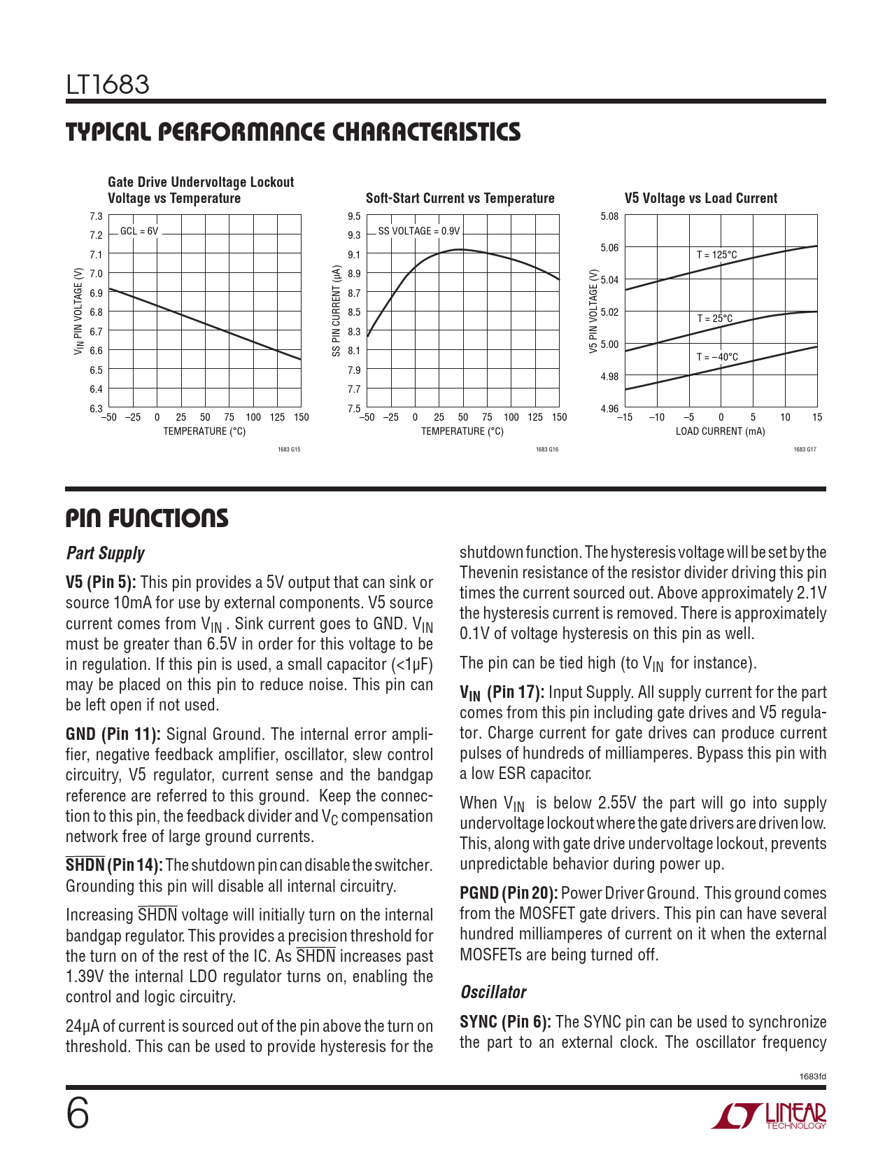 LT1683 TYPICAL PERFORMANCE CHARACTERISTICSGate Drive Undervoltage LockoutVoltage vs TemperatureSoft-Start Current vs TemperatureV5 Voltage vs Load Current 7.3 9.5 5.08 7.2 GCL = 6V 9.3 SS VOLTAGE = 0.9V 5.06 7.1 9.1 T = 125°C 7.0 8.9 5.04 6.9 8.7 6.8 8.5 5.02 T = 25°C 6.7 8.3 PIN VOLTAGE (V) 5.00 V IN 6.6 SS PIN CURRENT (µA) 8.1 V5 PIN VOLTAGE (V) T = –40°C 6.5 7.9 4.98 6.4 7.7 6.3 7.5 4.96 –50 –25 0 25 50 75 100 125 150 –50 –25 0 25 50 75 100 125 150 –15 –10 –5 0 5 10 15 TEMPERATURE (°C) TEMPERATURE (°C) LOAD CURRENT (mA) 1683 G15 1683 G16 1683 G17 PIN FUNCTIONSPart Supply shutdown function. The hysteresis voltage will be set by the V5 (Pin 5): This pin provides a 5V output that can sink or Thevenin resistance of the resistor divider driving this pin source 10mA for use by external components. V5 source times the current sourced out. Above approximately 2.1V current comes from V the hysteresis current is removed. There is approximately IN . Sink current goes to GND. VIN must be greater than 6.5V in order for this voltage to be 0.1V of voltage hysteresis on this pin as well. in regulation. If this pin is used, a small capacitor (<1µF) The pin can be tied high (to VIN for instance). may be placed on this pin to reduce noise. This pin can V be left open if not used. IN (Pin 17): Input Supply. All supply current for the part comes from this pin including gate drives and V5 regula- GND (Pin 11): Signal Ground. The internal error ampli- tor. Charge current for gate drives can produce current fier, negative feedback amplifier, oscillator, slew control pulses of hundreds of milliamperes. Bypass this pin with circuitry, V5 regulator, current sense and the bandgap a low ESR capacitor. reference are referred to this ground. Keep the connec- When V tion to this pin, the feedback divider and V IN is below 2.55V the part will go into supply C compensation undervoltage lockout where the gate drivers are driven low. network free of large ground currents. This, along with gate drive undervoltage lockout, prevents SHDN (Pin 14): The shutdown pin can disable the switcher. unpredictable behavior during power up. Grounding this pin will disable all internal circuitry. PGND (Pin 20): Power Driver Ground. This ground comes Increasing SHDN voltage will initially turn on the internal from the MOSFET gate drivers. This pin can have several bandgap regulator. This provides a precision threshold for hundred milliamperes of current on it when the external the turn on of the rest of the IC. As SHDN increases past MOSFETs are being turned off. 1.39V the internal LDO regulator turns on, enabling the control and logic circuitry. Oscillator 24µA of current is sourced out of the pin above the turn on SYNC (Pin 6): The SYNC pin can be used to synchronize threshold. This can be used to provide hysteresis for the the part to an external clock. The oscillator frequency 1683fd 6 Document Outline Features Applications Description Typical Application Absolute Maximum Ratings Pin Configuration Order Information Electrical Characteristics Typical Performance Characteristics Pin Functions Test Circuits Block Diagram Operation Applications Information Typical Applications Package Description Revision History Typical Application Related Parts