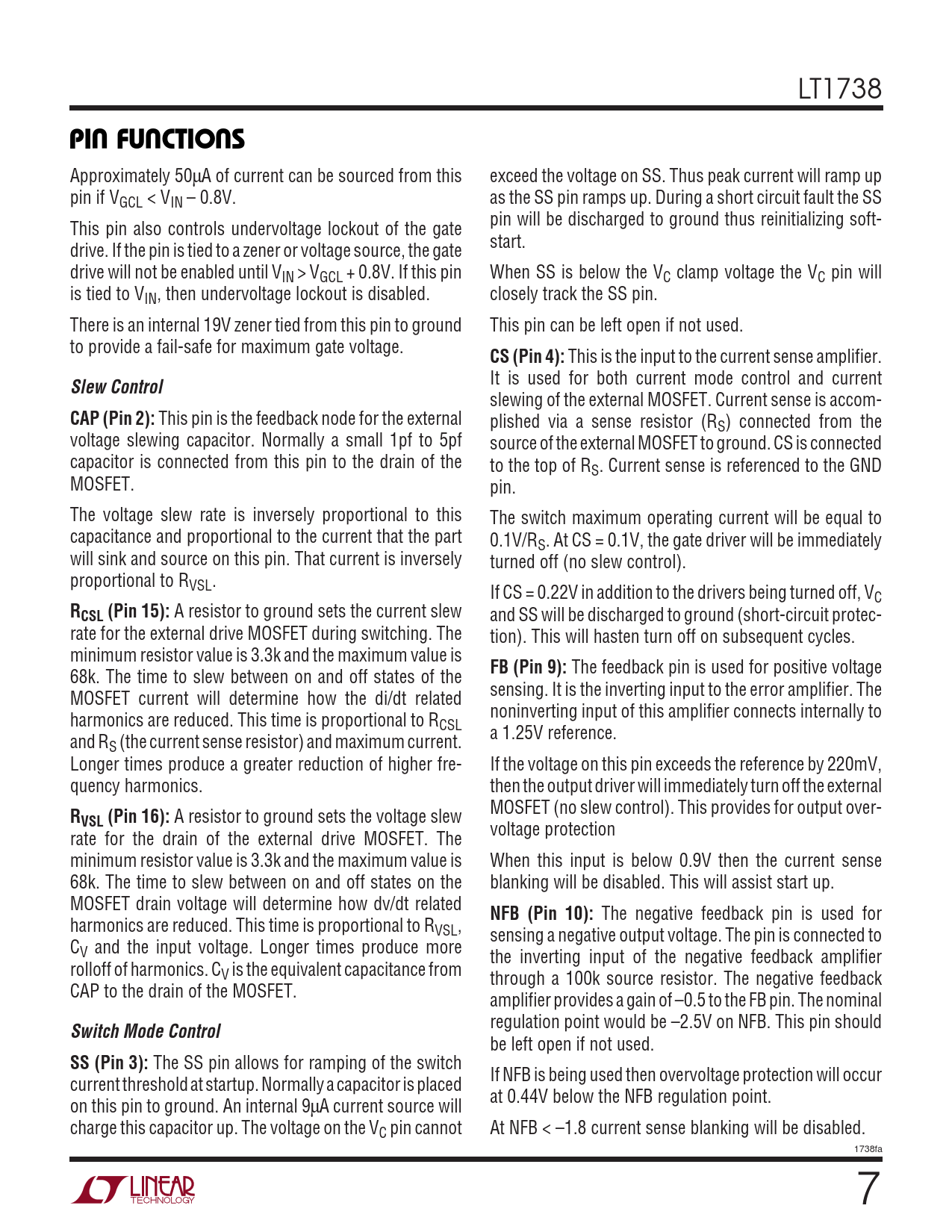 LT1738 UUUPI FU CTIO S Approximately 50µA of current can be sourced from this exceed the voltage on SS. Thus peak current will ramp up pin if VGCL < VIN – 0.8V. as the SS pin ramps up. During a short circuit fault the SS pin will be discharged to ground thus reinitializing soft- This pin also controls undervoltage lockout of the gate start. drive. If the pin is tied to a zener or voltage source, the gate drive will not be enabled until VIN > VGCL + 0.8V. If this pin When SS is below the VC clamp voltage the VC pin will is tied to VIN, then undervoltage lockout is disabled. closely track the SS pin. There is an internal 19V zener tied from this pin to ground This pin can be left open if not used. to provide a fail-safe for maximum gate voltage. CS (Pin 4): This is the input to the current sense amplifier. It is used for both current mode control and current Slew Control slewing of the external MOSFET. Current sense is accom- CAP (Pin 2): This pin is the feedback node for the external plished via a sense resistor (RS) connected from the voltage slewing capacitor. Normally a small 1pf to 5pf source of the external MOSFET to ground. CS is connected capacitor is connected from this pin to the drain of the to the top of RS. Current sense is referenced to the GND MOSFET. pin. The voltage slew rate is inversely proportional to this The switch maximum operating current will be equal to capacitance and proportional to the current that the part 0.1V/RS. At CS = 0.1V, the gate driver will be immediately will sink and source on this pin. That current is inversely turned off (no slew control). proportional to RVSL. If CS = 0.22V in addition to the drivers being turned off, VC RCSL (Pin 15): A resistor to ground sets the current slew and SS will be discharged to ground (short-circuit protec- rate for the external drive MOSFET during switching. The tion). This will hasten turn off on subsequent cycles. minimum resistor value is 3.3k and the maximum value is FB (Pin 9): The feedback pin is used for positive voltage 68k. The time to slew between on and off states of the sensing. It is the inverting input to the error amplifier. The MOSFET current will determine how the di/dt related noninverting input of this amplifier connects internally to harmonics are reduced. This time is proportional to RCSL a 1.25V reference. and RS (the current sense resistor) and maximum current. Longer times produce a greater reduction of higher fre- If the voltage on this pin exceeds the reference by 220mV, quency harmonics. then the output driver will immediately turn off the external MOSFET (no slew control). This provides for output over- RVSL (Pin 16): A resistor to ground sets the voltage slew voltage protection rate for the drain of the external drive MOSFET. The minimum resistor value is 3.3k and the maximum value is When this input is below 0.9V then the current sense 68k. The time to slew between on and off states on the blanking will be disabled. This will assist start up. MOSFET drain voltage will determine how dv/dt related NFB (Pin 10): The negative feedback pin is used for harmonics are reduced. This time is proportional to RVSL, sensing a negative output voltage. The pin is connected to CV and the input voltage. Longer times produce more the inverting input of the negative feedback amplifier rolloff of harmonics. CV is the equivalent capacitance from through a 100k source resistor. The negative feedback CAP to the drain of the MOSFET. amplifier provides a gain of –0.5 to the FB pin. The nominal regulation point would be –2.5V on NFB. This pin should Switch Mode Control be left open if not used. SS (Pin 3): The SS pin allows for ramping of the switch If NFB is being used then overvoltage protection will occur current threshold at startup. Normally a capacitor is placed at 0.44V below the NFB regulation point. on this pin to ground. An internal 9µA current source will charge this capacitor up. The voltage on the VC pin cannot At NFB < –1.8 current sense blanking will be disabled. 1738fa 7