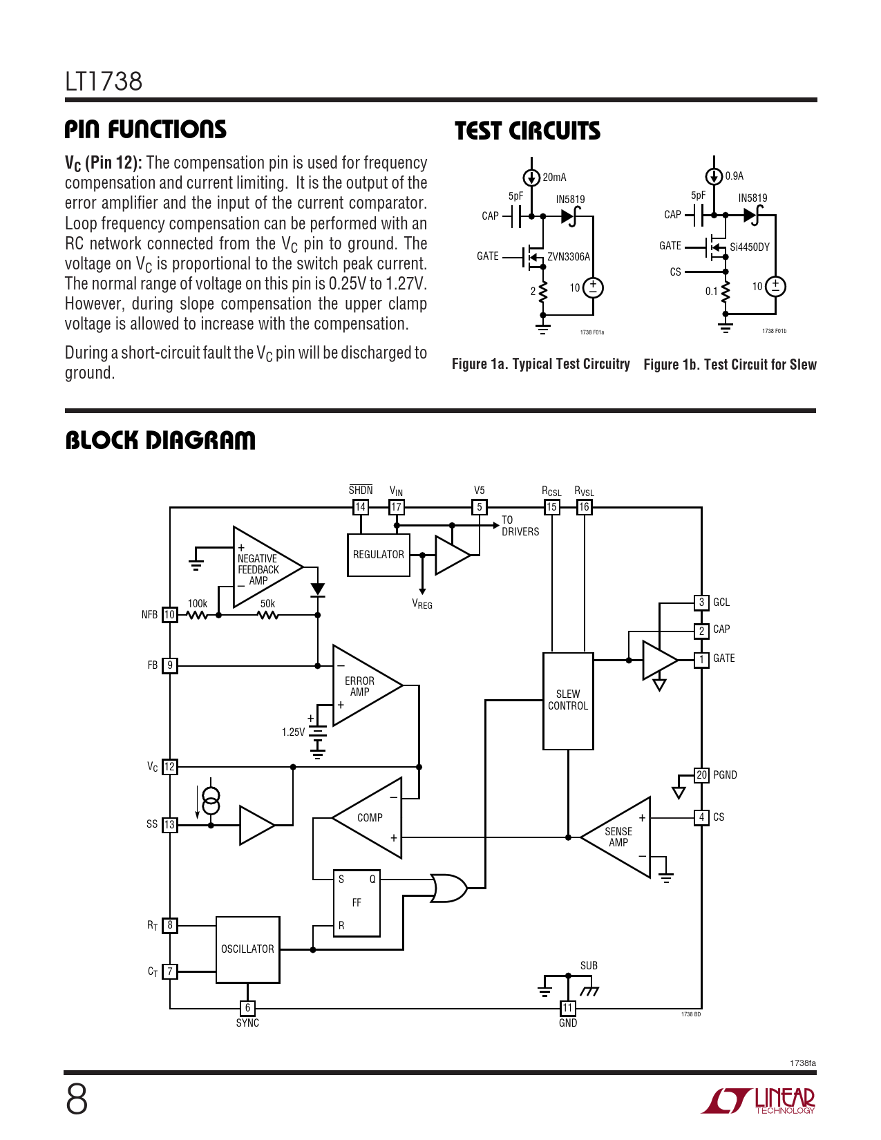 SHDN VIN V5 R R CSL VSL 14 17 5 15 16 TO DRIVERS + NEGATIVE REGULATOR FEEDBACK – AMP 100k 50k VREG 3 GCL NFB 10 2 CAP – 1 GATE FB 9 ERROR AMP SLEW + CONTROL + 1.25V VC 12 20 PGND – COMP + 4 CS SS 13 + SENSE AMP – S Q FF RT 8 R OSCILLATOR SUB CT 7 6 11 1738 BD SYNC GND 1738fa 8