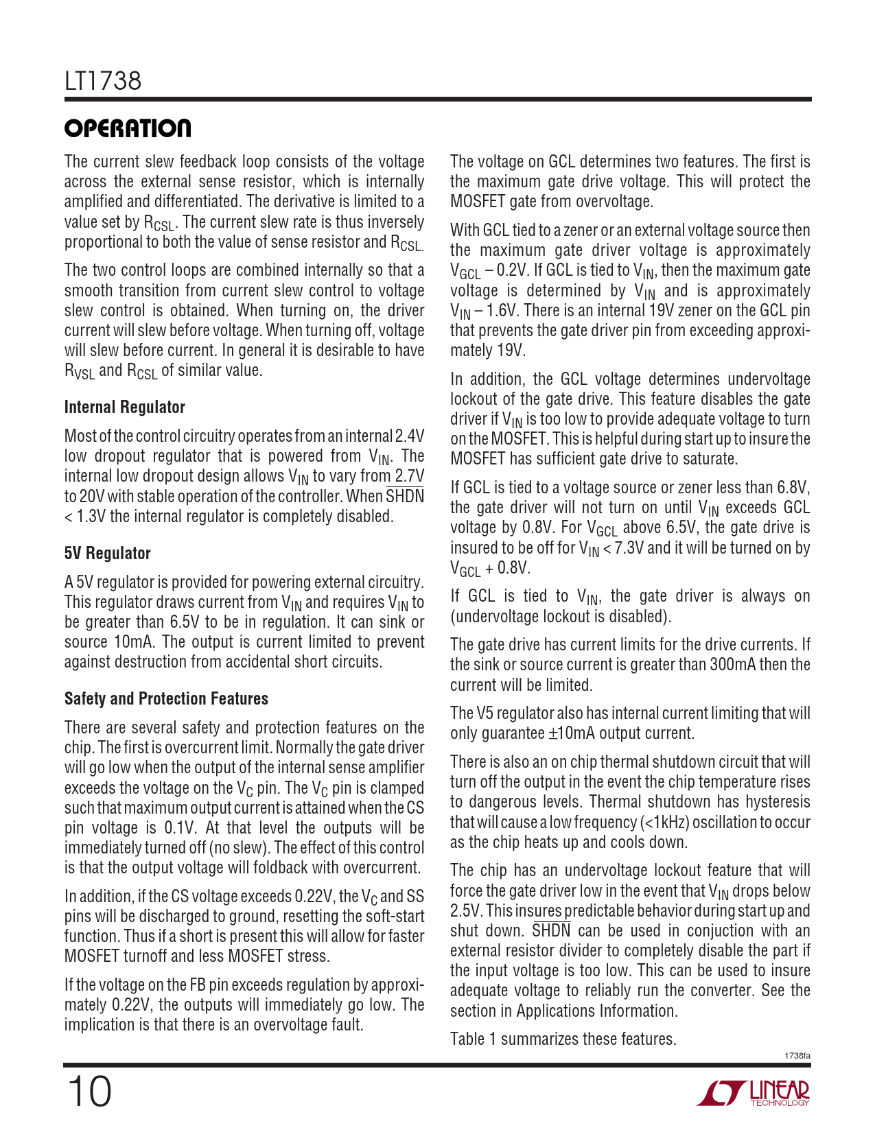 LT1738 UOPERATIO The current slew feedback loop consists of the voltage The voltage on GCL determines two features. The first is across the external sense resistor, which is internally the maximum gate drive voltage. This will protect the amplified and differentiated. The derivative is limited to a MOSFET gate from overvoltage. value set by RCSL. The current slew rate is thus inversely With GCL tied to a zener or an external voltage source then proportional to both the value of sense resistor and RCSL. the maximum gate driver voltage is approximately The two control loops are combined internally so that a VGCL␣ – 0.2V. If GCL is tied to VIN, then the maximum gate smooth transition from current slew control to voltage voltage is determined by VIN and is approximately slew control is obtained. When turning on, the driver VIN – 1.6V. There is an internal 19V zener on the GCL pin current will slew before voltage. When turning off, voltage that prevents the gate driver pin from exceeding approxi- will slew before current. In general it is desirable to have mately 19V. RVSL and RCSL of similar value. In addition, the GCL voltage determines undervoltage lockout of the gate drive. This feature disables the gate Internal Regulator driver if VIN is too low to provide adequate voltage to turn Most of the control circuitry operates from an internal 2.4V on the MOSFET. This is helpful during start up to insure the low dropout regulator that is powered from VIN. The MOSFET has sufficient gate drive to saturate. internal low dropout design allows VIN to vary from 2.7V If GCL is tied to a voltage source or zener less than 6.8V, to 20V with stable operation of the controller. When SHDN the gate driver will not turn on until V < 1.3V the internal regulator is completely disabled. IN exceeds GCL voltage by 0.8V. For VGCL above 6.5V, the gate drive is 5V Regulator insured to be off for VIN < 7.3V and it will be turned on by VGCL + 0.8V. A 5V regulator is provided for powering external circuitry. This regulator draws current from V If GCL is tied to V IN and requires VIN to IN, the gate driver is always on be greater than 6.5V to be in regulation. It can sink or (undervoltage lockout is disabled). source 10mA. The output is current limited to prevent The gate drive has current limits for the drive currents. If against destruction from accidental short circuits. the sink or source current is greater than 300mA then the current will be limited. Safety and Protection Features The V5 regulator also has internal current limiting that will There are several safety and protection features on the only guarantee ±10mA output current. chip. The first is overcurrent limit. Normally the gate driver will go low when the output of the internal sense amplifier There is also an on chip thermal shutdown circuit that will exceeds the voltage on the V turn off the output in the event the chip temperature rises C pin. The VC pin is clamped such that maximum output current is attained when the CS to dangerous levels. Thermal shutdown has hysteresis pin voltage is 0.1V. At that level the outputs will be that will cause a low frequency (<1kHz) oscillation to occur immediately turned off (no slew). The effect of this control as the chip heats up and cools down. is that the output voltage will foldback with overcurrent. The chip has an undervoltage lockout feature that will In addition, if the CS voltage exceeds 0.22V, the V force the gate driver low in the event that V C and SS IN drops below pins will be discharged to ground, resetting the soft-start 2.5V. This insures predictable behavior during start up and function. Thus if a short is present this will allow for faster shut down. SHDN can be used in conjuction with an MOSFET turnoff and less MOSFET stress. external resistor divider to completely disable the part if the input voltage is too low. This can be used to insure If the voltage on the FB pin exceeds regulation by approxi- adequate voltage to reliably run the converter. See the mately 0.22V, the outputs will immediately go low. The section in Applications Information. implication is that there is an overvoltage fault. Table 1 summarizes these features. 1738fa 10