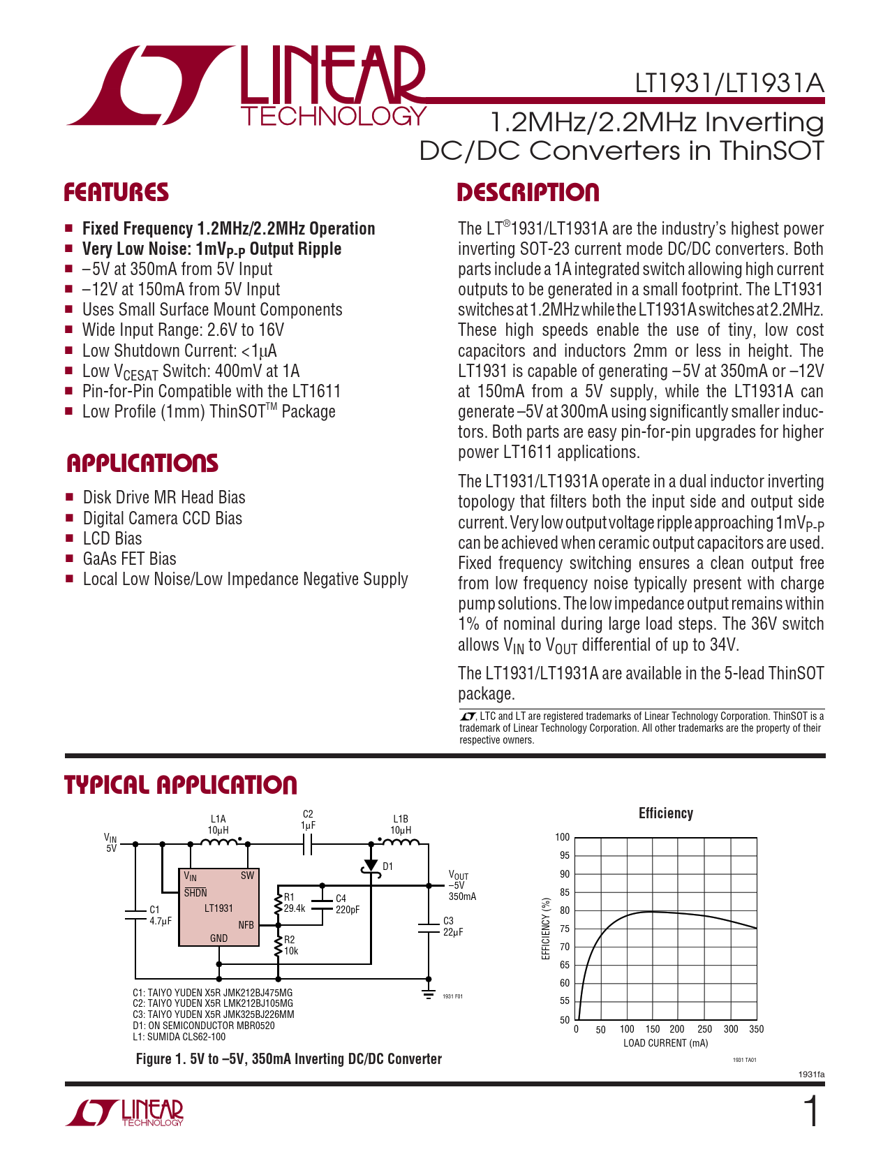 LT1931/LT1931A 1.2MHz/2.2MHz Inverting DC/DC Converters in ThinSOT UFEATURESDESCRIPTIO ■ Fixed Frequency 1.2MHz/2.2MHz Operation The LT®1931/LT1931A are the industry’s highest power ■ Very Low Noise: 1mVP-P Output Ripple inverting SOT-23 current mode DC/DC converters. Both ■ – 5V at 350mA from 5V Input parts include a 1A integrated switch allowing high current ■ –12V at 150mA from 5V Input outputs to be generated in a small footprint. The LT1931 ■ Uses Small Surface Mount Components switches at 1.2MHz while the LT1931A switches at 2.2MHz. ■ Wide Input Range: 2.6V to 16V These high speeds enable the use of tiny, low cost ■ Low Shutdown Current: <1µA capacitors and inductors 2mm or less in height. The ■ Low VCESAT Switch: 400mV at 1A LT1931 is capable of generating – 5V at 350mA or –12V ■ Pin-for-Pin Compatible with the LT1611 at 150mA from a 5V supply, while the LT1931A can ■ Low Profile (1mm) ThinSOTTM Package generate –5V at 300mA using significantly smaller induc- tors. Both parts are easy pin-for-pin upgrades for higher U power LT1611 applications. APPLICATIO S The LT1931/LT1931A operate in a dual inductor inverting ■ Disk Drive MR Head Bias topology that filters both the input side and output side ■ Digital Camera CCD Bias current. Very low output voltage ripple approaching 1mVP-P ■ LCD Bias can be achieved when ceramic output capacitors are used. ■ GaAs FET Bias Fixed frequency switching ensures a clean output free ■ Local Low Noise/Low Impedance Negative Supply from low frequency noise typically present with charge pump solutions. The low impedance output remains within 1% of nominal during large load steps. The 36V switch allows VIN to VOUT differential of up to 34V. The LT1931/LT1931A are available in the 5-lead ThinSOT package. , LTC and LT are registered trademarks of Linear Technology Corporation. ThinSOT is a trademark of Linear Technology Corporation. All other trademarks are the property of their respective owners. UTYPICAL APPLICATIO C2 Efficiency L1A L1B 1µF 10µH 10µH VIN 100 5V 95 D1 V 90 IN SW VOUT –5V SHDN 85 R1 350mA C4 C1 LT1931 29.4k 220pF 80 4.7µF C3 NFB 22µF 75 GND R2 10k 70 EFFICIENCY (%) 65 60 C1: TAIYO YUDEN X5R JMK212BJ475MG 1931 F01 C2: TAIYO YUDEN X5R LMK212BJ105MG 55 C3: TAIYO YUDEN X5R JMK325BJ226MM 50 D1: ON SEMICONDUCTOR MBR0520 0 50 100 150 200 250 300 350 L1: SUMIDA CLS62-100 LOAD CURRENT (mA) Figure 1. 5V to –5V, 350mA Inverting DC/DC Converter 1931 TA01 1931fa 1