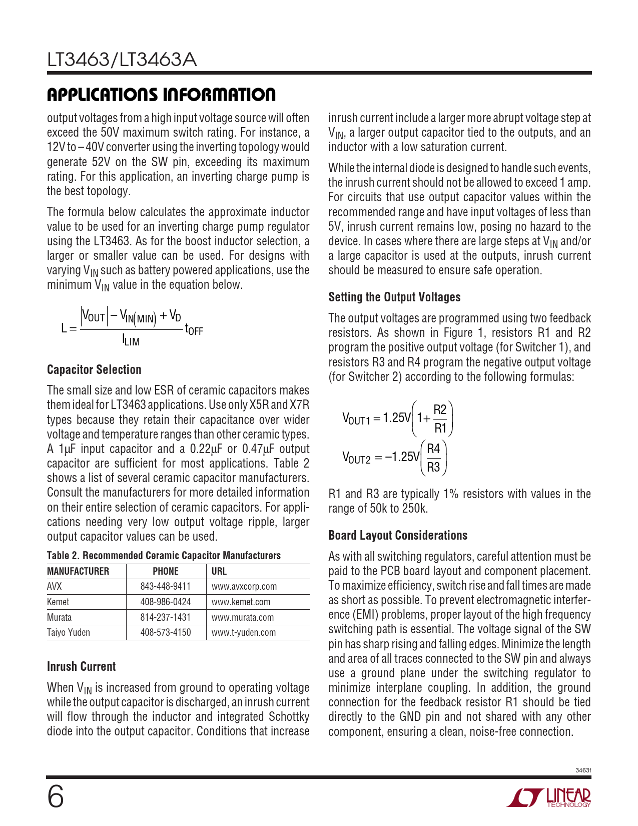 (for Switcher 2) according to the following formulas: The small size and low ESR of ceramic capacitors makes them ideal for LT3463 applications. Use only X5R and X7R  R2 types because they retain their capacitance over wider V = 1 2 . V OUT1 5 1+  R1 voltage and temperature ranges than other ceramic types. A 1µF input capacitor and a 0.22µF or 0.47µF output R4 V = 1 – 2 . V OUT2 5 capacitor are sufficient for most applications. Table 2 R3 shows a list of several ceramic capacitor manufacturers. Consult the manufacturers for more detailed information R1 and R3 are typically 1% resistors with values in the on their entire selection of ceramic capacitors. For appli- range of 50k to 250k. cations needing very low output voltage ripple, larger output capacitor values can be used.