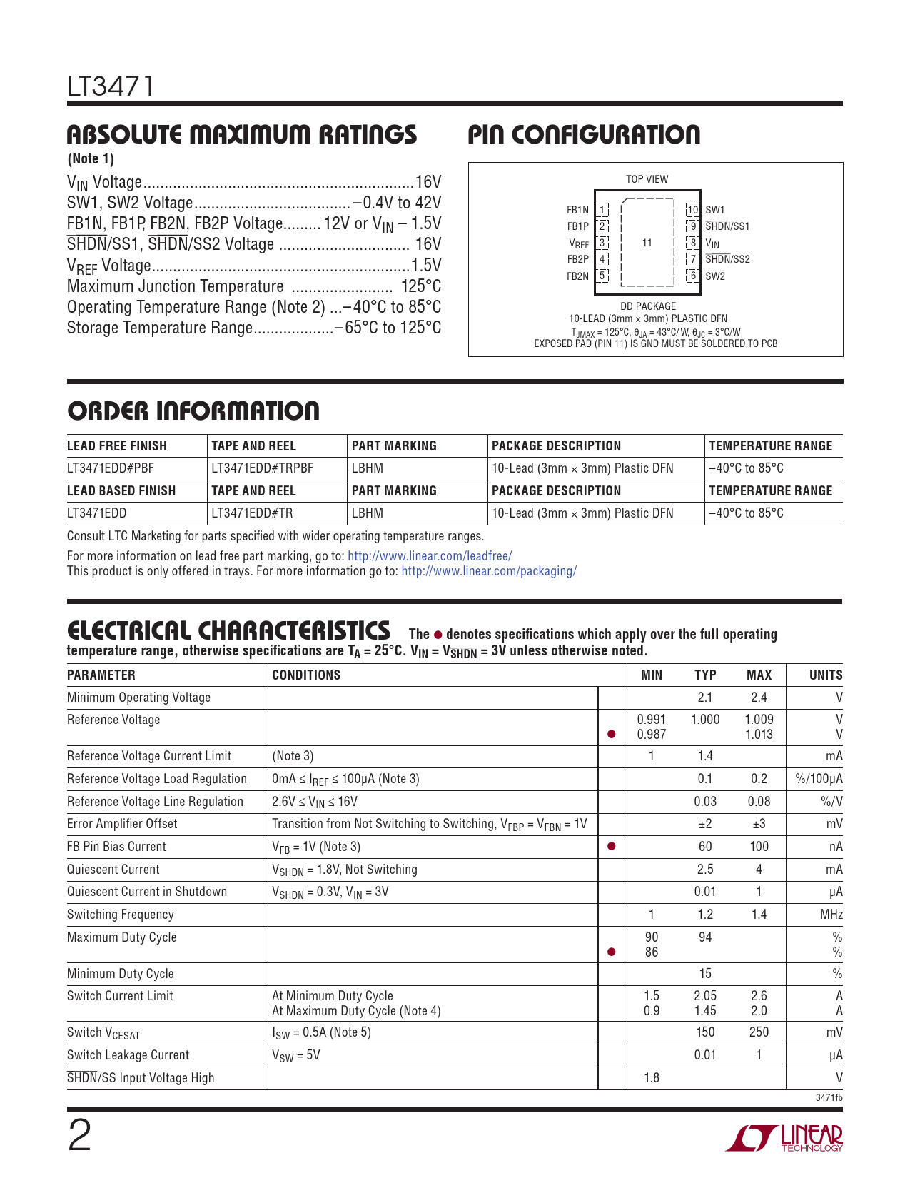 LT3471EDD LT3471EDD#TR LBHM 10-Lead (3mm × 3mm) Plastic DFN –40°C to 85°C Consult LTC Marketing for parts specifi ed with wider operating temperature ranges. For more information on lead free part marking, go to: http://www.linear.com/leadfree/ This product is only offered in trays. For more information go to: http://www.linear.com/packaging/