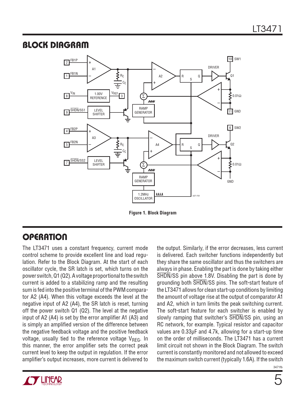 LT3471 BLOCK DIAGRAM 10 SW1 FB1P 2 + – DRIVER A1 FB1N 1 – RC A2 R Q Q1 + S CC + VIN 1.00V VREF 8 3 0.01Ω ∑ REFERENCE – SHDN/SS1 RAMP LEVEL 9 GENERATOR 11 GND SHIFTER 6 SW2 FB2P 4 + – DRIVER A3 FB2N 5 – RC A4 R Q Q2 + S CC + SHDN/SS2 LEVEL 7 SHIFTER 0.01Ω ∑ – RAMP GENERATOR GND 1.2MHz 3471 F01 OSCILLATOR Figure 1. Block DiagramOPERATION The LT3471 uses a constant frequency, current mode the output. Similarly, if the error decreases, less current control scheme to provide excellent line and load regu- is delivered. Each switcher functions independently but lation. Refer to the Block Diagram. At the start of each they share the same oscillator and thus the switchers are oscillator cycle, the SR latch is set, which turns on the always in phase. Enabling the part is done by taking either power switch, Q1 (Q2). A voltage proportional to the switch SHDN/SS pin above 1.8V. Disabling the part is done by current is added to a stabilizing ramp and the resulting grounding both SHDN/SS pins. The soft-start feature of sum is fed into the positive terminal of the PWM compara- the LT3471 allows for clean start-up conditions by limiting tor A2 (A4). When this voltage exceeds the level at the the amount of voltage rise at the output of comparator A1 negative input of A2 (A4), the SR latch is reset, turning and A2, which in turn limits the peak switching current. off the power switch Q1 (Q2). The level at the negative The soft-start feature for each switcher is enabled by input of A2 (A4) is set by the error amplifi er A1 (A3) and slowly ramping that switcher’s SHDN/SS pin, using an is simply an amplifi ed version of the difference between RC network, for example. Typical resistor and capacitor the negative feedback voltage and the positive feedback values are 0.33μF and 4.7k, allowing for a start-up time voltage, usually tied to the reference voltage VREG. In on the order of milliseconds. The LT3471 has a current this manner, the error amplifi er sets the correct peak limit circuit not shown in the Block Diagram. The switch current level to keep the output in regulation. If the error current is constantly monitored and not allowed to exceed amplifi er’s output increases, more current is delivered to the maximum switch current (typically 1.6A). If the switch 3471fb 5