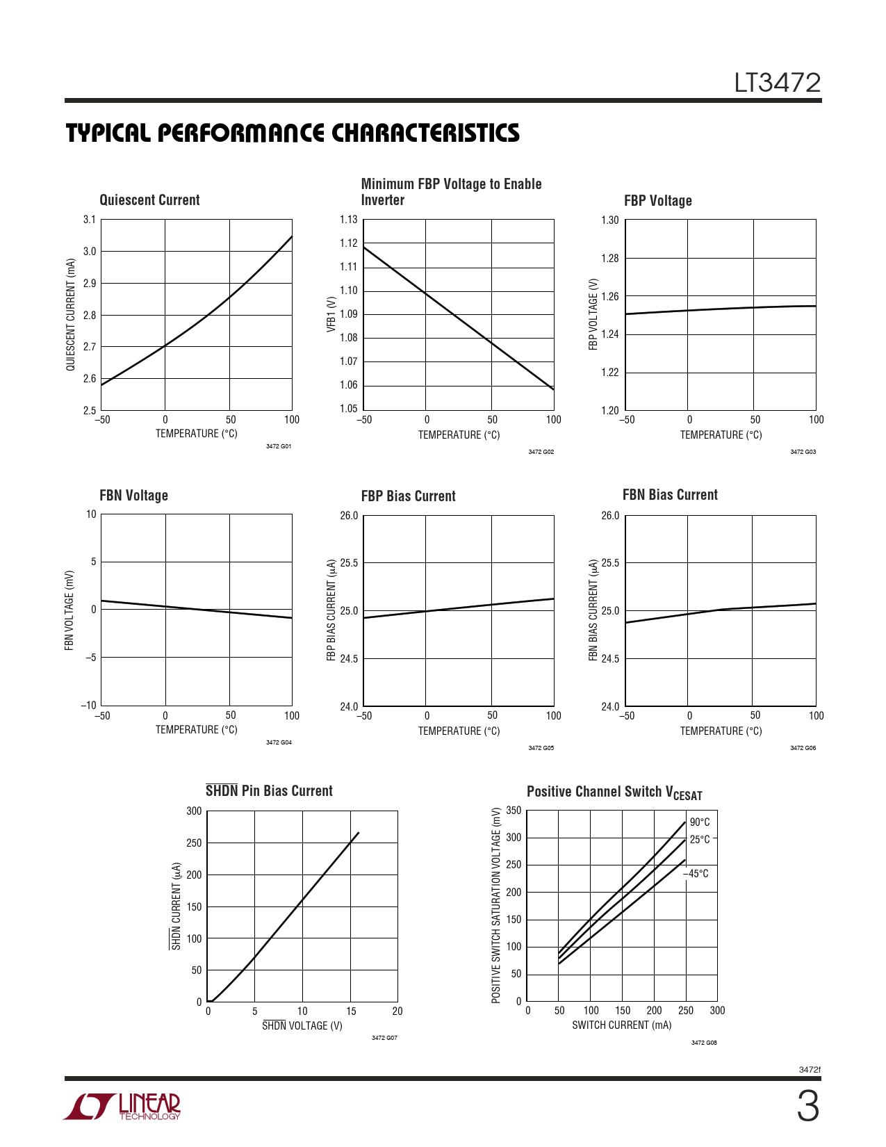10 26.0 26.0 5 A) 25.5 A) 25.5 µ µ 0 25.0 25.0 FBN VOLTAGE (mV) –5 FBP BIAS CURRENT ( 24.5 FBN BIAS CURRENT ( 24.5 –10 24.0 24.0 –50 0 50 100 –50 0 50 100 –50 0 50 100 TEMPERATURE (°C) TEMPERATURE (°C) TEMPERATURE (°C) 3472 G04 3472 G05 3472 G06