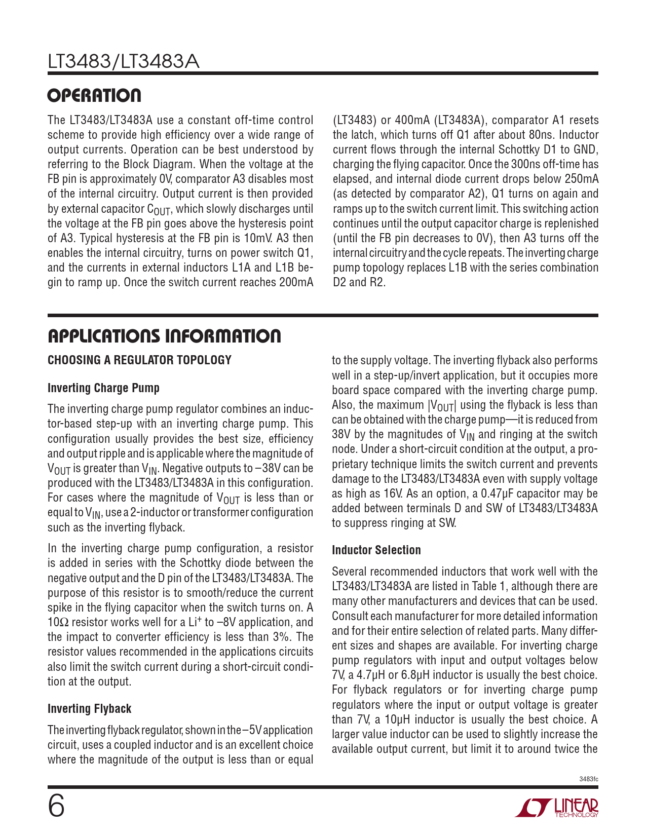 The LT3483/LT3483A use a constant off-time control (LT3483) or 400mA (LT3483A), comparator A1 resets scheme to provide high efficiency over a wide range of the latch, which turns off Q1 after about 80ns. Inductor output currents. Operation can be best understood by current flows through the internal Schottky D1 to GND, referring to the Block Diagram. When the voltage at the charging the flying capacitor. Once the 300ns off-time has FB pin is approximately 0V, comparator A3 disables most elapsed, and internal diode current drops below 250mA of the internal circuitry. Output current is then provided (as detected by comparator A2), Q1 turns on again and by external capacitor COUT, which slowly discharges until ramps up to the switch current limit. This switching action the voltage at the FB pin goes above the hysteresis point continues until the output capacitor charge is replenished of A3. Typical hysteresis at the FB pin is 10mV. A3 then (until the FB pin decreases to 0V), then A3 turns off the enables the internal circuitry, turns on power switch Q1, internal circuitry and the cycle repeats. The inverting charge and the currents in external inductors L1A and L1B be- pump topology replaces L1B with the series combination gin to ramp up. Once the switch current reaches 200mA D2 and R2.