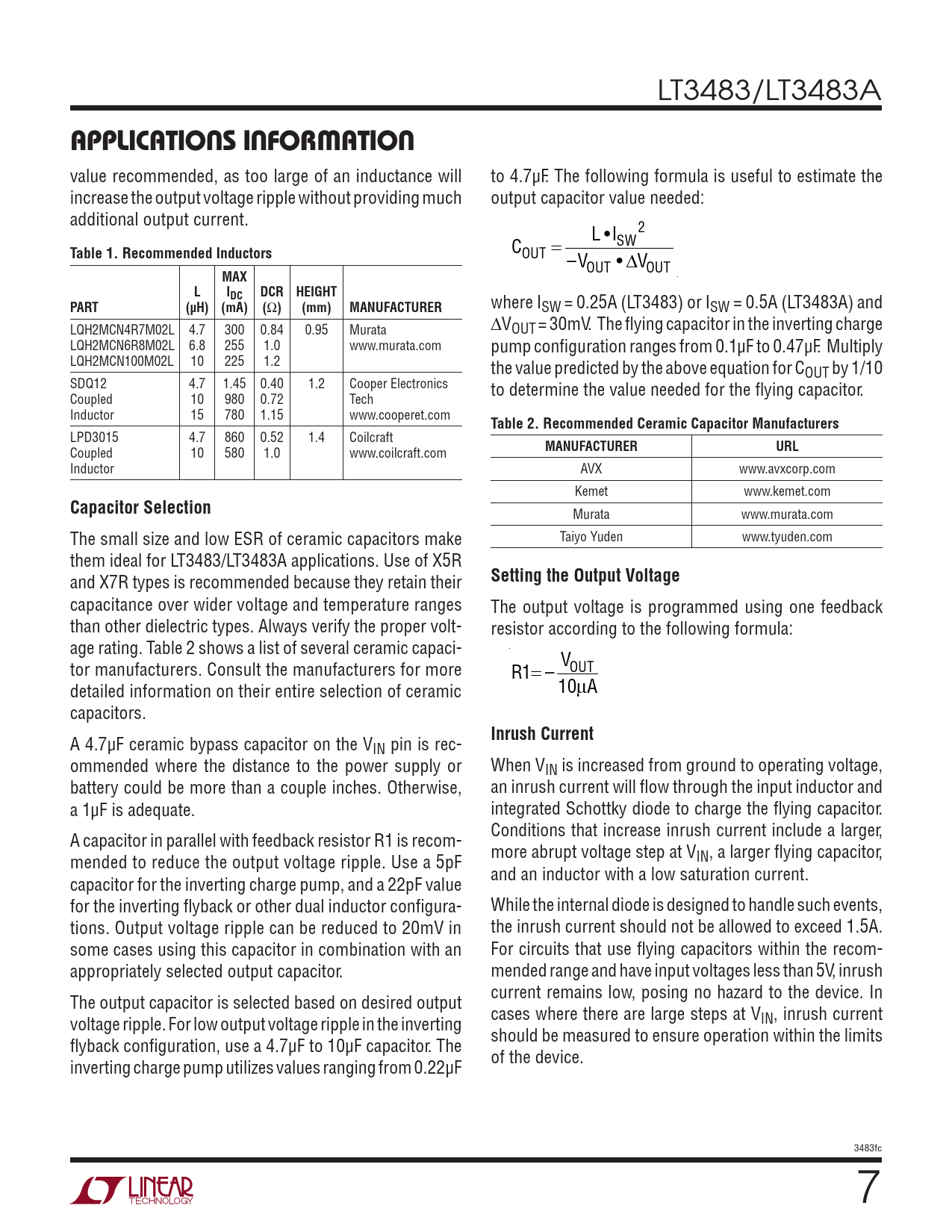 where ISW = 0.25A (LT3483) or ISW = 0.5A (LT3483A) and LQH2MCN4R7M02L 4.7 300 0.84 0.95 Murata ∆VOUT = 30mV. The flying capacitor in the inverting charge LQH2MCN6R8M02L 6.8 255 1.0 www.murata.com pump configuration ranges from 0.1µF to 0.47µF. Multiply LQH2MCN100M02L 10 225 1.2 the value predicted by the above equation for COUT by 1/10 SDQ12 4.7 1.45 0.40 1.2 Cooper Electronics to determine the value needed for the flying capacitor. Coupled 10 980 0.72 Tech Inductor 15 780 1.15 www.cooperet.com