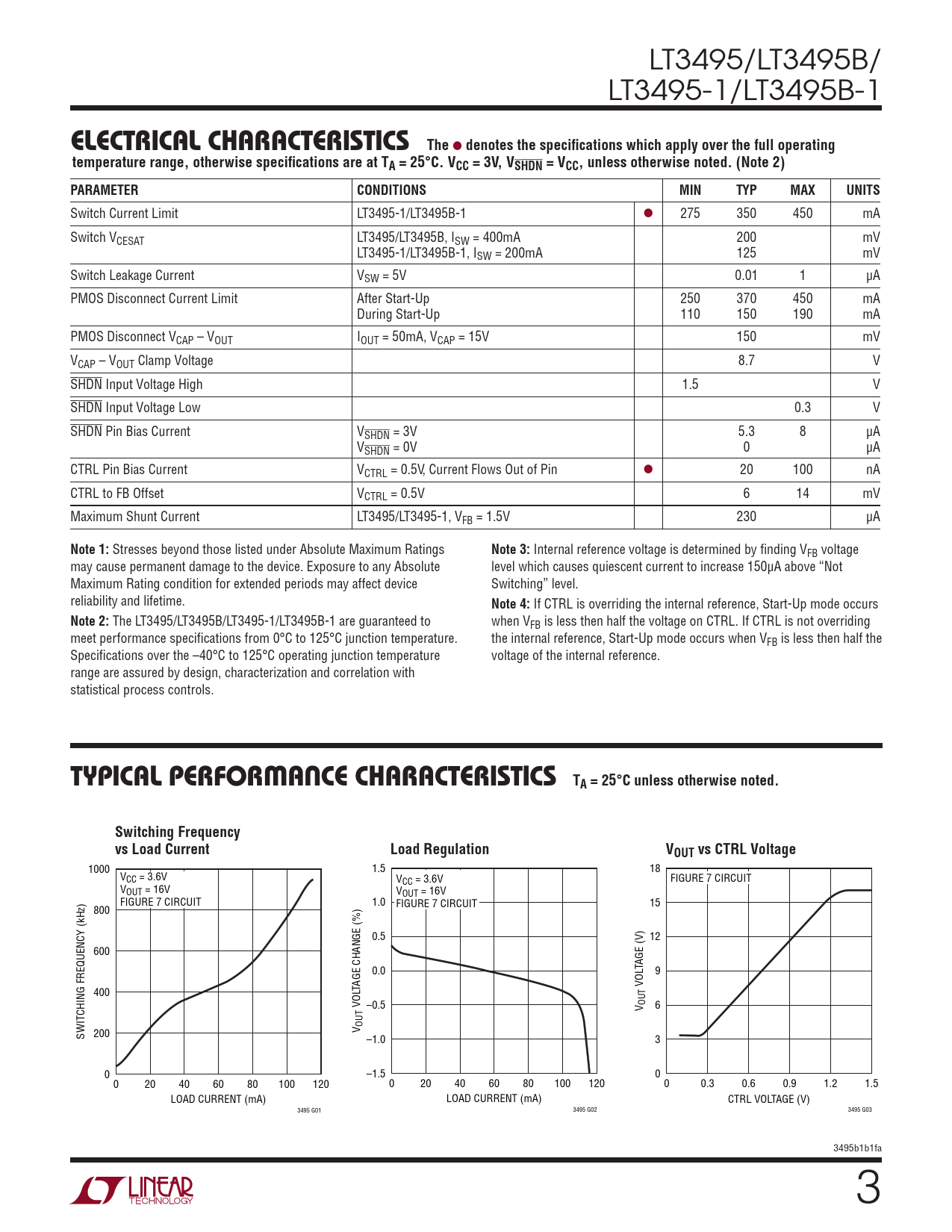 Switch Current Limit LT3495-1/LT3495B-1 l 275 350 450 mA Switch VCESAT LT3495/LT3495B, ISW = 400mA 200 mV LT3495-1/LT3495B-1, ISW = 200mA 125 mV Switch Leakage Current VSW = 5V 0.01 1 µA PMOS Disconnect Current Limit After Start-Up 250 370 450 mA During Start-Up 110 150 190 mA PMOS Disconnect VCAP – VOUT IOUT = 50mA, VCAP = 15V 150 mV VCAP – VOUT Clamp Voltage 8.7 V SHDN Input Voltage High 1.5 V SHDN Input Voltage Low 0.3 V SHDN Pin Bias Current VSHDN = 3V 5.3 8 µA VSHDN = 0V 0 µA CTRL Pin Bias Current VCTRL = 0.5V, Current Flows Out of Pin l 20 100 nA CTRL to FB Offset VCTRL = 0.5V 6 14 mV Maximum Shunt Current LT3495/LT3495-1, VFB = 1.5V 230 µA