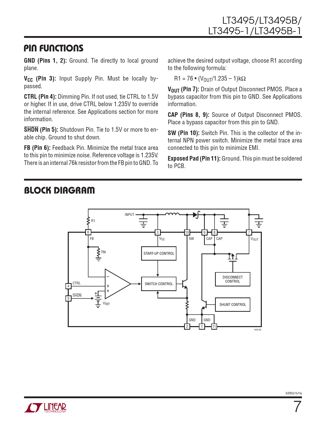 LT3495/LT3495B/ LT3495-1/LT3495B-1 PIN FUNCTIONSGND (Pins 1, 2): Ground. Tie directly to local ground achieve the desired output voltage, choose R1 according plane. to the following formula: VCC (Pin 3): Input Supply Pin. Must be locally by- R1 = 76 • (VOUT/1.235 – 1)kΩ passed. VOUT (Pin 7): Drain of Output Disconnect PMOS. Place a CTRL (Pin 4): Dimming Pin. If not used, tie CTRL to 1.5V bypass capacitor from this pin to GND. See Applications or higher. If in use, drive CTRL below 1.235V to override information. the internal reference. See Applications section for more CAP (Pins 8, 9): Source of Output Disconnect PMOS. information. Place a bypass capacitor from this pin to GND. SHDN (Pin 5): Shutdown Pin. Tie to 1.5V or more to en- SW (Pin 10): Switch Pin. This is the collector of the in- able chip. Ground to shut down. ternal NPN power switch. Minimize the metal trace area FB (Pin 6): Feedback Pin. Minimize the metal trace area connected to this pin to minimize EMI. to this pin to minimize noise. Reference voltage is 1.235V. Exposed Pad (Pin 11): Ground. This pin must be soldered There is an internal 76k resistor from the FB pin to GND. To to PCB. BLOCK DIAGRAM INPUT R1 6 3 10 9 8 7 FB VCC SW CAP CAP VOUT 76k START-UP CONTROL – DISCONNECT CTRL + CONTROL SWITCH CONTROL 4 + + SHDN 5 VREF SHUNT CONTROL GND GND 2 1 11 3495 BD 3495b1b1fa 7 Document Outline Features Description Applications Typical Application Absolute Maximum Ratings Pin Configuration Order Infomation Electrical Characteristics Typical Performance Characteristics Pin Functions Block Diagram Operation Applications Information Typical Applications Package Description Typical Application Related Parts