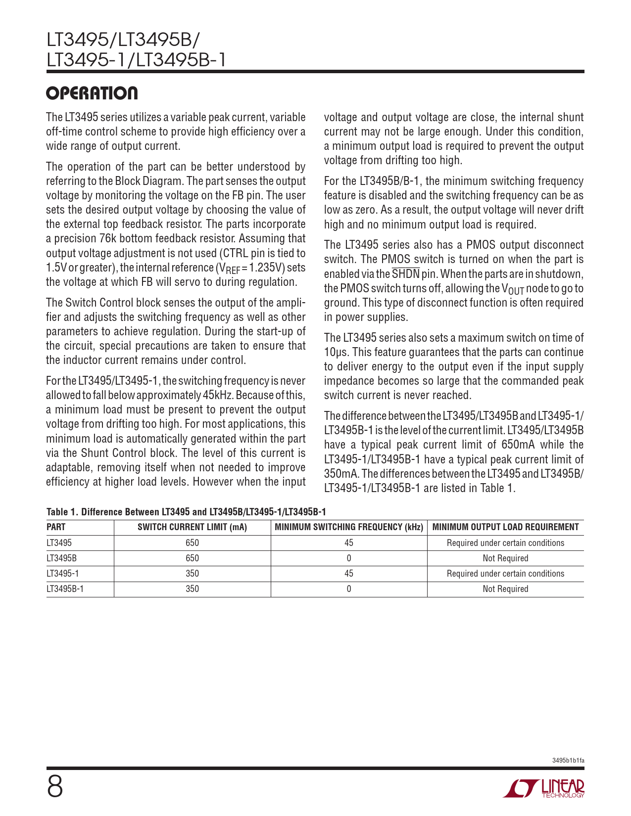 OPERATION. Table 1. Difference Between LT3495 and LT3495B/LT3495-1/LT3495B-1 PART. SWITCH CURRENT LIMIT (mA)