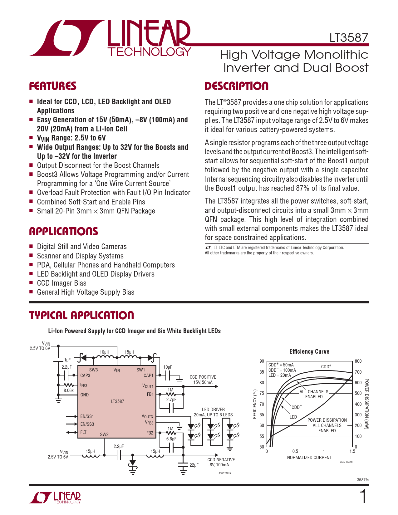 with small external components makes the LT3587 ideal for space constrained applications. n Digital Still and Video Cameras L, LT, LTC and LTM are registered trademarks of Linear Technology Corporation. All other trademarks are the property of their respective owners. n Scanner and Display Systems n PDA, Cellular Phones and Handheld Computers n LED Backlight and OLED Display Drivers n CCD Imager Bias n General High Voltage Supply Bias