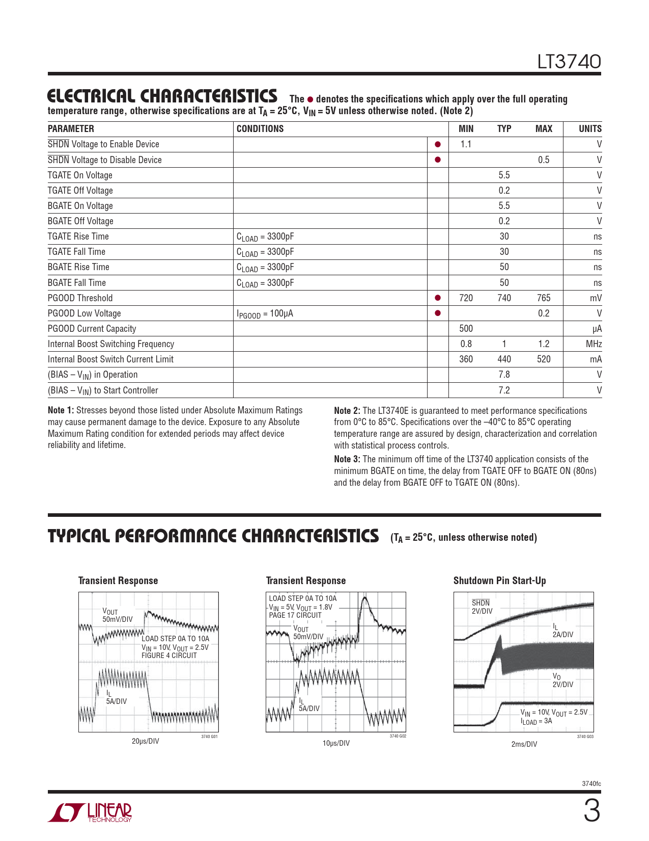 LT3740 ELECTRICAL CHARACTERISTICSThe l denotes the specifi cations which apply over the full operatingtemperature range, otherwise specifi cations are at TA = 25°C, VIN = 5V unless otherwise noted. (Note 2)PARAMETERCONDITIONSMINTYPMAXUNITS SHDN Voltage to Enable Device ● 1.1 V SHDN Voltage to Disable Device ● 0.5 V TGATE On Voltage 5.5 V TGATE Off Voltage 0.2 V BGATE On Voltage 5.5 V BGATE Off Voltage 0.2 V TGATE Rise Time CLOAD = 3300pF 30 ns TGATE Fall Time CLOAD = 3300pF 30 ns BGATE Rise Time CLOAD = 3300pF 50 ns BGATE Fall Time CLOAD = 3300pF 50 ns PGOOD Threshold ● 720 740 765 mV PGOOD Low Voltage IPGOOD = 100μA ● 0.2 V PGOOD Current Capacity 500 μA Internal Boost Switching Frequency 0.8 1 1.2 MHz Internal Boost Switch Current Limit 360 440 520 mA (BIAS – VIN) in Operation 7.8 V (BIAS – VIN) to Start Controller 7.2 V Note 1: Stresses beyond those listed under Absolute Maximum Ratings Note 2: The LT3740E is guaranteed to meet performance specifi cations may cause permanent damage to the device. Exposure to any Absolute from 0°C to 85°C. Specifi cations over the –40°C to 85°C operating Maximum Rating condition for extended periods may affect device temperature range are assured by design, characterization and correlation reliability and lifetime. with statistical process controls. Note 3: The minimum off time of the LT3740 application consists of the minimum BGATE on time, the delay from TGATE OFF to BGATE ON (80ns) and the delay from BGATE OFF to TGATE ON (80ns). TYPICAL PERFORMANCE CHARACTERISTICS (TA = 25°C, unless otherwise noted)Transient ResponseTransient ResponseShutdown Pin Start-Up LOAD STEP 0A TO 10A SHDN V V IN = 5V, VOUT = 1.8V OUT 2V/DIV PAGE 17 CIRCUIT 50mV/DIV V I OUT L 2A/DIV LOAD STEP 0A TO 10A 50mV/DIV VIN = 10V, VOUT = 2.5V FIGURE 4 CIRCUIT VO 2V/DIV IL 5A/DIV IL 5A/DIV VIN = 10V, VOUT = 2.5V ILOAD = 3A 3740 G01 3740 G02 3740 G03 20μs/DIV 10μs/DIV 2ms/DIV 3740fc 3
